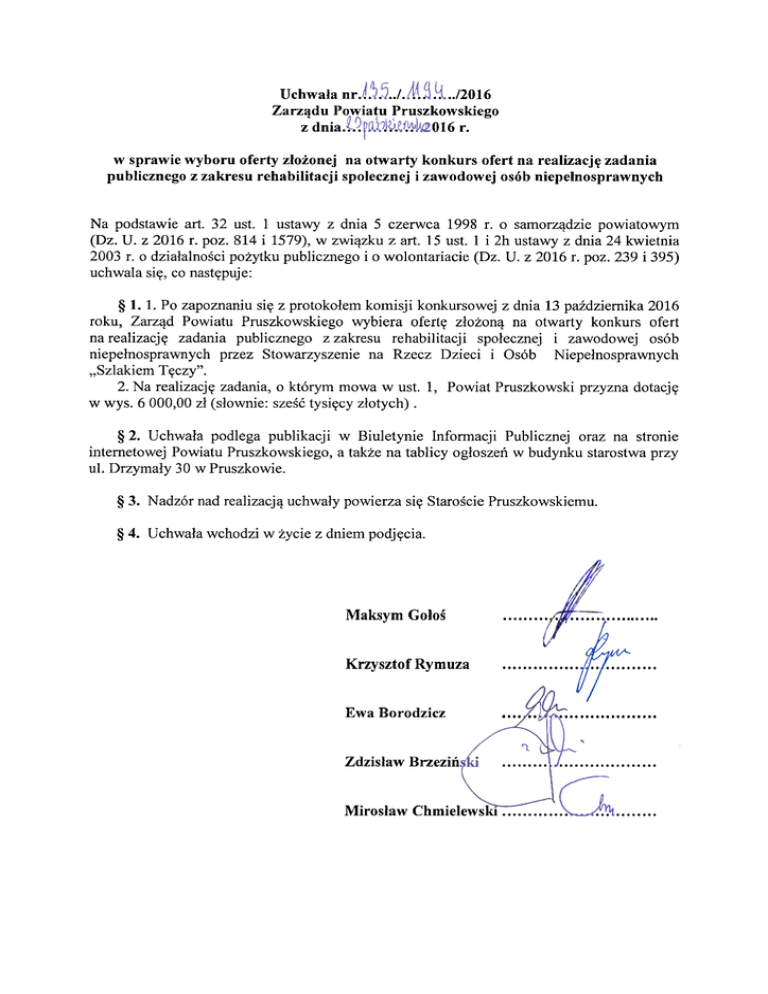 Uchwała nr.4$S.././445 J4.../2016 Zarządu PqXiatu Pruszkowskiego z dnia.Łl21)a.il)W.e(@l4a016 r. w sprawiewyboru oferty złożonej na otwarty konkurs ofert na realizacjęzadania publicznego z zakresu rehabilitacji spolecznej i zawodowej osób niepełnosprawnych Na podstawie art. 32 ust. l ustawy z dnia 5 czerwca 1998 r. o samorządziepowiatowym (Dz. U. z 2016 r. poz. 814 i 1579),w związkuz art. 15 ust. l i 2h ustawy z dnia 24 kwietnia 2003 r. o działalności pożytku publicznego i o wolontariacie (Dz. U. z 2016 r. poz. 239 i 395) uchwala się, co następuje: g 1. 1. Po zapoznaniu się z protokołem komigi konkursowej z dnia 13 paździemika 2016 roku, Zarząd Powiatu Pruszkowskiegowybiera ofertę złożoną na otwarty konkurs ofert na realizac:ję zadania publicznego z zakresu rehabilitac:ji społeczną i zawodowej osób niepełnosprawnych przez Stowarzyszenie na Rzecz Dzieci i Osób Niepełnosprawnych ,,Szlakiem Tęczy" 2. Na realizację zadania, o którym mowa w ust. 1, Powiat Pmszkowski przyzna dodac:ję w wys. 6 000,00 zł (słownie: sześćtysięcy złotych) g 2. Uchwała podlegapublikacji w Biuletynie Informaqi Publicznejoraz na stronie intemetowej Powiatu Pruszkowskiego, a także na tablicy ogłoszeń w budynku starostwa przy ul. Drzymały 30 w Pruszkowie. $ 3. Nadzór nad realizacją uchwały powierza się Staroście Pruszkowskiemu g 4. Uchwała wchodzi w życie z dniem podjęcia Maksym Gołoś Krzysztof Rymuza Ewa Borodzicz Zdzisław Brzeziń Mirosław Chmielewslii