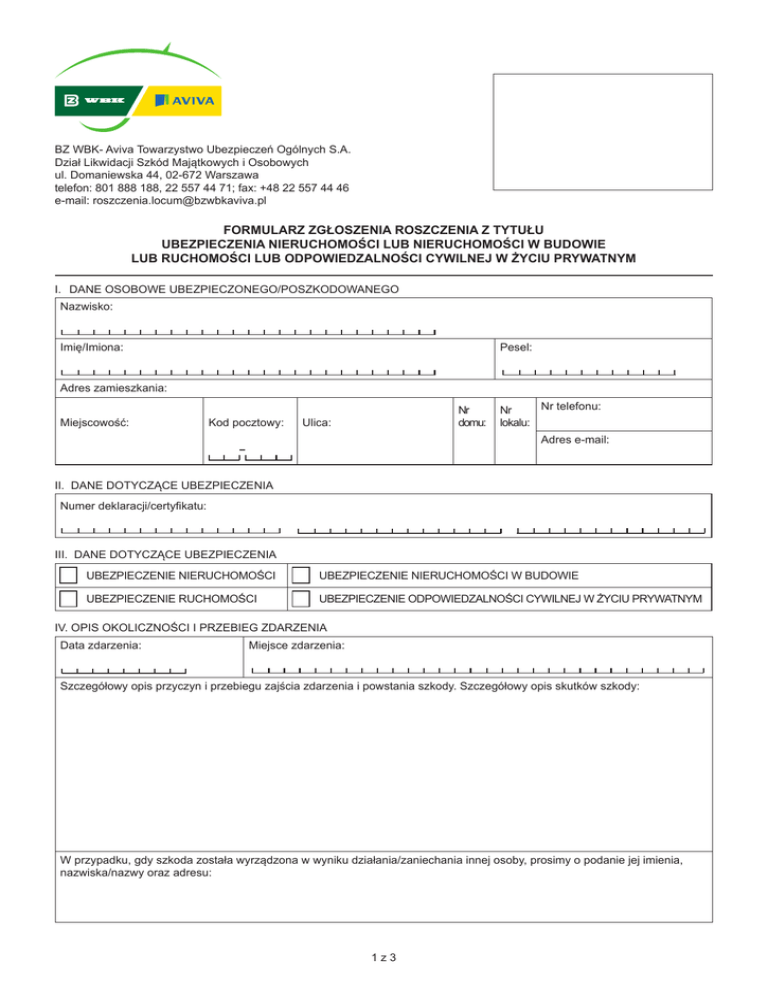 BZ WBK- Aviva Towarzystwo Ubezpieczeń Ogólnych S.A. Dział Likwidacji Szkód Majątkowych i Osobowych ul. Domaniewska 44, 02-672 Warszawa telefon: 801 888 188, 22 557 44 71; fax: +48 22 557 44 46 e-mail: [email protected] FORMULARZ ZGŁOSZENIA ROSZCZENIA Z TYTUŁU UBEZPIECZENIA NIERUCHOMOŚCI LUB NIERUCHOMOŚCI W BUDOWIE LUB RUCHOMOŚCI LUB ODPOWIEDZALNOŚCI CYWILNEJ W ŻYCIU PRYWATNYM I. DANE OSOBOWE UBEZPIECZONEGO/POSZKODOWANEGO Nazwisko: Imię/Imiona: Pesel: Adres zamieszkania: Miejscowość: Kod pocztowy: Nr domu: Ulica: Nr telefonu: Nr lokalu: Adres e-mail: II. DANE DOTYCZĄCE UBEZPIECZENIA Numer deklaracji/certyfikatu: III. DANE DOTYCZĄCE UBEZPIECZENIA UBEZPIECZENIE NIERUCHOMOŚCI UBEZPIECZENIE NIERUCHOMOŚCI W BUDOWIE UBEZPIECZENIE RUCHOMOŚCI UBEZPIECZENIE ODPOWIEDZALNOŚCI CYWILNEJ W ŻYCIU PRYWATNYM IV. OPIS OKOLICZNOŚCI I PRZEBIEG ZDARZENIA Data zdarzenia: Miejsce zdarzenia: Szczegółowy opis przyczyn i przebiegu zajścia zdarzenia i powstania szkody. Szczegółowy opis skutków szkody: W przypadku, gdy szkoda została wyrządzona w wyniku działania/zaniechania innej osoby, prosimy o podanie jej imienia, nazwiska/nazwy oraz adresu: 1z3 O powstaniu szkody powiadomiono (jeżeli tak, prosimy o podanie daty powiadomienia, adresu, numeru sprawy): Policję lub prokuraturę w dniu: adres: Straż pożarną w dniu: adres: Administrację budynku w dniu: adres: Inną instytucję w dniu: adres: nr sprawy: V. LISTA I OPIS USZKODZONYCH/UTRACONYCH PRZEDMIOTÓW (RUCHOMOŚCI DOMOWYCH) Nazwa przedmiotu/marka Ilość Data zakupu Wysokość roszczenia 1 2 3 4 5 6 7 8 9 10 VI. SPOSÓB USTALENIA WARTOŚCI SZKODY Wnioskuję o wyliczenie wartości według kosztorysu BZ WBK-Aviva Towarzystwo Ubezpieczeń Ogólnych S.A. Udokumentuję fakturami powykonawczymi, które zostaną zweryfikowane przez BZ WBK-Aviva Towarzystwo Ubezpieczeń Ogólnych S.A. Oświadczam, że opisane powyżej mienie w dacie zajścia zdarzenia było ubezpieczone tylko w BZ WBK-Aviva Towarzystwo Ubezpieczeń Ogólnych S.A. TAK NIE (jeżeli nie, prosimy o podanie nazwy i adresu drugiego ubezpieczyciela): Oświadczam, że z tytułu szkody powstałej w następstwie opisanego powyżej zdarzenia otrzymałam/em lub mogę otrzymać odszkodowanie od innego ubezpieczyciela TAK NIE (jeżeli tak, prosimy o podanie nazwy i adresu drugiego ubezpieczyciela) Oświadczam, że ze wskazanego powyżej ubezpieczenia dokonano przelewu praw – cesji TAK NIE (jeżeli tak, prosimy o podanie nazwy i adresu banku): VII. DO ZGŁOSZENIA SZKODY ZAŁĄCZAM DOKUMENTY dokument potwierdzający tytuł prawny do ubezpieczonego przedmiotu ubezpieczenia przeglądy instalacji elektrycznej, kominowej, innej oświadczenie administratora/ zarządcy budynku oświadczenia/ekspertyzy/opinie specjalistycznych zakładów serwisowych, usługowych, naprawczych dowody zakupu, karty gwarancyjne, instrukcje obsługi, dokumentacja zdjęciowa uszkodzonego/utraconego przedmiotu ubezpieczenia dokumenty ze staży pożarnej, policji, prokuratury, sądu, innych instytucji kosztorys ofertowy na wykonanie prac naprawczych szkody kopia deklaracji przystąpienia do ubezpieczenia inne (proszę wymienić pozostałe dokumenty załączone do formularza) rachunki, faktury dokumentujące poniesione koszty 2z3 VIII. POLECENIE WYPŁATY Jeśli świadczenie zostanie przyznane, proszę o przekazanie należnej kwoty: Przelewem na konto, numer: Dane posiadacza konta, jeżeli posiadacz wskazanego konta nie jest ubezpieczonym/poszkodowanym (imię, nazwisko/nazwa oraz adres): Przekazem Pocztowym na adres: Oświadczam, że: 1. Dane podane przeze mnie przy zgłoszeniu roszczenia, w tym zawarte w niniejszym formularzu są kompletne i prawdziwe. 2. Upoważniam BZ WBK-Aviva Towarzystwo Ubezpieczeń Ogólnych S.A. z siedzibą w Poznaniu oraz Aviva Sp. z o.o. z siedzibą w Warszawie do zasięgania informacji w innych zakładach ubezpieczeń i instytucjach zewnętrznych, np. policji, celem weryfikacji podanych przeze mnie danych oraz o innych okolicznościach związanych z ustaleniem prawa do odszkodowań i ich wysokości. Niniejsze upoważnienie jest nieodwołalne i nie wygasa w chwili mojej śmierci. 3. Wyrażam zgodę na przetwarzanie przez BZ WBK-Aviva Towarzystwo Ubezpieczeń Ogólnych S.A. z siedzibą w Poznaniu moich danych osobowych w rozumieniu ustawy z dnia 29 sierpnia 1997 r. o ochronie danych osobowych (tekst jednolity: Dz.U. z 2002 r. Nr 101, poz. 926, z późn. zm.) zawartych w przedstawionych przeze mnie dokumentach w celu przeprowadzenia postępowania likwidacyjnego. 4. Zostałam/em poinformowany, że administratorem danych, w rozumieniu ustawy z dnia 29 sierpnia 1997 r. o ochronie danych osobowych (tekst jednolity: Dz.U. z 2002 r. Nr 101, poz. 926, z późn. zm.) jest BZ WBK-Aviva Towarzystwo Ubezpieczeń Ogólnych S.A. z siedzibą w Poznaniu. Zostałam/em również poinformowany o prawie wglądu do moich danych i ich poprawiania oraz o tym, że podanie powyższych danych jest dobrowolne. Ubezpieczyciel informuje, że: • podane przez Panią/Pana w niniejszym formularzu dane będą przetwarzane przez BZ WBK-Aviva Towarzystwo Ubezpieczeń na Ogólnych S.A. z siedzibą w Poznaniu i wykorzystywane w celu i zakresie niezbędnym do ustalenia prawa do świadczenia z ubezpieczenia wskazanego powyżej i wysokości tego świadczenia; • przysługuje Pani/Panu w każdym czasie prawo wniesienia sprzeciwu wobec przetwarzania Pani/Pana danych w celach marketingowych; • przysługuje Pani/Panu w każdym czasie prawo wglądu do swoich danych, ich poprawienia oraz wniesienia żądania zaprzestania przetwarzania Pani/Pana danych; podanie przez Panią/Pana danych osobowych jest dobrowolne, jednakże dane te są niezbędne do realizacji roszczenia. Czytelny podpis poszkodowanego z podaniem imienia i nazwiska: Data i miejsce złożenia podpisu przez poszkodowanego: *Oświadczam, że: Jestem współwłaścicielem ubezpieczonej nieruchomości i jestem upoważniona/y przez wszystkich pozostałych współwłaścici