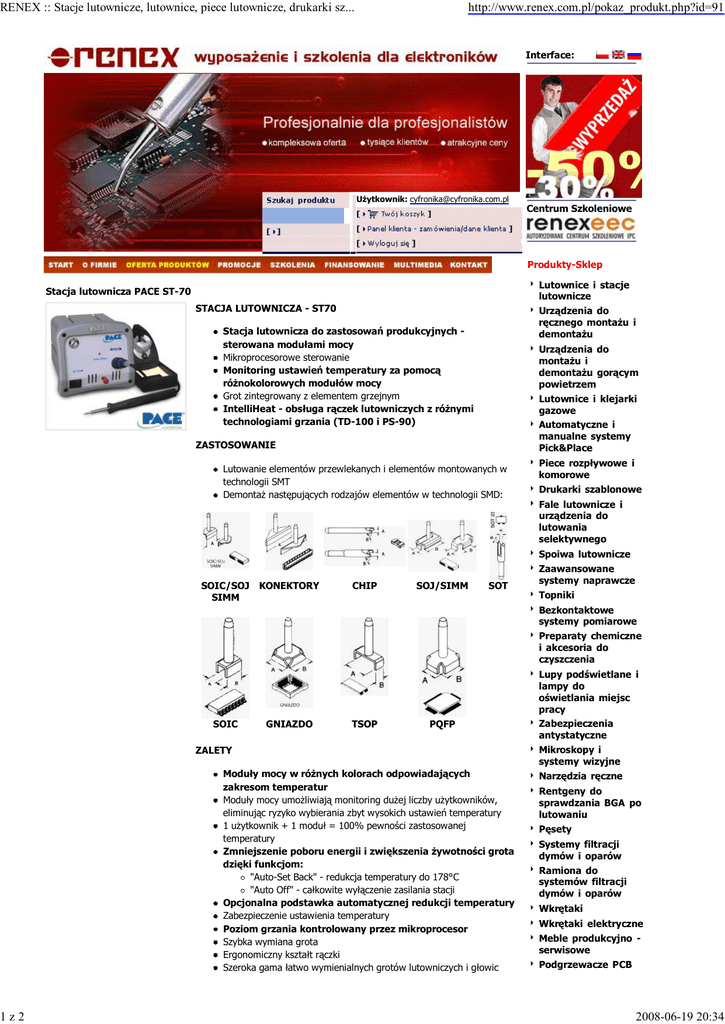 RENEX :: Stacje lutownicze, lutownice, piece lutownicze, drukarki sz... 1z2 http://www.renex.com.pl/pokaz_produkt.php?id=91 Interface: ytkownik: [email protected] Centrum Szkoleniowe Produkty-Sklep Lutownice i stacje lutownicze Stacja lutownicza PACE ST-70 STACJA LUTOWNICZA - ST70 Urz dzenia do cznego monta u i demonta u Stacja lutownicza do zastosowa produkcyjnych sterowana modu ami mocy Mikroprocesorowe sterowanie Monitoring ustawie temperatury za pomoc ró nokolorowych modu ów mocy Grot zintegrowany z elementem grzejnym IntelliHeat - obs uga r czek lutowniczych z ró nymi technologiami grzania (TD-100 i PS-90) Urz dzenia do monta u i demonta u gor cym powietrzem Lutownice i klejarki gazowe Automatyczne i manualne systemy Pick&Place ZASTOSOWANIE Lutowanie elementów przewlekanych i elementów montowanych w technologii SMT Demonta nast puj cych rodzajów elementów w technologii SMD: Piece rozp ywowe i komorowe Drukarki szablonowe Fale lutownicze i urz dzenia do lutowania selektywnego Spoiwa lutownicze SOIC/SOJ KONEKTORY SIMM CHIP SOJ/SIMM SOT Zaawansowane systemy naprawcze Topniki Bezkontaktowe systemy pomiarowe Preparaty chemiczne i akcesoria do czyszczenia SOIC GNIAZDO TSOP PQFP ZALETY Modu y mocy w ró nych kolorach odpowiadaj cych zakresom temperatur Modu y mocy umo liwiaj monitoring du ej liczby u ytkowników, eliminuj c ryzyko wybierania zbyt wysokich ustawie temperatury 1 u ytkownik + 1 modu = 100% pewno ci zastosowanej temperatury Zmniejszenie poboru energii i zwi kszenia ywotno ci grota dzi ki funkcjom: "Auto-Set Back" - redukcja temperatury do 178°C "Auto Off" - ca kowite wy czenie zasilania stacji Opcjonalna podstawka automatycznej redukcji temperatury Zabezpieczenie ustawienia temperatury Poziom grzania kontrolowany przez mikroprocesor Szybka wymiana grota Ergonomiczny kszta t r czki Szeroka gama atwo wymienialnych grotów lutowniczych i g owic Lupy pod wietlane i lampy do wietlania miejsc pracy Zabezpieczenia antystatyczne Mikroskopy i systemy wizyjne Narz dzia r czne Rentgeny do sprawdzania BGA po lutowaniu sety Systemy filtracji dymów i oparów Ramiona do systemów filtracji dymów i oparów Wkr taki Wkr taki elektryczne Meble produkcyjno serwisowe Podgrzewacze PCB 2008-06-19 20:34 RENEX :: Stacje lutownicze, lutownice, piece lutownicze, drukarki sz... 2z2 http://www.renex.com.pl/pokaz_produkt.php?id=91 Urz dzenia specjalistyczne demonta owych (ponad 200) TECHNOLOGIA INTELLIHEAT Tygle lutownicze W swych najnowszych stacjach lutownicznych PACE wykorzysta nowatorski system IntelliHeat jedyny system kontroli termicznej umo liwiaj cy zarz dzanie r czkami z ró nymi technologiami grzania. U ytkownik zyskuje, wi c mo liwo pracy z tradycyjnymi r czkami PACE (np.:PS-90) oraz r czkami, które obs uguj groty ze zintegrowanym grzejnikiem (np.:TD-100). Rozwi zanie to eliminuje konieczno posiadania kilku stacji lutowniczych lub korzystania wy cznie z jednej technologii grzania. Podajniki drutu lutowniczego i dyspensery pasty/kleju Myjki ultrad wi kowe DANE TECHNICZNE Stacja zasilaj ca ST-70 czka lutownicza TD-100 Podstawka pod r czk Modu y mocy o warto ci: 6.6; 7; 7.5 Testery i urz dzenia kontrolno-pomiarowe Akcesoria Zasilanie: 230V 50Hz Pobór mocy: max. 80W Wymiary zasilacza: 104x130x152mm Temperatura pracy: dla r czek z grotem zintegrowanym z grzejnikiem (np.TD-100): 205°C - 454°C dla r czek standardowych (np.PS-90): 176°C - 482°C Wska nik stanu pracy - dioda LED Rezystancja grota / uziemnienie >2 Mo liwo kalibracji Wyposa enie standardowe Ramy do monta u elementów przewlekanych Prenumerata biuletynu Adres e-mail Prenumeruj Katalog Renex 2007 Wyposa enie opcjonalne Modu y mocy Groty do r czki Katalog i jego dystrybucja TD-100 bezp atne - prosimy jedynie o wype nienie owice do r czki odpowiedniego TD-100 formularza. czka lutownicza Pobierz PDF PS-90 Kontakt Groty do r czki PS-90 tel.: +48 54 231-10-05 owice do r czki +48 54 411-25-55 PS-90 fax:.+48 54 411-25-56 czka TT-65 email: Ko cówki do r czki [email protected] Al. Kazimierza Wielkiego 6E TT-65 czka demonta owa 87-800 W oc awek Polska MT-100 Ko cówki do r czki MT-100 Podajnik drutu lutowniczego Miernik temperatury grota Preparaty chemiczne do czyszczenia Spoiwa lutownicze Topniki Akcesoria do r czek, owic i grotów Contact the Webmaster 2008-06-19 20:34