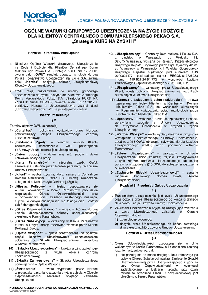 OGÓLNE WARUNKI GRUPOWEGO UBEZPIECZENIA NA ŻYCIE I DOŻYCIE DLA KLIENTÓW CENTRALNEGO DOMU MAKLERSKIEGO PEKAO S.A. „Strategia KURS NA ZYSKI II” Rozdział 1: Postanowienia Ogólne §1 1. Niniejsze Ogólne Warunki Grupowego Ubezpieczenia na Życie i Dożycie dla Klientów Centralnego Domu Maklerskiego Pekao S.A. „Strategia KURS NA ZYSKI II”, zwane dalej „OWU”, regulują zasady, na jakich Nordea Polska Towarzystwo Ubezpieczeń na Życie S.A. zwana dalej „Nordea”, obejmuje ochroną ubezpieczeniową Klientów Ubezpieczającego. 2. OWU mają zastosowanie do umowy grupowego ubezpieczenia na życie i dożycie dla Klientów Centralnego Domu Maklerskiego Pekao S.A. „Strategia KURS NA ZYSKI II” numer CDM002, zawartej w dniu 05.11.2012 r. pomiędzy Nordea a Ubezpieczającym, zwanej dalej „Umową Ubezpieczenia” i są jej integralną częścią. Rozdział 2: Definicje §2 Terminy użyte w OWU oznaczają: 1) „Certyfikat” - dokument wystawiony przez Nordea, potwierdzający objęcie Ubezpieczonego ochroną ubezpieczeniową; 2) „Deklaracja Zgody” – pisemny wniosek Klienta zawierający oświadczenie woli przystąpienia do Umowy Ubezpieczenia jako Ubezpieczony; 3) „Dzień roboczy” – dzień inny niż: sobota i dzień ustawowo wolny od pracy; 4) „Karta Parametrów” – integralna część OWU, zawierająca ustalone przez Nordea parametry techniczne Umowy Ubezpieczenia; 5) „Klient” – osoba fizyczna, która zawarła z Centralnym Domem Maklerskim Pekao S.A. Umowę świadczenia usług maklerskich i złożyła Deklarację Zgody; 6) „Miesiąc Polisowy” – miesiąc rozpoczynający się w dniu wskazanym w Karcie Parametrów jako dzień rozpoczęcia Okresu Odpowiedzialności oraz w odpowiednim dniu każdego następnego miesiąca, a jeżeli w danym miesiącu nie ma takiego dnia - ostatni dzień danego miesiąca; 7) „Okres Odpowiedzialności” – okres, w którym Nordea udziela Ubezpieczonemu ochrony ubezpieczeniowej, określony w Karcie Parametrów; 8) „Okres Subskrypcji” – określony w Karcie Parametrów termin, w którym istnieje możliwość złożenia przez Klienta Deklaracji Zgody; 9) „Opłata Wstępna” – opłata przeznaczona na pokrycie części kosztów administrowania ubezpieczeniem pobierana od Składki Ubezpieczeniowej, określona w Karcie Parametrów; 10) „Składka Ubezpieczeniowa” – kwota należna za jednego Ubezpieczonego z tytułu objęcia ochroną ubezpieczeniową; 11) „Składka Zainwestowana” – Składka Ubezpieczeniowa pomniejszona o Opłatę Wstępną; 12) „Świadczenie” – kwota wypłacana przez Nordea w przypadku uznania roszczenia z tytułu zajścia w Okresie Odpowiedzialności zdarzenia objętego Zakresem Ubezpieczenia; NORDEA POLSKA TOWARZYSTWO UBEZPIECZEŃ NA ŻYCIE S.A. UG/OWU/136001/11-2012/A 13) „Ubezpieczający” – Centralny Dom Maklerski Pekao S.A. z siedzibą w Warszawie, ul. Wołoska 18, 02-675 Warszawa, wpisana do Rejestru Przedsiębiorców Krajowego Rejestru Sądowego przez Sąd Rejonowy dla m. st. Warszawy w Warszawie, XIII Wydział Gospodarczy Krajowego Rejestru Sądowego pod numerem KRS 0000024477, posiadająca numer REGON 012725283 i numer NIP 521-26-54-772, o wysokości kapitału zakładowego i kapitału wpłaconego 56.331.898,00 zł; 14) „Ubezpieczony” – wskazany przez Ubezpieczającego Klient, objęty ochroną ubezpieczeniową na warunkach określonych w Umowie Ubezpieczenia; 15) „Umowa o świadczenie usług maklerskich” – umowa zawierana pomiędzy Klientem a Centralnym Domem Maklerskim Pekao S.A. na warunkach określonych w Regulaminie świadczenia usług maklerskich przez Centralny Dom Maklerski Pekao S.A. 16) „Uposażony” – wskazana przez Ubezpieczonego osoba, uprawniona, zgodnie z Umową Ubezpieczenia, do otrzymania Świadczenia w przypadku zgonu Ubezpieczonego; 17) „Wartość Wykupu” – kwota wypłaty należna w przypadku wystąpienia Ubezpieczonego z Umowy Ubezpieczenia, zgodnie z §13 OWU, obliczana indywidualnie dla każdego Ubezpieczonego według wzoru podanego w Karcie Parametrów; 18) „Zakres Ubezpieczenia” – wskazany w Umowie Ubezpieczenia zbiór zdarzeń; zajście któregokolwiek z tych zdarzeń uprawnia Ubezpieczonego lub osobę uprawnioną zgodnie z §10 OWU do zgłoszenia roszczenia o Świadczenie; 19) „Zapłacenie Składki Ubezpieczeniowej” – uznanie rachunku bankowego Nordea kwotą Składki Ubezpieczeniowej. Rozdział 3: Przedmiot i Zakres Ubezpieczenia §3 1. Przedmiotem ubezpieczenia jest życie Ubezpieczonego oraz dożycie przez Ubezpieczonego do końca ostatniego dnia okresu, na jaki zawarto Umowę Ubezpieczenia. 2. Zakresem Ubezpieczenia objęte są następujące zdarzenia w życiu Ubezpieczonego zaistniałe w Okresie Odpowiedzialności: 1) zgon Ubezpieczonego; 2) dożycie przez Ubezpieczonego do końca ostatniego dnia okresu, na który zawarto Umowę Ubezpieczenia. Rozdział 4: Okres Odpowiedzialności §4 1. Okres Odpowiedzialności rozpoczyna się w dniu wskazanym w Karcie Parametrów, o ile spełnione zostaną łącznie następujące warunki: 1) nie później niż do końca drugiego Dnia roboczego po upływie Okresu Subskrypcji nastąpi Zapłacenie Składki Ubezpieczeniowej przez Ubezpieczającego z góry za cały Okres Odpowiedzialności w wysokości zadeklarowanej w Deklaracji Zgody, przy czym minimalna wysokość Składki Ubezpieczeniowej jest określona w Karcie Parametrów; 1 2) w Okresie Subskrypcji nastąpi złożenie przez Klienta za pośrednictwem Ubezpieczającego prawidłowo wypełnionej i podpisanej Deklaracji Zgody, na formularzu Nordea, z zastrzeżeniem ust. 2 lub 3. 2. Warunkiem rozpoczęcia Okresu Odpowiedzialności w stosunku do wszystkich Klientów, którzy przystąpili do Umowy Ubezpieczenia w Okresie Subskrypcji jest osiągnięcie co najmniej wartości minimalnej wskaźnika partycypacji, o którym mowa w Karcie Parametrów. W razie nieosiągnięcia wskaźnika partycypacji w w/w wysokości, Klienci nie zostan