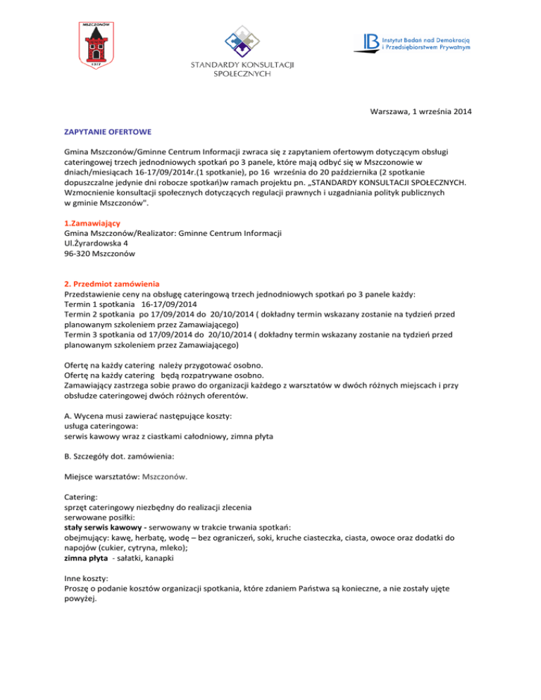 Warszawa, 1 września 2014 ZAPYTANIE OFERTOWE Gmina Mszczonów/Gminne Centrum Informacji zwraca się z zapytaniem ofertowym dotyczącym obsługi cateringowej trzech jednodniowych spotkań po 3 panele, które mają odbyć się w Mszczonowie w dniach/miesiącach 16-17/09/2014r.(1 spotkanie), po 16 września do 20 października (2 spotkanie dopuszczalne jedynie dni robocze spotkań)w ramach projektu pn. „STANDARDY KONSULTACJI SPOŁECZNYCH. Wzmocnienie konsultacji społecznych dotyczących regulacji prawnych i uzgadniania polityk publicznych w gminie Mszczonów". 1.Zamawiający Gmina Mszczonów/Realizator: Gminne Centrum Informacji Ul.Żyrardowska 4 96-320 Mszczonów 2. Przedmiot zamówienia Przedstawienie ceny na obsługę cateringową trzech jednodniowych spotkań po 3 panele każdy: Termin 1 spotkania 16-17/09/2014 Termin 2 spotkania po 17/09/2014 do 20/10/2014 ( dokładny termin wskazany zostanie na tydzień przed planowanym szkoleniem przez Zamawiającego) Termin 3 spotkania od 17/09/2014 do 20/10/2014 ( dokładny termin wskazany zostanie na tydzień przed planowanym szkoleniem przez Zamawiającego) Ofertę na każdy catering należy przygotować osobno. Ofertę na każdy catering będą rozpatrywane osobno. Zamawiający zastrzega sobie prawo do organizacji każdego z warsztatów w dwóch różnych miejscach i przy obsłudze cateringowej dwóch różnych oferentów. A. Wycena musi zawierać następujące koszty: usługa cateringowa: serwis kawowy wraz z ciastkami całodniowy, zimna płyta B. Szczegóły dot. zamówienia: Miejsce warsztatów: Mszczonów. Catering: sprzęt cateringowy niezbędny do realizacji zlecenia serwowane posiłki: stały serwis kawowy - serwowany w trakcie trwania spotkań: obejmujący: kawę, herbatę, wodę – bez ograniczeń, soki, kruche ciasteczka, ciasta, owoce oraz dodatki do napojów (cukier, cytryna, mleko); zimna płyta - sałatki, kanapki Inne koszty: Proszę o podanie kosztów organizacji spotkania, które zdaniem Państwa są konieczne, a nie zostały ujęte powyżej. 3. Koszt wykonania usługi: Koszty organizacji warsztatów przedstawione w FORMULARZU OFERTOWYM muszą być wykazane i muszą zawierać wszystkie elementy ujęte w niniejszej specyfikacji z uwzględnieniem punktu: Inne Koszty. 4. Cel wyceny: Wybór oferty na obsługę cateringową trzech jednodniowych spotkań po 3 sesje każda, które mają odbyć się w wyżej wskazanych terminach w ramach projektu pn. "STANDARDY KONSULTACJI SPOŁECZNYCH. Wzmocnienie konsultacji społecznych dotyczących regulacji prawnych i uzgadniania polityk publicznych w gminie Mszczonów". 5. Termin realizacji: Wymagany: od 16/09/2-14 do 20/10/2014 6. Sposób przygotowania oferty: Oferty prosimy przygotować w załączonych FORMULARZACH OFERTOWYCH Z uwzględnieniem warunków oferty, zawartych w punkcie: Przedmiot zamówienia, Koszt wykonania usługi oraz Termin realizacji oferty. 7. Kryterium wyboru oferty: Zachowanie wszystkich warunków określonych w pkt. Przedmiot zamówienia, Koszt wykonania usługi oraz Termin realizacji oferty. Miejsce spotkania – Mszczonów. Cena / miejsce. 8. Miejsce i termin złożenia oferty: Oferty prosimy przesyłać mailowo, faksem lub osobiście w siedzibie realizatora projektu Gminne Centrum Informacji (ul. Żyrardowska 4, 96-320 Mszczonów) lub przesłać faksem na nr: 46 857 11 99, e-mail: [email protected] w terminie do dnia 12/09/2014 r., do godz. 14:00. 9. Zapytania o przedmiot zamówienia: Dodatkowe Informacje dot. przedmiotu zamówienia, tel. /46/ 857 30 71, e-mail: [email protected]. 10. Załączniki: Formularz ofertowy Pieczęć firmowa oferenta miejscowość i data FORMULARZ OFERTOWY 1. Zamawiający: Gmina Mszczonów/Realizator: Gminne Centrum Informacji Ul.Żyrardowska 4 96-320 Mszczonów 2. Oferent: (proszę wpisać dane - nazwa oferenta, adres, tel. i faks, NIP: Nazwa: Adres: Tel.: Faks: E-mail: NIP: 3. Wycena zamówienia: W odpowiedzi na zapytanie ofertowe z dnia 1 września 2014 r. w sprawie obsługi cateringowej trzech jednodniowych szkoleń, które mają odbyć się w dniach od 17/09/2014 do 20/10/2014 w ramach projektu pn. "STANDARDY KONSULTACJI SPOŁECZNYCH. Wzmocnienie konsultacji społecznych dotyczących regulacji prawnych i uzgadniania polityk publicznych w gminie Mszczonów", zgodnie z warunkami podanymi w punktach Przedmiot zamówienia, koszt wykonania usługi oraz termin realizacji oferty zobowiązuję się wykonać przedmiotowe zadanie za następującą cenę: Spotkanie 1: 16-17/09/2014 Miejsce realizacji usługi (nazwa obiektu, adres, adres strony internetowej): Lp. Elementy oferty II Catering (20 os.): - serwis kawowy ciągły serwowany na Sali (godz.: 8:00 – 19:00) - zimna płyta Inne (wpisać jakie?) III Razem: Kwota brutto w PLN Forma płatności: Koszty w PLN brutto ŁĄCZNIE ZA 3 sesje Kwota w PLN Spotkanie 2: Miejsce realizacji usługi (nazwa obiektu, adres, adres strony internetowej): Lp. Elementy oferty II Catering (60 os.): - serwis kawowy ciągły serwowany na Sali (godz.: 8:00 – 19:00) - zimna płyta Inne (wpisać jakie?) III Koszty w PLN brutto ŁĄCZNIE ZA 3 sesje Razem: Kwota brutto w PLN Forma płatności: Kwota w PLN Spotkanie 3: Miejsce realizacji usługi (nazwa obiektu, adres, adres strony internetowej): Lp. Elementy oferty II Catering (100 os.): - serwis kawowy ciągły serwowany na Sali (godz.: 8:00 – 19:00) - zimna płyta Inne (wpisać jakie?) III Koszty w PLN brutto ŁĄCZNIE ZA 3 sesje Razem: Kwota brutto w PLN Forma płatności: Kwota w PLN 4. Termin realizacji zamówienia: zgodny z terminami spotkań 5. Załączniki: Koszty organizacji spotkania, które nie zostały ujęte powyżej. miejscowość i data /podpis i imienna pieczęć oferenta lub upoważnionego przedstawiciela oferenta/