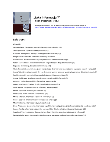 „Jaka informacja ?” Leon Dyczewski (red.) Publikacja dostępna jest w sklepie internetowym wydawnictwa KUL http://www.wydawnictwokul.lublin.pl/sklep/product_info.php?products_id=1287 Spis treści Wstęp (3) Iwona Hofman. Czy istnieje jeszcze informacja dziennikarska (11) Leon Dyczewski. Kryteria rzetelnej informacji (7) Stanisław Jędrzejewski. Newsy a narracyjna forma informacji (9) Małgorzata Żurakowska. Zależność informacji od źródeł Piotr Francuz. Psychospołeczne aspekty tworzenia i odbioru informacji (7) Robert Szwed. Proces produkcji informacji: od gatekeepera do public relations (21) Bogusław Nierenberg. Zarządzanie informacją (15) Maria Teresa Lizisowa. Informacja czy manipulacja. O stylistycznej akomodacji w wyrażaniu prawdy i fałszu (12) Janusz Włodzimierz Adamowski. Czy i na ile można wierzyć temu, co widzimy i słyszymy w dzisiejszych mediach? Skutki rzetelnej i nierzetelnej informacji dla jednostki i społeczeństwa (5) Ignacy Rutkiewicz. Aspekty etyczne (etyczne ograniczenia) informacji (5) Kazimierz Wolny‐Zmorzyński. Informacja w reportażu (7) Małgorzata Sławek‐Czochra. Graffiti jako źródło informacji (14) Jacek Dąbała. Intryga i napięcie w informacji telewizyjnej (6) Michał Gajlewicz. Informacja w reklamie (9) Aneta Duda. Public relations – informacja (10) Maciej Łętowski. Informacja o osobach publicznych (4) Joanna Gepfert. Rola informacji w społeczności lokalnej (4) Marek Pytko, ks. Informacja w życiu Kościoła (12) Elena Wilczewska‐Łepkowska. Informacja w polskiej telewizji publicznej i białoruskiej telewizji państwowej (19) Joanna Reszka. Informacja w dzienniku obywatelskim Wiadomości 24.pl i Gazecie Wyborczej (15) Angelika Wyka. Europejskie Obserwatorium Dziennikarskie ‐ sposobem zdobywania informacji? Sylwia Jaskuła, Leszek Korporowicz. Wychowawcze wyzwania społeczeństwa informacyjnego (25)