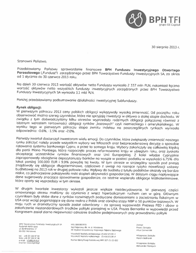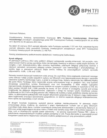 NOTA 2 - NALEŻNOŚCI FUNDUSZU BPH FIO Parasolowego BPH Subfunduszu Akcji Dynamicznych Spółek na dzień 30.06.2013 (wyrażone w tys. zł) 30.06.2013 Z tytułu zbytych lokat 31.12.2012 1 672 1 768 Z tytułu instrumentów pochodnych 0 0 Z tytułu zbytych jednostek uczestnictwa 0 0 627 0 Z tytułu odsetek 0 0 Z tytułu posiadanych nieruchomości, w tym czynszów 0 0 Z tytułu udzielonych pożyczek 0 0 28 1 493 2 327 3 261 Z tytułu dywidend Pozostałe NOTA 3 - ZOBOWIĄZANIA FUNDUSZU BPH FIO Parasolowego BPH Subfunduszu Akcji Dynamicznych Spółek na dzień 30.06.2013 (wyrażone w tys. zł) 30.06.2013 Z tytułu nabytych aktywów 31.12.2012 386 176 Z tytułu transakcji przy zobowiązaniu się funduszu do odkupu 0 0 Z tytułu instrumentów pochodnych 0 0 28 35 288 150 Z tytułu wypłaty dochodów funduszu 0 0 Z tytułu wypłaty przychodów funduszu 0 0 Z tytułu wyemitowanych obligacji 0 0 Z tytułu krótkoterminowych pożyczek i kredytów 0 0 Z tytułu długoterminowych pożyczek i kredytów 0 0 Z tytułu gwarancji lub poręczeń 0 0 574 575 0 1 1 276 937 Z tytułu wpłat na jednostki uczestnictwa Z tytułu odkupionych jednostek uczestnictwa Z tytułu rezerw Pozostałe zobowiązania
