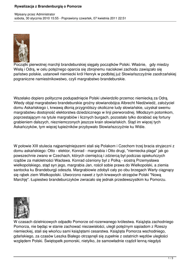 Rywalizacja z Brandenburgią o Pomorze Wpisany przez Administrator sobota, 30 stycznia 2010 15:55 - Poprawiony czwartek, 07 kwietnia 2011 22:51 Początki pierwotnej marchji brandeburskiej sięgały początków Polski. Właśnie, gdy miedzy Wisłą i Odrą, w celu potężnego oparcia się zbrojnemu naciskowi zachodu zawiązało się państwo polskie, ustanowił niemiecki król Henryk w podbitej już Słowiańszczyźnie zaodrzańskiej pograniczne namiestnikowstwo, czyli margrabstwo brandeburskie. Wszelako dopiero polityczne podupadnięcie Polski utwierdziło przemoc niemiecką za Odrą. Wtedy objął margrabstwo brandeburskie groźny słowianobójca Albrecht Niedźwiedź, założyciel domu Askańskiego i, krwawą dłonią przygniótszy okoliczne ludy słowiańskie, uzyskał swemu margrabstwu dostojność elektorstwa dziedzicznego w linji pierworodnej. Młodszym potomkom, poprzestającym na tytule margrabiów i licznych burgach, pozostało tylko dorabiać się fortuny grabieniem dalszych, niezniemczonych jeszcze krain słowiańskich. Stąd im więcej tych Askańczyków, tym więcej łupieżników przybywało Słowiańszczyźnie ku Wiśle. W połowie XIII stulecia najpamiętniejszemi stali się Polakom i Czechom trzej bracia stryjeczni z domu askańskiego: Otto - elektor, Konrad - margrabia i Otto drugi, "niemiecka plaga" jak go powszechnie zwano w Czechach, których ciemiężcą i zdziercą był podczas opiekuńczych rządów za małoletności Wacława. Konrad ożeniony był z Polką - siostrą Przemysława wielkopolskiego, stąd syn jego, margrabia Jan, rościł sobie prawa do Wielkopolski, a ziemia santocka ku Brandeburgji odeszła. Margrabiowie zdobyli cały po obu brzegach Warty ciągnący się rąbek ziem Wielkopolski. Utworzono nawet z tych krwawych strzępów Polski "Nową Marchję". Łupiestwo brandeburczyków zwracało się jednak przedewszystkim ku Pomorzu. W czasach dzielnicowych odpadło Pomorze od rozerwanego królestwa. Książęta zachodniego Pomorza, nie będąc w stanie zachować niezawisłości, ulegli potężnym sąsiadom z Rzeszy niemieckiej, stali się wkońcu sami książętami cesarstwa. Książęta Pomorza wschodniego, gdańskiego, za czasów Leszka Białego otrząsnęli się zupełnie z ostatnich węzłów uległości względem Polski. Świętopełk pomorski, nietylko, że samowładnie rządził lenną niegdyś 1/3 Rywalizacja z Brandenburgią o Pomorze Wpisany przez Administrator sobota, 30 stycznia 2010 15:55 - Poprawiony czwartek, 07 kwietnia 2011 22:51 dzielnicą, lecz owszem, przeciw księciu krakowskiemu oręż obrócił zaczepny: - za jego sprawą zamordowano w Gąsawie Leszka Białego. Walki między książętami, szarpiące Polskę, panowały i na Pomorzu. Nad pierworodną linją Świętopełka podobnie jak nad krakowskiemi Piastami ciążyła wspólna wówczas starożytnym rodom monarszym - za hańbę i nieszczęście poczytana - bezpłodność. Syn i następca Świętopełka, Mestwin, bezdzietny, powaśniony z braćmi postanowił zupełnie obcym dziedzicom przekazać swe księstwo. Brandeburczycy nie zaniedbali sposobności spółzawodnictwa o kęs tak tłusty. Nieznanemi bliżej zabiegami skłonili oni Mestwina do cofnięcia uczynionego przezeń zrazu zapisu swych ziem na rzecz Barnima, księcia zachodniego Pomorza a do zapisania margrabiom swojej spuścizny. Nie wytrwali jednak w roli przyjaciół. Mając Mestwinowi pomagać zbrojnie w walce z jego bratem Warcisławem, zajął margrabia Konrad za pozwoleniem Mestwina miasto Gdańsk i nie chciał ustąpić z niego po przerwaniu wojny z śmiercią Warcisława. Mestwin zaczął szukać pomocy przeciw niewdzięcznemu dziedzicowi i naturalnego sprzymierzeńca znalazł w osobie Bolesława Pobożnego, księcia wielkopolskiego, który, zatrwożony przyrostem potęgi brandeburskiej, pośpieszył przeciw Konradowi. Wspólnemi Mestwina i Bolesława siłami wyrzucono Brandeburczyka z Gdańska. To zerwało wszelką przyjaźń między księciem pomorskim a margrabiami. Uczyniony im zapis Pomorza poszedł w niepamięć. Tylko powiaty słupski i sławiński wyznaczył im Mestwin jako odstępne. Cała zaś przyjaźń jego przeniosła się teraz na sprzymierzeńca wielkopolskiego, tymbardziej, że w pamięci odżyło pokrewieństwo między niemi przez córkę Świętopełkową, Helingę, poślubioną niegdyś wielkopolskiemu książęciu Władysławowi Odonicowi. Pomagając sobie wzajem w każdej potrzebie wojował Bolesław Pobożny dalszemi czasy wespół z Mestwinem Brandeburczyków, wojował Mestwin Probusa, gdy ten młodego dziedzica Bolesławowego - Przemysława II zdradziecko pojmał. Po dziesięcioletniej szczerej między Pomorzem a Wielkopolską przyjaźni - Mestwin zapisał Pomorze Przemysławowi i dla tym mocniejszego zapewnienia dziedzictwa odstąpił mu jeszcze za życia miasto i zamek Wyszogród, pozwolił mu przyjąć hołd wierności od zgromadzonego rycerstwa pomorskiego i na dyplomatach podpisywać się jako przyszły dziedzic Pomorza. W ciągu dziesięcioletniego jeszcze żywota Mestwinowego panowała między nim a Przemysławem II nieprzerwana zgoda i zażyłość, wspólne narady i wspólne gody. Zapewnione spojenie Pomorza z Wielkopolską umożliwiło Przemysławowi nałożenie korony królewskiej, naodwrót poduszczało wrogą nienawiść margrabiów. Rozpostarcie się panowania polskiego na Pomorzu przecięło potężnym klinem wzdłuż wybrzeża bałtyckiego niemiecką potęgę. Owładnąwszy szczecińskim Pomorzem i dzierżonym przez Brandeburczyków pograniczem wielkopolskim od zachodu, posiadszy bronią Krzyżaków królewieckie Prusy od wschodu, potrzebowała niemiecczyzna tylko gdańskiego Pomorza, aby całe wybrzeże bałtyckie opanować. I owo toż Pomorze zostało jej teraz wydarte przez Przemysława, to Pomorze, które w znak swego zwierzchnictwa nad całym wschodem przyznał im cesarz rzymski. 2/3 Rywalizacja z Brandenburgią o Pomorze Wpisany przez Administrator sobota, 30 stycznia 201