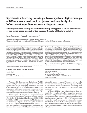 Żbikowski J i wsp. Spotkania z historią Polskiego Towarzystwa Higienicznego – 100 rocznica realizacji projektu ... HISTORIA / HISTORY 125 Spotkania z historią Polskiego Towarzystwa Higienicznego – 100 rocznica realizacji projektu budowy budynku Warszawskiego Towarzystwa Higienicznego Meetings with the history of the Polish Society of Hygiene – 100th anniversary of the construction project of the Warsaw Society of Hygiene building Jakub Żbikowski 1/, Maciej J. Marcinkowski 2/ 1/ 2/ Polskie Towarzystwo Higieniczne – Zarząd Główny, Warszawa Katedra i Zakład Medycyny Sądowej, Uniwersytet Medyczny im. Karola Marcinkowskiego w Poznaniu Warszawskie Towarzystwo Higieniczne, którego rodowód sięga 1898 roku – a przekształcone zostało w 1932 r. w Polskie Towarzystwo Higieniczne – szybko zdobyło uznanie i poparcie środowisk inteligenckich w całym kraju. Pomyślano wówczas o własnej siedzibie ze wzorowym wyposażeniem sanitarnym z laboratoriami i salą odczytową. Właściwe przygotowania do budowy siedziby rozpoczęto z inicjatywy dr. Józefa Polaka (1857-1928) już w 1902 r. W lutym 1912 r. – za pośrednictwem Koła Architektów – rozpisano konkurs na projekt gmachu. Nadesłano 13 projektów, spośród których wybrano propozycję Jana Fryderyka Heuricha (1873-1925). Realizację projektu rozpoczęto 1913 r., a uroczyste otwarcie gmachu nastąpiło 16 grudnia 1915 r. Gmach przetrwał pożogę II wojny światowej i został wpisany do rejestru zabytków. Słowa kluczowe: Warszawskie Towarzystwo Higieniczne, Polskie Towarzystwo Higieniczne, historia, rejestr zabytków The Warsaw Society of Hygiene – originated in 1898 and transformed in 1932 into the Polish Society of Hygiene – quickly gained recognition and support of the intelligentsia in the country. A head office with model sanitary equipment, laboratories and lecture rooms was required for the Society’s activities. Proper preparation for the construction of the premises was started on the initiative of Dr. Jozef Polak as early as 1902. In February 1912, – through the Society of Architects – a competition to design the building was announced. From among 13 projects the one by Jan Fryderyk Heurich (1873-1925) was selected. The project was started in 1913 and the grand opening of the building took place on 16th of Dec. 1915. The building survived the conflagration of World War II and was entered into the register of historic monuments. Key words: Hygienic Society of Warsaw, the Polish Society of Hygiene, history, historic register © Hygeia Public Health 2013, 48(1): 125-127 Adres do korespondencji / Address for correspondence www.h-ph.pl Mgr Jakub Żbikowski Polskie Towarzystwo Higieniczne ul. Karowa 31, 00-324 Warszawa tel. +48-22 826-63-20, fax +48-22 826-82-36 e-mail: [email protected] Nadesłano: xxx Zakwalifikowano do druku: xxx Warszawskie Towarzystwo Higieniczne (WTH) szybko zdobyło uznanie i poparcie środowisk inteligenckich w całym kraju [1]. Pomyślano wówczas o własnej siedzibie ze wzorowym wyposażeniem sanitarnym z laboratoriami i salą odczytową. Właściwe przygotowania do budowy siedziby rozpoczęto z inicjatywy dr. Józefa Polaka już w 1902 r. [2]. Pierwszym z licznych, ale najhojniejszym i dyskretnym fundatorem na rzecz budowy gmachu (fot. 1), był dr Kazimierz Chełchowski (1858-1917). W 1905 r. WTH – na skutek uchwały Magistratu miasta Warszawy – objęło w posiadanie, jako dzierżawca na 24 lata z czynszem 140 rubli rocznie, plac Nr 392 przy ulicy Karowej wielkości 263 sążni kwadratowych. Formalności w imieniu WTH podpisał mecenas Brze- ziński. Na mapie ówczesnej Warszawy był to punkt bardzo reprezentacyjny, obok największych hoteli, w sąsiedztwie licznie odwiedzanej Panoramy oraz u wylotu wiaduktu (od 1915 r. im. Stanisława Markiewicza). W lutym 1912 r. – za pośrednictwem Koła Architektów – rozpisano konkurs na projekt gmachu. Nadesłano 13 projektów, wśród których nagrodzono trzy najciekawsze i wybrano ostatecznie propozycję Jana Fryderyka Heuricha (1873-1925), którego plan sytuacyjny przedstawiony został ostatecznie w marcu 1912 r. (fot. 2). Gmach WTH miał pomieścić wg projektu bibliotekę wraz z czytelnią, muzeum higieniczne, pracownię badań naukowych i praktycznych oraz salę odczytową. 126 Hygeia Public Health 2013, 48(1): 125-127 Fot. 1. Współczesny widok gmachu Polskiego Towarzystwa Higienicznego Wpisany na Listę światowego dziedzictwa kulturowego i przyrodniczego ludzkości jako historyczne centrum Warszawy na mocy prawa międzynarodowego w dniu 2 września 1980 r. przez Komitet UNESCO; jednym z podstawowych kryteriów wpisu był unikatowy, niezwykle udany fakt odbudowy zespołu historycznego. Fot. 3. Dr Józef Polak Fot. 2. Projekt budynku WTH Jana Heuricha – I nagroda. (fot. Przegląd Techniczny z 1912 r.) Realizację projektu rozpoczęto 1913 r., a robotami technicznymi kierował Jerzy Mikulski. W celu urzeczywistnienia dawno powziętego planu wzniesienia własnego gmachu powołano Komitet budowy, w którego skład weszli m.in.: przewodniczący – dr Józef Polak (1857-1928) (fot. 3), wiceprezes – Stanisław Grochowicz (1858-1938) oraz sekretarz – Janina Michałowska. Dnia 17 lipca 1913 r., przy udziale wielu osób zaproszonych, odbyło się uroczyste poświęcenie kamienia węgielnego przez ks. prałata Zygmunta Chełmickiego (1851-1922) i zamurowanie aktu erekcyjnego pod budowę gmachu WTH. Uroczyste otwarcie gmachu WTH nastąpiło 16 grudnia 1915 r. Podczas uroczystości przemówił dr Józef Polak: „Okres siedemnastoletni naszego istnienia nie był okresem próżniaczym. Organizacyi urzędowej zdrowia publicznego, rzec można, nie miał kraj wcale. Stworzyć jej oczywiście nie mogło i Towarzystwo nasze, ta sfera działalności bowiem nie była mu dozwoloną. Atoli zarówno tu w Warszawie, jak w trzynastu oddziałach prowincyonalnych rozbrzmiał donośnie hejnał zdrowia publicznego, budząc tłumy obojętnych n