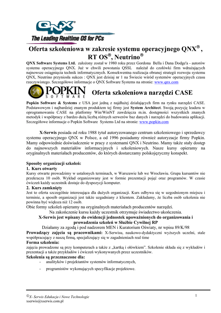 Oferta szkoleniowa w zakresie systemu operacyjnego QNX® , RT OS®, Neutrino® QNX Software Systems Ltd. założony został w 1980 roku przez Gordona Bella i Dana Dodge'a - autorów systemu operacyjnego QNX. Już w chwili powstania QSSL należał do czołówki firm wdrażających najnowsze osiągnięcia technik informatycznych. Konsekwentna realizacja obranej strategii rozwoju systemu QNX, Neutrino przyniosła sukces : QNX jest dzisiaj nr 1 na Świecie wśród systemów operacyjnych czasu rzeczywistego. Szczegółowe informacje o QNX Software Systems na stronie: www.qnx.com Oferta szkoleniowa narzędzi CASE Popkin Software & Systems z USA jest jedną z najdłużej działających firm na rynku narzędzi CASE. Podstawowym i najbardziej znanym produktem tej firmy jest System Architect. Swoją pozycję leadera w oprogramowaniu CASE na platformy Win/WinNT zawdzięcza m.in. dostępności wszystkich znanych metodyk i współpracy z bardzo dużą liczbą różnych serwerów baz danych i narzędzi do budowania aplikacji. Szczegółowe informacje o Popkin Software Systems Ltd na stronie: www.popkin.com X-Serwis posiada od roku 1988 tytuł autoryzowanego centrum szkoleniowego i sprzedawcy systemu operacyjnego QNX w Polsce, a od 1996 posiadamy również autoryzacje firmy Popkin. Mamy odpowiednie doświadczenie w pracy z systemami QNX i Neutrino. Mamy także stały dostęp do najnowszych materiałów informacyjnych i szkoleniowych. Nasze kursy opieramy na oryginalnych materiałach producentów, do których dostarczamy polskojęzyczny konspekt. Sposoby organizacji szkoleń: 1. Kurs otwarty Kursy otwarte prowadzimy w ustalonych terminach, w Warszawie lub we Wrocławiu. Grupa kursantów nie przekracza 10 osób. Wykład organizowany jest w formie prezentacji pojęć oraz programów. W czasie ćwiczeń każdy uczestnik dostaje do dyspozycji komputer. 2. Kurs zamknięty Jest to oferta szczególnie interesująca dla dużych organizacji. Kurs odbywa się w uzgodnionym miejscu i terminie, a sposób organizacji jest także uzgadniany z klientem. Zakładamy, że liczba osób szkolenia nie powinna być większa niż 12 osób. Obie formy szkoleń opieramy na oryginalnych materiałach producentów narzędzi. Na zakończenie kursu każdy uczestnik otrzymuje świadectwo ukończenia. X-Serwis jest wpisany do ewidencji jednostek upoważnionych do organizowania i prowadzenia szkoleń w Służbie Cywilnej RP Działamy za zgodą i pod nadzorem MEN i Kuratorium Oświaty, nr wpisu 89/K/98 Prowadzący zajęcia są pracownikami: X-Serwisu, naukowo-dydaktyczni wyższych uczelni, stale współpracujący z naszą firmą, specjalizujący się w zagadnieniach real time Forma szkolenia: zajęcia prowadzone są przy komputerach a także z „kartką i ołówkiem”. Szkolenie składa się z wykładów i prezentacji a także przykładów i ćwiczeń wykonywanych przez uczestników. Szkolenia są przeznaczone dla: - analityków i projektantów systemów informatycznych, - programistów wykonujących specyfikacje projektowe. ©X- Serwis Edukacja i Nowe Technologie [email protected] 1 Plan szkoleń na 2006 Proponujemy szkolenia w zakresie systemu operacyjnego QNX i System Architect Kod kursu A1 A2 B1 B2 B3 B4 C1 C2 C3 D1 D1bis D2 D3 E1 E2 E3 E4 E5 E6 F1 E2 Kod kursu SA0 SA1 SA2 SA3 Nazwa kursu A. Użytkowanie systemu operacyjnego QNX Podstawy systemu operacyjnego QNX 3 dni Administrowanie systemem QNX 2 dni A1+B1 B. Programowanie w systemie QNX Podstawy programowania w języku C 2 dni A1 Zaawansowane programowanie w QNX 3 dni A1+B1 Programowanie obiektowe, C++ w QNX 3 dni B2 Programowanie w SQL w systemie QNX 3 dni B2 C. Tworzenie aplikacji graficznych Programowanie w środowisku QNX Windows 2 dni A1+B1 Programowanie w Photon microGUI 4 dni A1+B1 Programowanie w X-Windows 3 dni A1+B1 D. Zastosowania systemu operacyjnego QNX QNX w zastosowaniach real-time 2 dni A2+B2 D1 - kurs rozszerzony 3 dni A2+B2 Zastosowania sieciowe i rozproszone 3 dni A2+B2 Zarządzanie bazami danych w QNX 3 dni A2+B2 E. QNX Momentics / Neutrino 6.3x Administrowanie systemem QNX Momentics 2 dni Podstawy QNX Momentics /Neutrino 6.3x 3 dni Programowanie w QNX Momentics/ Neutrino 6.3x 3 dni E1 QX Momentics – programowanie embedded systems 2 dni E1 Programowanie w Photon 2.xx w QNX Momentics 3 dni E1 Migracja oprogramowania QNX 4.xx => 1 dzień E2+E3 QNXMomentics/Neutrino 6.3x F. DB2 Eveyplace w środowisku QNX Momentics / Neutrino 6.3x Oprogramowanie baz danych w DB2 Everyplace 3 dni Oprogramowanie baz danych w DB2 Everyplace 1 dzień ODBC, SQL Nazwa kursu SA 0 – wprowadzenie „Wspomaganie procesu projektowania systemów 1 dzień informatycznych za pomocą narzędzi CASE” System Architect - kurs podstawowy „Nowoczesne techniki projektowania systemów 3 dni SA0 informatycznych ”System Architect - kurs podstawowy System Architect i metodyka obiektowa OMT „Modelowanie i projektowanie systemów 3 dni SA1 informatycznych z wykorzystaniem pakietu System Architect i metodyki obiektowej UML” System Architect i metodyka strukturalna Ward & Mellor „Analiza i projektowanie systemów informatycznych 3 dni SA1 z wykorzystaniem pakietu System Architect i metodyki strukturalnej Ward&Mellor” (W&M) Cena kursu w USD Otwarty Zamknięty 240 310 980 1480 220 310 400 400 1050 1480 1920 1920 400 490 430 1920 2350 2070 460 690 690 690 2210 3320 3320 3320 440 620 890 650 780 375 2100 2980 4270 3120 3740 1800 950 480 4560 2300 Cena kursu w USD Otwarty Zamknięty 900zł 7500zł 900USD 6500USD 1200USD 8600USD 1200USD 8600USD - każdy dzień szkolenia obejmuje min. 6 godzin lekcyjnych ( w tym 3 do 4 godzin zajęć praktycznych ) - symbole podane w nawiasach specyfikują rodzaje szkoleń, których ukończenie jest wskazane (konieczna jest znajomość tematyki) przed rozpoczęciem kolejnego etapu kształcenia $ - cena kursu Otwartego podana jest za jednego uczestnika ©X- Serwis Edukacja i Nowe Technologie [email protected] 2