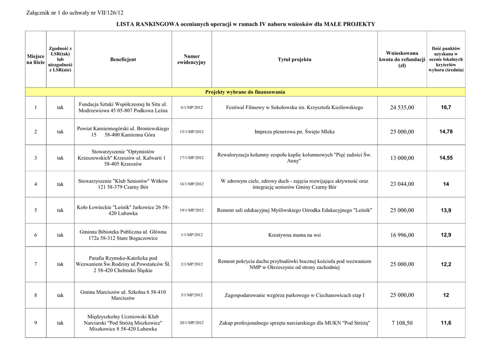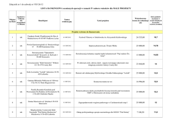 Załącznik nr 1 do uchwały nr VII/126/12 LISTA RANKINGOWA ocenianych operacji w ramach IV naboru wniosków dla MAŁE PROJEKTY Zgodność z Miejsce LSR(tak) lub na liście niezgodność Ilość punktów Beneficjent Numer ewidencyjny Tytuł projektu z LSR(nie) Wnioskowana uzyskana w kwota do refundacji ocenie lokalnych kryteriów (zł) wyboru (średnia) Projekty wybrane do finansowania 1 tak Fundacja Sztuki Współczesnej In Situ ul. Modrzewiowa 45 05-807 Podkowa Leśna 6/1/MP/2012 Festiwal Filmowy w Sokołowsku im. Krzysztofa Kieślowskiego 24 535,00 16,7 2 tak Powiat Kamiennogórski ul. Broniewskiego 15 58-400 Kamienna Góra 15/1/MP/2012 Impreza plenerowa pn. Święto Mleka 25 000,00 14,78 3 tak Stowarzyszenie "Optymistów Krzeszowskich" Krzeszów ul. Kalwarii 1 58-405 Krzeszów 17/1/MP/2012 Rewaloryzacja kolumny zespołu kaplic kolumnowych "Pięć radości Św. Anny" 13 000,00 14,55 4 tak Stowarzyszenie "Klub Seniorów" Witków 121 58-379 Czarny Bór 16/1/MP/2012 W zdrowym ciele, zdrowy duch - zajęcia rozwijające aktywność oraz integrację seniorów Gminy Czarny Bór 23 044,00 14 5 tak Koło Łowieckie "Leśnik" Jarkowice 26 58420 Lubawka 19/1/MP/2012 Remont sali edukacyjnej Myśliwskiego Ośrodka Edukacyjnego "Leśnik" 25 000,00 13,9 6 tak Gminna Bibioteka Publiczna ul. Główna 172a 58-312 Stare Bogaczowice 1/1/MP/2012 Kreatywna mama na wsi 16 996,00 12,9 7 tak Parafia Rzymsko-Katolicka pod Wezwaniem Św.Rodziny ul.Powstańców Śl. 2 58-420 Chełmsko Śląskie 2/1/MP/2012 Remont pokrycia dachu przybudówki bocznej kościoła pod wezwaniem NMP w Okrzeszynie od strony zachodniej 25 000,00 12,2 8 tak Gmina Marciszów ul. Szkolna 6 58-410 Marciszów 5/1/MP/2012 Zagospodarowanie wzgórza parkowego w Ciechanowicach etap I 25 000,00 12 9 tak Międzyszkolny Uczniowski Klub Narciarski "Pod Stróżą Miszkowice" Miszkowice 8 58-420 Lubawka 20/1/MP/2012 Zakup profesjonalnego sprzętu narciarskiego dla MUKN "Pod Stróżą" 7 108,50 11,6 10 tak Krystyna Drzewiecka Ptaszków 11 tak Gmina Stare Bogaczowice ul. Główna 132 58 - 312 Stare Bogaczowice 12 tak Ludowy Klub Sportowy "Kwarc NowakEko" w Pisarzowicach Pisarzowice 94 58400 Kamienna Góra Biomasa paliwem ekoturystyki. Zakup urządzenia do produkcji opału na potrzeby gospodarstwa agroturystycznego "Karolina" 10 715,81 11,5 10/1/MP/2012 Wyposażenie trzech świetlic w gminie Stare Bogaczowice 24 206,00 11,3 12/1/MP/2012 Remont płyty boiska sportowego w Pisarzowicach 25 000,00 11,3 13/1/MP/2012 pula dostępnych środków 252 838,27 244 605,31 PROJEKTY nie mieszczące się w limicie środków 13 tak Danuta Dwojak Przedwojów 18/1/MP/2012 Rozwój turysyki kulturowej w regionie poprzez wybudowanie altany ogrodowo-turystycznej 25 000,00 10,8 14 tak Henryk Konkol Grzędy 9/1/MP/2012 Utworzenie terenu sportowego w Grzędach 25 000,00 10,7 15 tak Mieroszowskie Centrum Kultury ul. Żeromskiego 28 58-350 Mieroszów 11/1/MP/2012 "Warsztaty biżuterii artystycznej" 9 541,00 10,33 16 tak Fundacja Sztuki Współczesnej In Situ ul. Modrzewiowa 45 05-807 Podkowa Leśna 7/1/MP/2012 Zakup i montaż kotła c.o. wraz z wkładem kominowym, zbiornika ciepłej wody użytkowej oraz drzwi p.poż.w ramach modernizacji Kinotetru Zdrowie w Sokołowsku w celu przystosowania obiektu do całorocznej działalności edukacyjnokulturowej 25 000,00 10,1 17 tak Daniel Filip Błażejów 8/1/MP/2012 Instalacja kolektorów słonacznych- w celu podniesienia standardu Gospodarstwa Agroturystycznego -Daniel Filip Błażejów 147 17 458,00 10,1 18 tak Spółdzielnia Mieszkaniowa "Szarotka" ul.M.C.Skłodowskiej 12 58-400 Kamienna Góra 3/1/MP/2012 Remont boiska osiedlowego w Lubawce 25 000,00 9,8 19 tak Centrum Kultury w Czarnym Borze ul.Sportowa 44 58-379 Czarny Bór 14/1/MP/2012 Zakup i montaż urządzeń do rekreacji ruchowej na wolnym powietrzu 25 000,00 9,55 20 tak Gmina Kamienna Góra Al.Wojska Polskiego 10 58-400 Kamienna Góra 4/1/MP/2012 Remont połączony z modernizacją pomieszczeń sanitarnych w świetlicy w Czadrowie 25 000,00 8,66 RAZEM wnioskowane kwoty 421 604,31 PULA dostępnych środków w konkursie 252 838,27