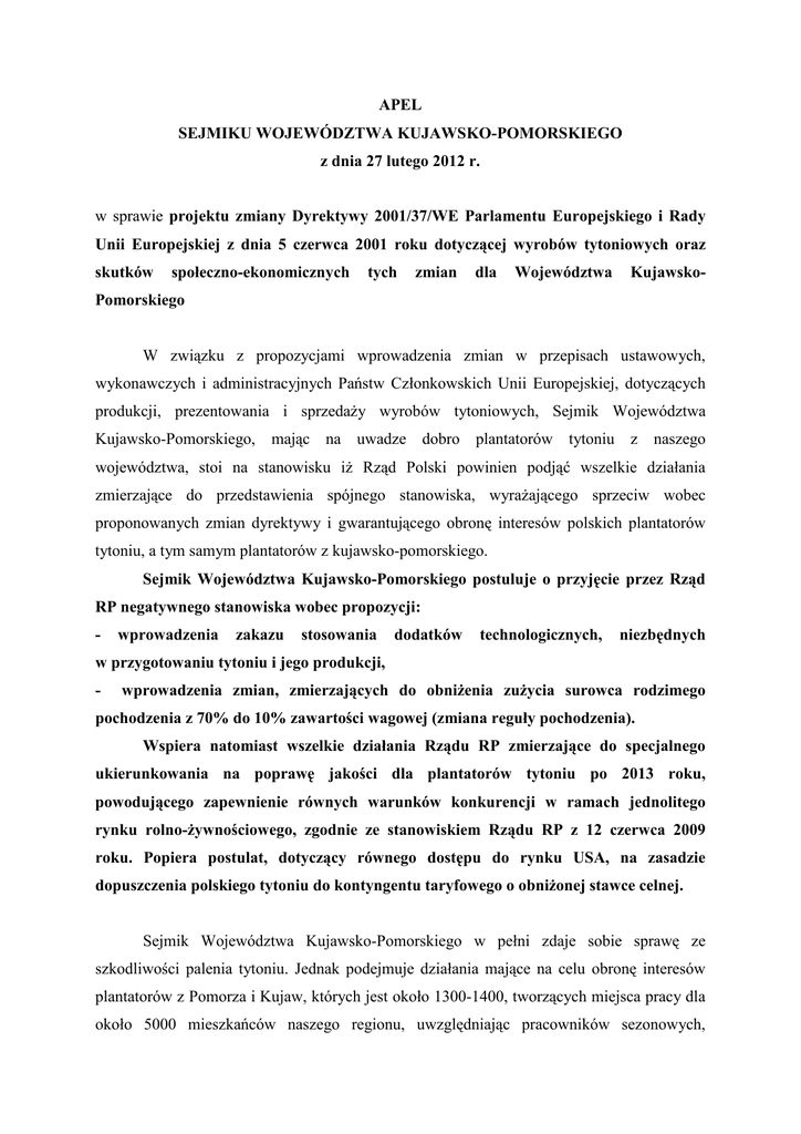 APEL SEJMIKU WOJEWÓDZTWA KUJAWSKO-POMORSKIEGO z dnia 27 lutego 2012 r. w sprawie projektu zmiany Dyrektywy 2001/37/WE Parlamentu Europejskiego i Rady Unii Europejskiej z dnia 5 czerwca 2001 roku dotyczącej wyrobów tytoniowych oraz skutków społeczno-ekonomicznych tych zmian dla Województwa Kujawsko- Pomorskiego W związku z propozycjami wprowadzenia zmian w przepisach ustawowych, wykonawczych i administracyjnych Państw Członkowskich Unii Europejskiej, dotyczących produkcji, prezentowania i sprzedaŜy wyrobów tytoniowych, Sejmik Województwa Kujawsko-Pomorskiego, mając na uwadze dobro plantatorów tytoniu z naszego województwa, stoi na stanowisku iŜ Rząd Polski powinien podjąć wszelkie działania zmierzające do przedstawienia spójnego stanowiska, wyraŜającego sprzeciw wobec proponowanych zmian dyrektywy i gwarantującego obronę interesów polskich plantatorów tytoniu, a tym samym plantatorów z kujawsko-pomorskiego. Sejmik Województwa Kujawsko-Pomorskiego postuluje o przyjęcie przez Rząd RP negatywnego stanowiska wobec propozycji: - wprowadzenia zakazu stosowania dodatków technologicznych, niezbędnych w przygotowaniu tytoniu i jego produkcji, - wprowadzenia zmian, zmierzających do obniŜenia zuŜycia surowca rodzimego pochodzenia z 70% do 10% zawartości wagowej (zmiana reguły pochodzenia). Wspiera natomiast wszelkie działania Rządu RP zmierzające do specjalnego ukierunkowania na poprawę jakości dla plantatorów tytoniu po 2013 roku, powodującego zapewnienie równych warunków konkurencji w ramach jednolitego rynku rolno-Ŝywnościowego, zgodnie ze stanowiskiem Rządu RP z 12 czerwca 2009 roku. Popiera postulat, dotyczący równego dostępu do rynku USA, na zasadzie dopuszczenia polskiego tytoniu do kontyngentu taryfowego o obniŜonej stawce celnej. Sejmik Województwa Kujawsko-Pomorskiego w pełni zdaje sobie sprawę ze szkodliwości palenia tytoniu. Jednak podejmuje działania mające na celu obronę interesów plantatorów z Pomorza i Kujaw, których jest około 1300-1400, tworzących miejsca pracy dla około 5000 mieszkańców naszego regionu, uwzględniając pracowników sezonowych, produkujących 5 do 6 tysięcy ton tytoniu. Produkcja ta stanowi jedyne źródło utrzymania plantatorów. Mały areał pojedynczej plantacji, relatywnie słaba jakość gleby, jak równieŜ bardzo wysokie koszty zmiany profilu upraw praktycznie uniemoŜliwiają przestawienie się na inne rodzaje produkcji, zapewniające alternatywne źródła dochodu. Brak powodzenia podjętych działań Rządu RP moŜe okazać się katastrofalny dla plantatorów tytoniu, jak równieŜ dla Województwa, zarówno pod względem ekonomicznym – pozbawienie budŜetu znacznych wpływów z podatków, jak i społecznym, pozbawiając tysiące rodzin plantatorów źródła utrzymania. Otrzymują: - Prezes Rady Ministrów RP - Marszałek Sejmu RP - Marszałek Senatu RP - Minister Rolnictwa Rozwoju Wsi - Minister Gospodarki - Sejmowa Komisja Rolnictwa i Rozwoju Wsi - Sejmowa Komisja Gospodarki - Senacka Komisja Gospodarki Narodowej - Parlamentarzyści Kujawsko-Pomorscy - Europarlamentarzyści Kujawsko-Pomorscy - Kujawsko-Pomorski Tytoń - Okręgowy Związek Plantatorów w Grudziądzu, - Związek Województw RP