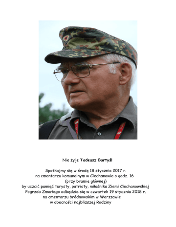 Nie żyje Tadeusz Bartyś! Spotkajmy się w środę 18 stycznia 2017 r. na cmentarzu komunalnym w Ciechanowie o godz. 16 (przy bramie głównej) by uczcić pamięć turysty, patrioty, miłośnika Ziemi Ciechanowskiej Pogrzeb Zmarłego odbędzie się w czwartek 19 stycznia 2018 r. na cmentarzu bródnowskim w Warszawie w obecności najbliższej Rodziny