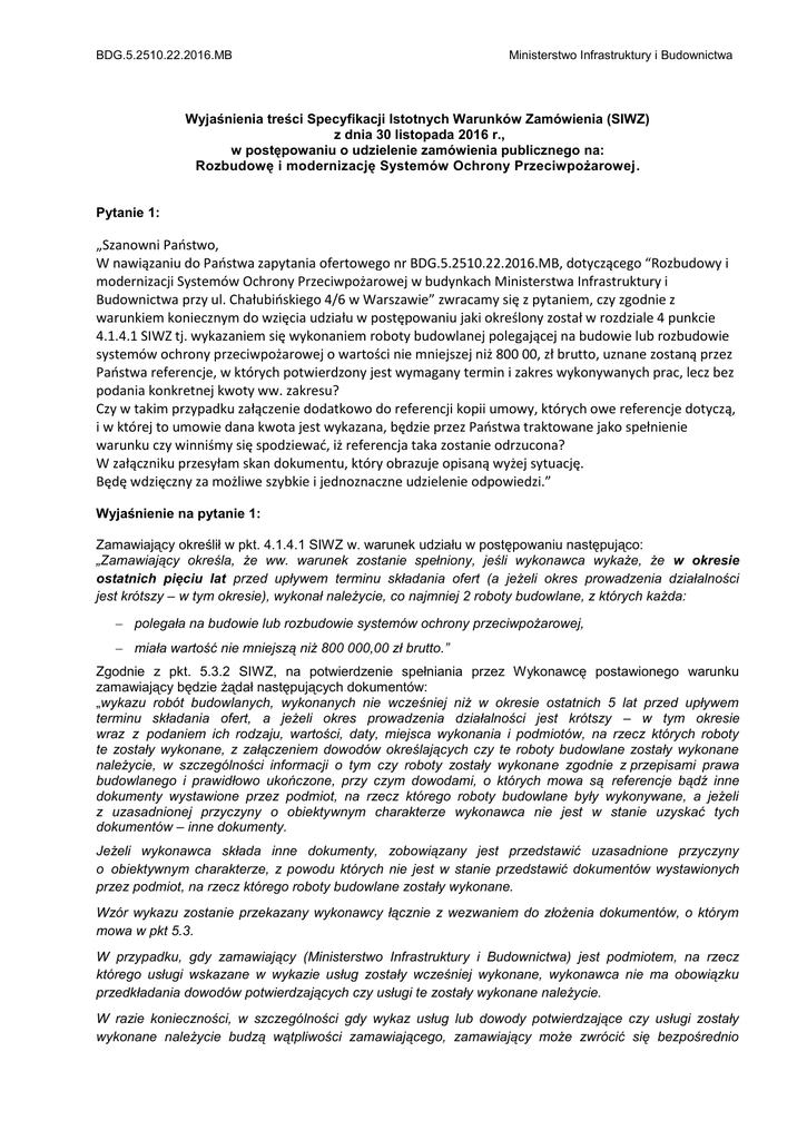 BDG.5.2510.22.2016.MB Ministerstwo Infrastruktury i Budownictwa Wyjaśnienia treści Specyfikacji Istotnych Warunków Zamówienia (SIWZ) z dnia 30 listopada 2016 r., w postępowaniu o udzielenie zamówienia publicznego na: Rozbudowę i modernizację Systemów Ochrony Przeciwpożarowej. Pytanie 1: „Szanowni Państwo, W nawiązaniu do Państwa zapytania ofertowego nr BDG.5.2510.22.2016.MB, dotyczącego “Rozbudowy i modernizacji Systemów Ochrony Przeciwpożarowej w budynkach Ministerstwa Infrastruktury i Budownictwa przy ul. Chałubińskiego 4/6 w Warszawie” zwracamy się z pytaniem, czy zgodnie z warunkiem koniecznym do wzięcia udziału w postępowaniu jaki określony został w rozdziale 4 punkcie 4.1.4.1 SIWZ tj. wykazaniem się wykonaniem roboty budowlanej polegającej na budowie lub rozbudowie systemów ochrony przeciwpożarowej o wartości nie mniejszej niż 800 00, zł brutto, uznane zostaną przez Państwa referencje, w których potwierdzony jest wymagany termin i zakres wykonywanych prac, lecz bez podania konkretnej kwoty ww. zakresu? Czy w takim przypadku załączenie dodatkowo do referencji kopii umowy, których owe referencje dotyczą, i w której to umowie dana kwota jest wykazana, będzie przez Państwa traktowane jako spełnienie warunku czy winniśmy się spodziewać, iż referencja taka zostanie odrzucona? W załączniku przesyłam skan dokumentu, który obrazuje opisaną wyżej sytuację. Będę wdzięczny za możliwe szybkie i jednoznaczne udzielenie odpowiedzi.” Wyjaśnienie na pytanie 1: Zamawiający określił w pkt. 4.1.4.1 SIWZ w. warunek udziału w postępowaniu następująco: „Zamawiający określa, że ww. warunek zostanie spełniony, jeśli wykonawca wykaże, że w okresie ostatnich pięciu lat przed upływem terminu składania ofert (a jeżeli okres prowadzenia działalności jest krótszy – w tym okresie), wykonał należycie, co najmniej 2 roboty budowlane, z których każda: polegała na budowie lub rozbudowie systemów ochrony przeciwpożarowej, miała wartość nie mniejszą niż 800 000,00 zł brutto.” Zgodnie z pkt. 5.3.2 SIWZ, na potwierdzenie spełniania przez Wykonawcę postawionego warunku zamawiający będzie żądał następujących dokumentów: „wykazu robót budowlanych, wykonanych nie wcześniej niż w okresie ostatnich 5 lat przed upływem terminu składania ofert, a jeżeli okres prowadzenia działalności jest krótszy – w tym okresie wraz z podaniem ich rodzaju, wartości, daty, miejsca wykonania i podmiotów, na rzecz których roboty te zostały wykonane, z załączeniem dowodów określających czy te roboty budowlane zostały wykonane należycie, w szczególności informacji o tym czy roboty zostały wykonane zgodnie z przepisami prawa budowlanego i prawidłowo ukończone, przy czym dowodami, o których mowa są referencje bądź inne dokumenty wystawione przez podmiot, na rzecz którego roboty budowlane były wykonywane, a jeżeli z uzasadnionej przyczyny o obiektywnym charakterze wykonawca nie jest w stanie uzyskać tych dokumentów – inne dokumenty. Jeżeli wykonawca składa inne dokumenty, zobowiązany jest przedstawić uzasadnione przyczyny o obiektywnym charakterze, z powodu których nie jest w stanie przedstawić dokumentów wystawionych przez podmiot, na rzecz którego roboty budowlane zostały wykonane. Wzór wykazu zostanie przekazany wykonawcy łącznie z wezwaniem do złożenia dokumentów, o którym mowa w pkt 5.3. W przypadku, gdy zamawiający (Ministerstwo Infrastruktury i Budownictwa) jest podmiotem, na rzecz którego usługi wskazane w wykazie usług zostały wcześniej wykonane, wykonawca nie ma obowiązku przedkładania dowodów potwierdzających czy usługi te zostały wykonane należycie. W razie konieczności, w szczególności gdy wykaz usług lub dowody potwierdzające czy usługi zostały wykonane należycie budzą wątpliwości zamawiającego, zamawiający może zwrócić się bezpośrednio BDG.5.2510.22.2016.MB Ministerstwo Infrastruktury i Budownictwa do właściwego podmiotu, na rzecz którego usługi były wykonane, o przedłożenie dodatkowych informacji lub dokumentów bezpośrednio zamawiającemu.” Jednocześnie w pkt 4.14 i 5.3 SIWZ zamawiający określił, że: „4.14 Zamawiający informuje, iż na podstawie art. 24 aa ustawy najpierw dokona oceny ofert, a następnie zbada czy wykonawca, którego oferta została oceniona jako najkorzystniejsza, nie podlega wykluczeniu oraz spełnia warunki udziału w postępowaniu. „5.3 Zamawiający przed udzieleniem zamówienia, wezwie wykonawcę, którego oferta została najwyżej oceniona, do złożenia w wyznaczonym, nie krótszym niż 5 dni, terminie aktualnych na dzień złożenia oświadczeń lub dokumentów potwierdzających okoliczności, o których mowa w pkt 4.1 SIWZ, …” Jak z powyższego wynika, wraz ze złożeniem oferty wykonawca nie składa wykazu, o którym mowa powyżej. Do złożenia Wykazu robót budowlanych, oraz dowodów określających czy te roboty budowlane zostały wykonane należycie, zostanie wezwany wykonawca, którego oferta zostanie oceniona jako najkorzystniejsza. Należy zauważyć, że potwierdzeniem należytego wykonania zamówienia są „referencje bądź inne dokumenty wystawione przez podmiot, na rzecz którego roboty budowlane były wykonywane, a jeżeli z uzasadnionej przyczyny o obiektywnym charakterze wykonawca nie jest w stanie uzyskać tych dokumentów – inne dokumenty.” Referencje bądź inne dokumenty, co do zasady, mają potwierdzać należyte wykonanie wykazanych zamówień, a nie ich wartość. Należy także zwrócić uwagę, aby wykazane w wykazie roboty zostały wykonane „nie wcześniej niż w okresie ostatnich 5 lat przed upływem terminu składania ofert”. Termin składani ofert to 12 grudnia 2016 roku, zatem umieszczone w wykazie roboty musiały zostać wykonane nie wcześniej niż 12 grudnia 2011 roku. Powyższe wyjaśnienia stanowią integralną część SIWZ.