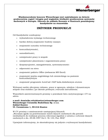 Międzynarodowy koncern Wienerberger jest największym na świecie producentem cegieł i drugim pod względem wielkości producentem systemów dachowych w Europie. Obecnie do zakładu Koramic w Kunicach poszukujemy kandydatów na stanowisko INŻYNIER PRODUKCJI Od Kandydatów oczekujemy: • wykształcenia wyższego technicznego • bardzo dobrej znajomości budowy maszyn • znajomości rysunku technicznego • komunikatywności, • samodzielności, • umiejętności pracy w zespole • umiejętności planowania i organizowania pracy • dyspozycyjności, zaangażowania, systematyczności • odporności na stres • znajomości pakietu Office (zwłaszcza MS Excel) • znajomości języka angielskiego lub niemieckiego na poziomie komunikatywnym • znajomość programów AutoCad i SAP będą dodatkowym atutem Wybranej osobie oferujemy ciekawą pracę w zgranym, młodym i dynamicznym zespole oraz stabilne ( po okresie próbnym ) warunki zatrudnienia. Wszystkich zainteresowanych prosimy o przesłanie listu motywacyjnego i CV na adres: e-mail: [email protected] Wienerberger Ceramika Budowlana Sp. z o.o. Zakład Kunice Ul. Ceramiczna 1, 59-216 Kunice W CV prosimy o zamieszczenie następującej klauzuli: „Wyrażam zgodę na przetwarzanie moich danych osobowych dla potrzeb niezbędnych do realizacji procesu rekrutacji (zgodnie z ustawą o ochronie danych osobowych z dn. 29.08.1997 Dz.U. Nr 133, Poz. 883)” Uprzejmie informujemy, że skontaktujemy się jedynie z wybranymi kandydatami.