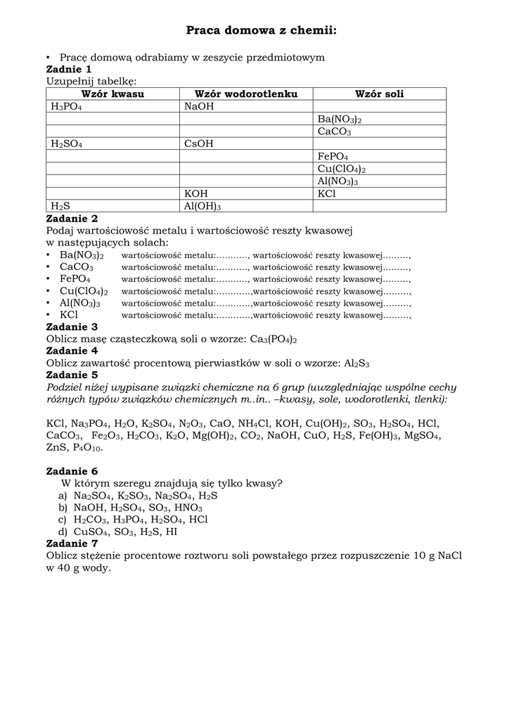 Praca domowa z chemii: • Pracę domową odrabiamy w zeszycie przedmiotowym Zadnie 1 Uzupełnij tabelkę: Wzór kwasu Wzór wodorotlenku Wzór soli H3PO4 NaOH Ba(NO3)2 CaCO3 H2SO4 CsOH FePO4 Cu(ClO4)2 Al(NO3)3 KOH KCl H2 S Al(OH)3 Zadanie 2 Podaj wartościowość metalu i wartościowość reszty kwasowej w następujących solach: • Ba(NO3)2 wartościowość metalu:……….., wartościowość reszty kwasowej………, • CaCO3 wartościowość metalu:……….., wartościowość reszty kwasowej………, • FePO4 wartościowość metalu:……….., wartościowość reszty kwasowej………, • Cu(ClO4)2 wartościowość metalu:…………,wartościowość reszty kwasowej………, • Al(NO3)3 wartościowość metalu:…………,wartościowość reszty kwasowej………, • KCl wartościowość metalu:…………,wartościowość reszty kwasowej………, Zadanie 3 Oblicz masę cząsteczkową soli o wzorze: Ca3(PO4)2 Zadanie 4 Oblicz zawartość procentową pierwiastków w soli o wzorze: Al2S3 Zadanie 5 Podziel niŜej wypisane związki chemiczne na 6 grup (uwzględniając wspólne cechy róŜnych typów związków chemicznych m..in.. –kwasy, sole, wodorotlenki, tlenki): KCl, Na3PO4, H2O, K2SO4, N2O3, CaO, NH4Cl, KOH, Cu(OH)2, SO3, H2SO4, HCl, CaCO3, Fe2O3, H2CO3, K2O, Mg(OH)2, CO2, NaOH, CuO, H2S, Fe(OH)3, MgSO4, ZnS, P4O10. Zadanie 6 W którym szeregu znajdują się tylko kwasy? a) Na2SO4, K2SO3, Na2SO4, H2S b) NaOH, H2SO4, SO3, HNO3 c) H2CO3, H3PO4, H2SO4, HCl d) CuSO4, SO3, H2S, HI Zadanie 7 Oblicz stęŜenie procentowe roztworu soli powstałego przez rozpuszczenie 10 g NaCl w 40 g wody. Zadanie 8 Woda gazowana zawiera rozpuszczony w niej tlenek węgla (IV). W tabeli podano dane dotyczące zaleŜności rozpuszczalności tlenku węgla (IV) w wodzie od temperatury. Temperatura w 0C Rozpuszczalność CO2 w g w 100g wody 0 0,335 20 0,167 40 0,097 60 0,058 80 0,027 Oceń prawdziwość podanych stwierdzeń. Wybierz P, jeśli stwierdzenie jest prawdziwe lub F-jeśli fałszywe: W wyniku rozpuszczenia 0,058 g tlenku węgla (IV)w 100 g wody w temperaturze 600C powstaje roztwór nasycony Rozpuszczalność tlenku węgla (IV) maleje wraz ze wzrostem temperatury P F P F Zadanie 9 Oblicz objętość oraz masę tlenu zawartego w klasie o wymiarach 8 m x 5 m x 3 m. Gęstość tlenu wynosi 1,43 g /dm3.