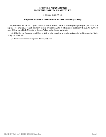 UCHWAŁA NR XXI/128/2016 RADY MIEJSKIEJ W KSIĄŻU WLKP. z dnia 23 maja 2016 r. w sprawie udzielenia absolutorium Burmistrzowi Książa Wlkp. Na podstawie art. 18 ust. 2 pkt 4 ustawy z dnia 8 marca 1990 r. o samorządzie gminnym (Dz. U. z 2016 r. poz. 446) oraz art. 271 ust. 1 ustawy z dnia 27sierpnia 2009 r. o finansach publicznych (Dz. U. z 2013 r. poz. 885 ze zm.) Rada Miejska w Książu Wlkp. uchwala, co następuję: § 1. Udziela się Burmistrzowi Książa Wlkp. absolutorium z tytułu wykonania budżetu gminy Książ Wlkp. za 2015 rok. § 2. Uchwała wchodzi w życie z dniem podjęcia. Id: A9284F9F-FA62-4A1A-8E1E-E0942FE928B5. Uchwalony Strona 1 UZASADNIENIE do Uchwały Nr XXI/128/2016 Rady Miejskiej w Książu Wlkp. z dnia 23 maja 2016 r. Zgodnie z art. 18 ust. 2 pkt 4 ustawy o samorządzie gminnym do wyłącznej właściwości rady gminy należy uchwalenie budżetu gminy, rozpatrywanie sprawozdania z wykonania budżetu oraz podejmowanie uchwały w sprawie udzielenia absolutorium Burmistrzowi z tego tytułu. Rada Miejska w Książu Wlkp. zapoznała się ze sprawozdaniem Burmistrza Książa Wlkp. z wykonania budżetu gminy za 2015 r., sprawozdaniem finansowym, opinią Regionalnej Izby Obrachunkowej w Poznaniu o sprawozdaniu z wykonania budżetu Gminy Książ Wlkp. za 2015 r., a także informacją o stanie mienia gminy Książ Wlkp. Pismem z dnia 11 maja 2016 r. Komisja Rewizyjna Rady Miejskiej w Książu Wlkp. skierowała do Regionalnej Izby Obrachunkowej w Poznaniu wniosek o udzielenie absolutorium Burmistrzowi Książa Wlkp. W odpowiedzie organ nadzoru finansowego wyraził opinię, że ww. wniosek Komisji został podjęty i uzasadniony zgodnie z wymogami prawa wobec spełnienie wszystkich ustawowych przesłanek do udzielenia Burmistrzowi Książa Wlkp., absolutorium z tytułu wykonania budżetu gminy Książ Wlkp. za 2015 rok. Id: A9284F9F-FA62-4A1A-8E1E-E0942FE928B5. Uchwalony Strona 1