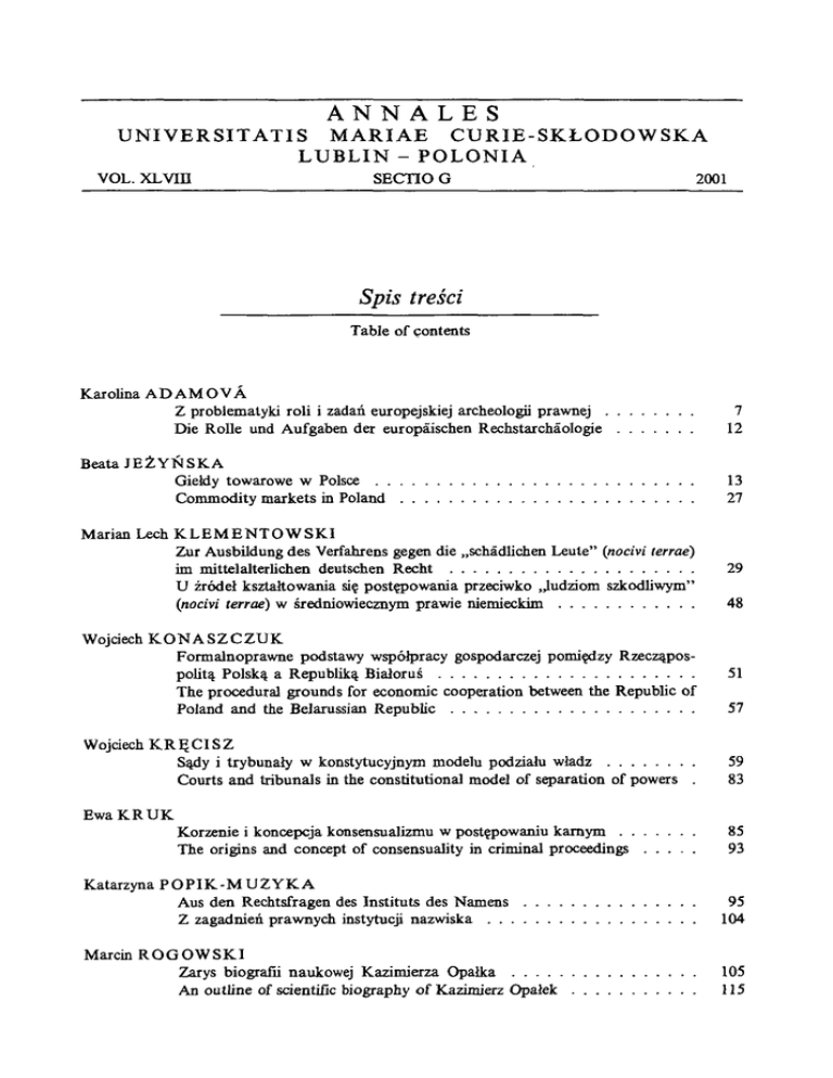Α Ν N A L Ε S U N I VE R S I Τ A T I S M A R I A E CURIE-SKŁODOWSKA LUBLIN - POLONIA Spis treści Table of ęontents Karolina A D A M O V Ä Z problematyki roli i zadań europejskiej archeologii prawnej Die Rolle und Aufgaben der europäischen Rechstarchäologie 7 12 Beata J E Ż Y Ń S K A Giełdy towarowe w Polsce Commodity markets in Poland 13 27 Marian Lech K L E M E N T O W S K I Zur Ausbildung des Verfahrens gegen die „schädlichen Leute" (nocivi terrae) im mittelalterlichen deutschen Recht U źródeł kształtowania się postępowania przeciwko „ludziom szkodliwym" (nocivi terrae) w średniowiecznym prawie niemieckim 29 Wojciech K O N A S Z C Z U K Formalnoprawne podstawy współpracy gospodarczej pomiędzy Rzecząpospolitą Polską a Republiką Białoruś The procedura! grounds for economic cooperation between the Republic of Poland and the Belarussian Republic 51 Wojciech K R Ę C I S Z Sądy i trybunały w konstytucyjnym modelu podziału władz Courts and tribunals in the constitutional model of separation of powers . 48 57 59 83 Ewa K R U K Korzenie i koncepcja konsensualizmu w postępowaniu karnym The origins and concept of consensuality in criminal proceedings 85 93 Katarzyna P O P I K - M U Z Y K A Aus den Rechtsfragen des Instituts des Namens Z zagadnień prawnych instytucji nazwiska 95 104 Marcin R O G O W S K I Zarys biografii naukowej Kazimierza Opałka An outline of scientific biography of Kazimierz Opałek 105 115 6 SPIS TREŚCI Jiri S O U Ś A Historia nowożytnej administracji na ziemiach czeskich: codzienność, lobbing oraz protekcja (niekonwencjonalne zagadnienia w badaniach historycznych państwa i prawa) History of modern administration in the Czech Lands: Everyday life, lobbyism and protectionism (unusual issues in state and law history studies) Jerzy S T E L M A S I A K Environmental protection law in Poland Ustawa o ochronie środowiska w Polsce Iwona S Z P R I N G E R Akcesoryjność zastawu i hipoteki w świetle zabezpieczenia wierzytelności terminowej, warunkowej i przyszłej The accessoriness of pledge and mortgage in the light of the security of conditional, future and fixed-term claims 117 130 133 150 151 160 Wojciech T A R A S Образование территориального самоуправления в Польше в 1990-2000 годы Kształtowanie się samorządu terytorialnego w Polsce w latach 1990-2000 . 161 172 Roman T O K A R C Z Y K Przymus a prawo Coercion and law 173 196 Toshiya U E K I Legal regime of world trade under the GATT and WTO System prawny handlu światowego w regulacjach GATT oraz WTO . . . Marianna Z I M O L Ą G Zagadnienie członkostwa Międzynarodowej Unii Telekomunikacyjnej ze stanowiska prawa międzynarodowego Problems of membership of the International Telecommunications Union from the standpoint of international law 197 207 209 220 RECENZJE. NOTY BIBLIOGRAFICZNE Karolina Adamovä, Ladislav Krizkovsky: Dejiny mysleni о state, Codex 2000, Wydawnictwo ASPI Publishing, Praha, ss. 390, wyd. I [Lech Dübel] Alois Riklin: Niccolö Machiavellego nauka o rządzeniu, przekład Η. Olszewski, Wydawnictwo Poznańskie, Poznań 2000, ss. 129 [Jarosław Kostrubiec] Grzegorz Leopold Seidler: Władza ustawodawcza i wykonawcza w polskich konstrukcjach ustrojowych 1917-1947, wyd. II, Wydawnictwo UMCS, Lublin 2000, ss. 144 [Wojciech Więcław] 221 224 226