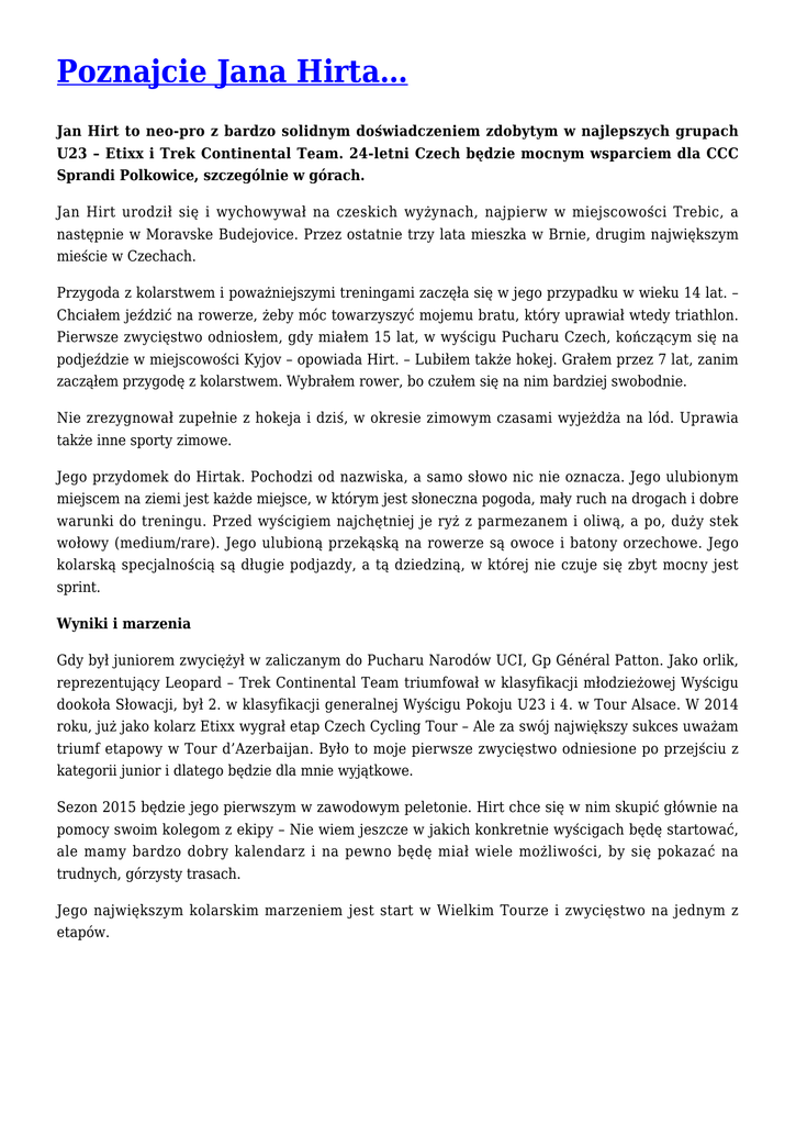 Poznajcie Jana Hirta… Jan Hirt to neo-pro z bardzo solidnym doświadczeniem zdobytym w najlepszych grupach U23 – Etixx i Trek Continental Team. 24-letni Czech będzie mocnym wsparciem dla CCC Sprandi Polkowice, szczególnie w górach. Jan Hirt urodził się i wychowywał na czeskich wyżynach, najpierw w miejscowości Trebic, a następnie w Moravske Budejovice. Przez ostatnie trzy lata mieszka w Brnie, drugim największym mieście w Czechach. Przygoda z kolarstwem i poważniejszymi treningami zaczęła się w jego przypadku w wieku 14 lat. – Chciałem jeździć na rowerze, żeby móc towarzyszyć mojemu bratu, który uprawiał wtedy triathlon. Pierwsze zwycięstwo odniosłem, gdy miałem 15 lat, w wyścigu Pucharu Czech, kończącym się na podjeździe w miejscowości Kyjov – opowiada Hirt. – Lubiłem także hokej. Grałem przez 7 lat, zanim zacząłem przygodę z kolarstwem. Wybrałem rower, bo czułem się na nim bardziej swobodnie. Nie zrezygnował zupełnie z hokeja i dziś, w okresie zimowym czasami wyjeżdża na lód. Uprawia także inne sporty zimowe. Jego przydomek do Hirtak. Pochodzi od nazwiska, a samo słowo nic nie oznacza. Jego ulubionym miejscem na ziemi jest każde miejsce, w którym jest słoneczna pogoda, mały ruch na drogach i dobre warunki do treningu. Przed wyścigiem najchętniej je ryż z parmezanem i oliwą, a po, duży stek wołowy (medium/rare). Jego ulubioną przekąską na rowerze są owoce i batony orzechowe. Jego kolarską specjalnością są długie podjazdy, a tą dziedziną, w której nie czuje się zbyt mocny jest sprint. Wyniki i marzenia Gdy był juniorem zwyciężył w zaliczanym do Pucharu Narodów UCI, Gp Général Patton. Jako orlik, reprezentujący Leopard – Trek Continental Team triumfował w klasyfikacji młodzieżowej Wyścigu dookoła Słowacji, był 2. w klasyfikacji generalnej Wyścigu Pokoju U23 i 4. w Tour Alsace. W 2014 roku, już jako kolarz Etixx wygrał etap Czech Cycling Tour – Ale za swój największy sukces uważam triumf etapowy w Tour d’Azerbaijan. Było to moje pierwsze zwycięstwo odniesione po przejściu z kategorii junior i dlatego będzie dla mnie wyjątkowe. Sezon 2015 będzie jego pierwszym w zawodowym peletonie. Hirt chce się w nim skupić głównie na pomocy swoim kolegom z ekipy – Nie wiem jeszcze w jakich konkretnie wyścigach będę startować, ale mamy bardzo dobry kalendarz i na pewno będę miał wiele możliwości, by się pokazać na trudnych, górzysty trasach. Jego największym kolarskim marzeniem jest start w Wielkim Tourze i zwycięstwo na jednym z etapów.