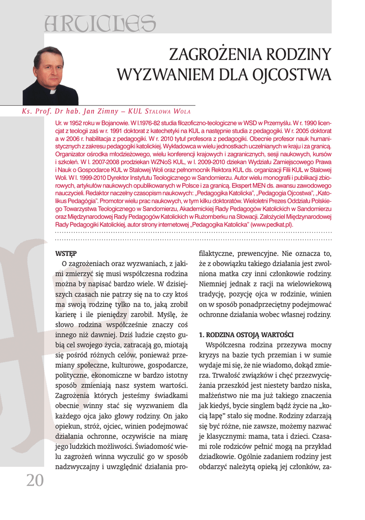 ARTICLES Zagrożenia rodziny wyzwaniem dla ojcostwa K s . P rof. Dr hab. Jan Zimny – K UL S t a l o wa W o l a Ur. w 1952 roku w Bojanowie. W l.1976-82 studia filozoficzno-teologiczne w WSD w Przemyślu. W r. 1990 licencjat z teologii zaś w r. 1991 doktorat z katechetyki na KUL a następnie studia z pedagogiki. W r. 2005 doktorat a w 2006 r. habilitacja z pedagogiki. W r. 2010 tytuł profesora z pedagogiki. Obecnie profesor nauk humanistycznych z zakresu pedagogiki katolickiej. Wykładowca w wielu jednostkach uczelnianych w kraju i za granicą. Organizator ośrodka młodzieżowego, wielu konferencji krajowych i zagranicznych, sesji naukowych, kursów i szkoleń. W l. 2007-2008 prodziekan WZNoS KUL, w l. 2009-2010 dziekan Wydziału Zamiejscowego Prawa i Nauk o Gospodarce KUL w Stalowej Woli oraz pełnomocnik Rektora KUL ds. organizacji Filii KUL w Stalowej Woli. W l. 1999-2010 Dyrektor Instytutu Teologicznego w Sandomierzu. Autor wielu monografii i publikacji zbiorowych, artykułów naukowych opublikowanych w Polsce i za granicą. Ekspert MEN ds. awansu zawodowego nauczycieli. Redaktor naczelny czasopism naukowych: „Pedagogika Katolicka”, „Pedagogia Ojcostwa”, „Katolikus Pedagógia”. Promotor wielu prac naukowych, w tym kilku doktoratów. Wieloletni Prezes Oddziału Polskiego Towarzystwa Teologicznego w Sandomierzu, Akademickiej Rady Pedagogów Katolickich w Sandomierzu oraz Międzynarodowej Rady Pedagogów Katolickich w Rużomberku na Słowacji. Założyciel Międzynarodowej Rady Pedagogiki Katolickiej, autor strony internetowej „Pedagogika Katolicka” (www.pedkat.pl). 20 Wstęp O zagrożeniach oraz wyzwaniach, z jakimi zmierzyć się musi współczesna rodzina można by napisać bardzo wiele. W dzisiejszych czasach nie patrzy się na to czy ktoś ma swoją rodzinę tylko na to, jaką zrobił karierę i ile pieniędzy zarobił. Myślę, że słowo rodzina współcześnie znaczy coś innego niż dawniej. Dziś ludzie często gubią cel swojego życia, zatracają go, miotają się pośród różnych celów, ponieważ przemiany społeczne, kulturowe, gospodarcze, polityczne, ekonomiczne w bardzo istotny sposób zmieniają nasz system wartości. Zagrożenia których jesteśmy świadkami obecnie winny stać się wyzwaniem dla każdego ojca jako głowy rodziny. On jako opiekun, stróż, ojciec, winien podejmować działania ochronne, oczywiście na miarę jego ludzkich możliwości. Świadomość wielu zagrożeń winna wyczulić go w sposób nadzwyczajny i uwzględnić działania pro- filaktyczne, prewencyjne. Nie oznacza to, że z obowiązku takiego działania jest zwolniona matka czy inni członkowie rodziny. Niemniej jednak z racji na wielowiekową tradycję, pozycję ojca w rodzinie, winien on w sposób ponadprzeciętny podejmować ochronne działania wobec własnej rodziny. 1. Rodzina ostoją wartości Współczesna rodzina przezywa mocny kryzys na bazie tych przemian i w sumie wydaje mi się, że nie wiadomo, dokąd zmierza. Trwałość związków i chęć przezwyciężania przeszkód jest niestety bardzo niska, małżeństwo nie ma już takiego znaczenia jak kiedyś, bycie singlem bądź życie na „kocią łapę” stało się modne. Rodziny zdarzają się być różne, nie zawsze, możemy nazwać je klasycznymi: mama, tata i dzieci. Czasami role rodziców pełnić mogą na przykład dziadkowie. Ogólnie zadaniem rodziny jest obdarzyć należytą opieką jej członków, za- ARTYKUŁY pewnić im jednakże poczucie bezpieczeństwa jak i miłości. Rodzina jest najważniejsza dla każdego dziecka od chwili jego narodzin. Jest ona dla niego pierwszym, naturalnym, a zarazem najistotniejszym środowiskiem wychowawczym. Wywiera największy wpływ na jego całe dzieciństwo, później młodzieńcze i dorosłe życie, ponieważ stanowi całkowite źródło wzorów zachowań, norm oraz systemu wartości. Dlatego tak wiele zależy od naszego domu rodzinnego i tego, co z niego wyniesiemy. Kiedyś rodzina była silną komórką społeczną aż do początków rozwoju epoki przemysłowej. W rodzinie tej w znacznym stopniu zmieniła się także rola ojca. Kiedyś, można stwierdzić, że była to rodzina inna niż ta istniejąca współcześnie. Wiązała się z wieloma pokoleniami, czyli szerokim gronem krewnych. Rodzina tradycyjna była dużo bardziej autonomiczna niż rodziny współczesnej, bycie rodzicami chrzestnymi było związane faktycznie z zastępczą władzą rodzicielską, a nie jak dzisiaj tylko z rytuałem religijnym. Wielką rolę odgrywał ojciec, który pełnił w niej wiele funkcji. Zmiany industrializacyjne i urbanizacyjne bardzo mocno wpłynęły na dzisiejszy wygląd rodziny, pozycję ojca. Rodzina, która jest dla każdego pierwszą szkołą społecznych jest dziś bardzo zagrożona. Związane jest to nie tylko z wieloma przemianami społecznymi. Trzeba o tych zagrożeniach ciągle przypominać, pisać, wypowiadać się poprzez filmy oraz środki społecznego przekazu. Należy częściej upowszechniać tą tematykę także poprzez głos ofiar1. Nie ulega wątpliwości, że w dzisiejszych czasach rodzina przechodzi poważny kryzys przede wszystkim moralny, ponieważ osłabiona jest wartość małżeństwa, rodzi- cielstwa, rodziny. W tym obszarze także jest wiele do życzenia pod adresem współczesnego ojca. Zmiany zachodzące w życiu rodzinnym niosą ze sobą możliwość bliższego poznawania przyczyn, które często są nieuniknione. Budowanie rodziny na mocnych i stabilnych fundamentach może uchronić ją przed zagrożeniami czyhającymi we współczesnym świecie. Każda rodzina ma do wypełnienia ważne zadania oraz funkcje w życiu jej członków. Stanowią one jednolitą całość i nie można spełniać ich oddzielnie. Z książki Zbigniewa Tyszki dowiadujemy się, iż „należy podkreślić, że funkcje rodziny ściśle się wiążą z jej strukturą to znaczy z układem ról i pozycji społecznych charakterem oraz konfiguracją stosunków międz