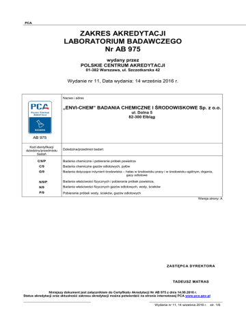 PCA ZAKRES AKREDYTACJI LABORATORIUM BADAWCZEGO Nr AB 975 wydany przez POLSKIE CENTRUM AKREDYTACJI 01-382 Warszawa, ul. Szczotkarska 42 Wydanie nr 11, Data wydania: 14 września 2016 r. Nazwa i adres „ENVI-CHEM” BADANIA CHEMICZNE I ŚRODOWISKOWE Sp. z o.o. ul. Dolna 5 82-300 Elbląg AB xxx AB 975 Kod identyfikacji dziedziny/przedmiotu badań C/9/P Dziedzina/przedmiot badań: Badania chemiczne i pobieranie próbek powietrza C/9 Badania chemiczne gazów odlotowych, pyłów G/9 Badania dotyczące inżynierii środowiska – hałas w środowisku pracy i w środowisku ogólnym, drgania, gazy odlotowe N/9/P Badania właściwości fizycznych i pobieranie próbek powietrza, N/9 Badania właściwości fizycznych gazów odlotowych, wody, ścieków P/9 Pobieranie próbek wody, ścieków, gazów odlotowych Wersja strony: A ZASTĘPCA DYREKTORA TADEUSZ MATRAS Niniejszy dokument jest załącznikiem do Certyfikatu Akredytacji Nr AB 975 z dnia 14.09.2016 r. Status akredytacji oraz aktualność zakresu akredytacji można potwierdzić na stronie internetowej PCA www.pca.gov.pl Wydanie nr 11, 14 września 2016 r. str. 1/6 PCA Zakres akredytacji Nr AB 975 „ENVI-CHEM” Badania Chemiczne i Środowiskowe Sp. z o.o. ul. Dolna 5, 82-300 Elbląg Przedmiot badań/wyrób Środowisko pracy - powietrze Rodzaj działalności/ badane cechy/metoda Pobieranie próbek w celu oceny narażenia zawodowego na: - pyły przemysłowe: frakcja wdychalna frakcja respirabilna - metale frakcja wdychalna frakcja respirabilna - związków organicznych frakcja wdychalna Metoda dozymetrii indywidualnej Metoda stacjonarna Wskaźnik narażenia (z obliczeń) Stężenie pyłu - frakcja wdychalna Zakres: (0,5 - 42) mg/m3 Metoda wagowa Stężenie pyłu - frakcja respirabilna Zakres: (0,3 - 22) mg/m3 Metoda wagowa Stężenie tlenku żelaza w przeliczeniu na Fe: - frakcja respirabilna Zakres: (0,08 - 17) mg/m3 Metoda płomieniowej absorpcyjnej spektrometrii atomowej (FAAS) Stężenie manganu i jego związków nieorg. w przeliczeniu na Mn: - frakcja wdychalna - frakcja respirabilna Zakres: (0,005 - 0,5) mg/m3 Metoda płomieniowej absorpcyjnej spektrometrii atomowej (FAAS) Stężenie miedzi i jej związków nieorg. w przeliczeniu na Cu: - frakcja wdychalna Zakres: (0,007 - 0,95) mg/m3, Metoda płomieniowej absorpcyjnej spektrometrii atomowej (FAAS) Stężenie chromianów i dichromianów w przeliczeniu na Cr (VI) - frakcja wdychalna Zakres: (0,02 - 0,95) mg/m3 Metoda płomieniowej absorpcyjnej spektrometrii atomowej (FAAS) Dokumenty odniesienia PN-Z-04008-7/2002 PN-Z-04008-7/2002/Az1:2004 PN-EN 689:2002 PN-91/Z-04030/05 PN-91/Z-04030/06 PN-Z-04469:2015-10 PN-Z-04472:2015-10/Ap1:2015-12 PN-Z-04106-3:2002 PN-Z-04434:2011 Wersja strony: A Wydanie nr 11, 14 września 2016 r. str. 2/6 PCA Zakres akredytacji Nr AB 975 Przedmiot badań/wyrób Środowisko pracy - pyły Środowisko pracy - hałas Środowisko ogólne - hałas pochodzący od instalacji, urządzeń i zakładów przemysłowych Środowisko pracy − drgania mechaniczne o ogólnym działaniu na organizm człowieka Rodzaj działalności/ Dokumenty odniesienia badane cechy/metoda Zawartość krystalicznej krzemionki w Podstawy i Metody Oceny Środowiska pyle (kwarc, krystobalit) Pracy 2012, nr 4 (74), CIOP Zakres: (0,5 - 100) % Metoda spektrofotometryczna w pod- PB-02 wydanie 1 z dnia 10.02.2014 r. czerwieni (FTIR), technika oznaczeń w pastylkach po mineralizacji Stężenie frakcji respirabilnej krystalicznej krzemionki w powietrzu (kwarc, krystobalit) Zakres: (0,01 - 3) mg/m3 Metoda spektrofotometryczna w podczerwieni, technika oznaczeń w pastylkach po mineralizacji. Równoważny poziom dźwięku A Maksymalny poziom dźwięku A Szczytowy poziom dźwięku C Zakres: (35 - 136) dB Metoda pomiarowa bezpośrednia Poziom ekspozycji na hałas odniesiony do: - 8 godzinnego dobowego wymiaru czasu pracy (z obliczeń) Równoważny poziom dźwięku A Zakres: (35 - 136) dB Metoda pomiarowa bezpośrednia Równoważny poziom dźwięku A dla czasu odniesienia T wyrażony wskaźnikami LAeqD i LAeqN (z obliczeń) Skuteczne ważone częstotliwościowo przyspieszenie drgań Zakres: (0,04 - 120) m/s2 Metoda pomiarowa bezpośrednia Ekspozycja dzienna, wyrażona w postaci równoważnego energetycznie dla 8-godzin działania skutecznego, ważonego częstotliwościowo przyspieszenia drgań, dominującego wśród przyspieszeń drgań, wyznaczonych dla trzech składowych kierunkowych z uwzględnieniem właściwych współczynników (1.4awx, 1.4awy, awz) PN-N-01307:1994 PN-EN ISO 9612:2011 z wyłączeniem metody obejmującej strategię 2 - punkt 10 oraz strategię 3 – punkt 11 Załącznik nr 7 do Rozporządzenia Ministra Środowiska z dnia 30.10.2014 r. (Dz. U. 0, poz. 1542) z wyłączeniem: pkt. E, podpunkt I.1; F PN-EN 14253+A1:2011 Ekspozycja trwająca 30 minut i krócej, wyrażona w postaci skutecznego, ważonego częstotliwościowo przyspieszenia drgań, dominującego wśród przyspieszeń drgań, wyznaczonych dla trzech składowych kierunkowych z uwzględnieniem właściwych współczynników (1.4awx, 1.4awy, awz) (z obliczeń) Wersja strony: B Wydanie nr 11, 14 września 2016 r. str. 3/6 PCA Zakres akredytacji Nr AB 975 Przedmiot badań/wyrób Środowisko pracy − drgania mechaniczne działające na organizm człowieka przez kończyny górne Środowisko pracy - próbki pyłu pobranego na filtry Woda, ścieki Rodzaj działalności/ badane cechy/metoda Skuteczne ważone częstotliwościowo przyspieszenie drgań Zakres: (0,2 - 3000) m/s2 Metoda pomiarowa bezpośrednia Ekspozycja dzienna, wyrażona w postaci równoważnej energetycznie dla 8-godzin działania sumy wektorowej skutecznych, ważonych częstotliwościowo przyspieszeń drgań, wyznaczonych dla trzech składowych kierunkowych (ahwx, ahwy, ahwz) Ekspozycja trwająca 30 minut i krócej, wyrażona w postaci sumy wektorowej skutecznych, ważonych częstotliwościowo przyspieszeń drgań, wyznaczonych dla trzech składowych kierunkowych (ahwx, ahwy, ahwz)