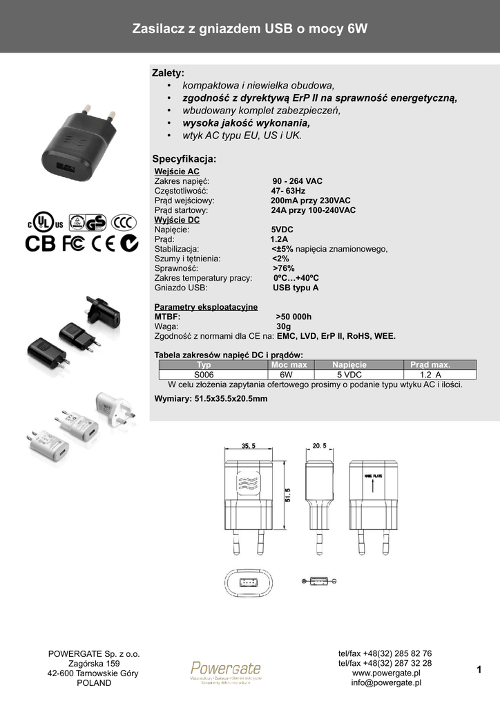 Zasilacz z gniazdem USB o mocy 6W Zalety: • kompaktowa i niewielka obudowa, • zgodność z dyrektywą ErP II na sprawność energetyczną, • wbudowany komplet zabezpieczeń, • wysoka jakość wykonania, • wtyk AC typu EU, US i UK. Specyfikacja: Wejście AC Zakres napięć: Częstotliwość: Prąd wejściowy: Prąd startowy: Wyjście DC Napięcie: Prąd: Stabilizacja: Szumy i tętnienia: Sprawność: Zakres temperatury pracy: Gniazdo USB: 90 - 264 VAC 47- 63Hz 200mA przy 230VAC 24A przy 100-240VAC 5VDC 1.2A <±5% napięcia znamionowego, <2% >76% 0ºC…+40ºC USB typu A Parametry eksploatacyjne MTBF: >50 000h Waga: 30g Zgodność z normami dla CE na: EMC, LVD, ErP II, RoHS, WEE. Tabela zakresów napięć DC i prądów: Typ Moc max Napięcie Prąd max. S006 6W 5 VDC 1.2 A W celu złożenia zapytania ofertowego prosimy o podanie typu wtyku AC i ilości. Wymiary: 51.5x35.5x20.5mm POWERGATE Sp. z o.o. Zagórska 159 42-600 Tarnowskie Góry POLAND tel/fax +48(32) 285 82 76 tel/fax +48(32) 287 32 28 www.powergate.pl [email protected] 1