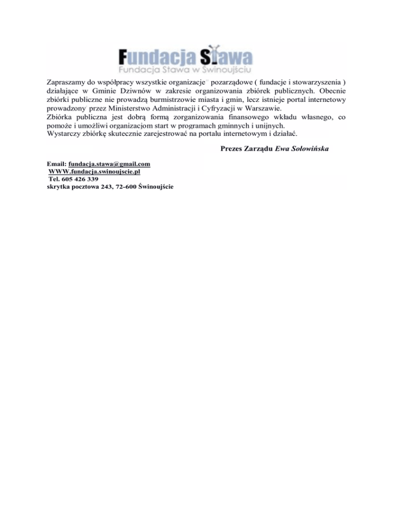 Zapraszamy do współpracy wszystkie organizacje" pozarządowe ( fundacje i stowarzyszenia ) działające w Gminie Dziwnów w zakresie organizowania zbiórek publicznych. Obecnie zbiórki publiczne nie prowadzą burmistrzowie miasta i gmin, lecz istnieje portal internetowy prowadzony' przez Ministerstwo Administracji i Cyfryzacji w Warszawie. Zbiórka publiczna jest dobrą formą zorganizowania finansowego wkładu własnego, co pomoże i umożliwi organizacjom start w programach gminnych i unijnych. Wystarczy zbiórkę skutecznie zarejestrować na portalu internetowym i działać. Prezes Zarządu Ewa Sołowińska Email: [email protected] WWW.fundacja.swinoujscie.pl Tel. 605 426 339 skrytka pocztowa 243, 72-600 Świnoujście