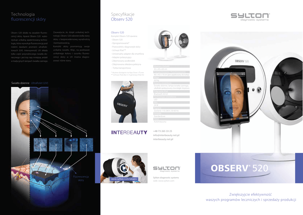 Technologia fluorescencji skóry Specyfikacje Observ 520 Observ 520 działa na zasadzie fluores- Zauważycie, że, dzięki unikalnej tech- Observ 520 cencji skóry. Aparat Observ 520 wyko- nologii, Observ 520 odzwierciedla stany Komplet Observ 520 zawiera: rzystuje unikalną opatentowaną techno- skóry z bezprecedensową wyraźnością - Observ 520 logię, która wywołuje fluorescencję pod i kontrastowością. - Oprogramowanie* niskimi dawkami promieni ultrafiole- Komórki skóry promieniują swoje - Przewodnik z diagnostyki skóry towych (UV). Intensywność UV składa unikalne światło. Więc, na podstawie - Uchwyt iPad ** tylko część przyrodniczego światła sło- unikalnego koloru i rysunku fluores- - Uniwersalny adapter dla smartfona necznego i jest trzy razy mniejsza, aniżeli cencji skóry w UV można diagno- - Adapter polaryzujący w tradycyjnych lampach światła czarnego. zować różne stany. - Zdejmowany podbródek - Zdejmowana składana peleryna - Torba transportowa * AŁatwo dostępne na App Store i iTunes ** Uchwyt iPad dla 3 i 4 generacji iPad Air Światło dzienne Ultrafiolet (UV) Cie mn ep Po lam Nar rfir yn yn as kó y rze Wymiary (DxSxW) 32 x 43 x 63 cm Transportowanie / Przechowywanie 46 × 45 × 19 cm (jest zapakowany do torby) Waga 6,8 kg Reżymy oświetlenia Światło dzienne, lampa światła czarnego, ultrafiolet spolaryzowany równolegle i krzyżowo. Połączenie iPad Bluetooth 4.0 LE Technologia oświetlenia LED Moc 24 W Napięcie Zasilanie 110-240 V, 50-60 Hz Gniazdo Standardowe Timer Automatyczny usz eni e st ruk Łus tur y sk óry zcz en ie s kór +48 73 265 33 25 y [email protected] interbeauty.net.pl The Netherlands tel: +31 (0)40 248 22 92 email: [email protected] Fluorescencja skóry www.sylton.com/observ Sylton diagnostic systems web: www.sylton.com Sylton® диагностические системы и OBSERV® являются зарегистрированными торговыми марками Symae® technologies holding B.V. Охраняется патентом. Спецификация может изменяться без предварительного предупреждения. iPad® и iTunes® являются торговыми марками Apple Inc., зарегистрированными в США и других странах. Air Print™ является торговой маркой Apple Inc. Zwiększyjcie efektywność waszych programów leczniczych i sprzedaży produkcji Pokażcie waszym klientom czego potrzebuje ich skóra D Możliwości diagnozowania Observ 520 z iPad otwiera nowe możliwości zisiaj klienci są dostatecznie poin- Mnóstwo problemów na powierzchni 6 reżimów analizy skóry formowani i mają podniosłe skóry bierze swój początek głęboko oczekiwania od współczesnych kosme- wewnątrz i je trudno diagnozować Observ 520 proponuje pełny system z sześciu różnymi reżimami analizy: tyków. Więc, każdy z waszych klientów nieuzbrojonym okiem. Observ 520 wyja- ma Wizualizujcie stany skóry w detalach Dla studiowania i dokumentowania problemów skóry w bardzo drobnych różnymi wnia te stany dzięki fluoryzowaniu 1. Reżim światła dziennego szczegółach, możecie przełączać reżimy problemami a pewnymi potrzebami i technologiom wizualizacji w świetle 2. Reżim emulacji lampy światła czarnego analizy podczas diagnostyki. Więc, co do jej pielęgnacji. Dlatego głęboka spolaryzowanym. Teraz możecie od razu 3. Reżim ultrafioletowy (UV) potraficie zmienić widmo optyczne analiza skóry jest integralną częścią zidentyfikować stany skóry, podwyższając 4. Reżim polaryzacji równoległej oświetlenia i zwiększać kontrastowość waszego leczenia i konsultacji na orientację klientów, proponując swoje 5. Reżim polaryzacji krzyżowej dla konkretnych patologii. W auto- temat produkcji dla zadowolenia podejścia do leczenia oraz śledzić za 6. Analiza stanu skóry matycznym reżimie system konse- indywidualistycznych efektywnością leczenia za pomocą iPAD. unikalną skórę z potrzeb i Observ 520 ze wsparciem iPad pozwoli wam dokładnie diagnozować typy skóry i problemy, jak na powierzchni, tak i w głę- różnych reżimach w ciągu kilku Stwarzajcie interaktywny porównawczy obraz sekund i zapisuje ich w iPAD dla Utrzymujcie klienta przez nadanie kon- późniejszej analizy. sultacji i sprawozdań z analizy skóry kwentnie zapisuje wszystkie obrazy w oczekiwań waszych klientów. za pomocą poczty elektronicznej czy Mikrorelief i drobne zmarszczki Prowadzenie bazy klientów bokich warstwach skóry. Opatenowana sprawozdań drukowanych. Żeby monitorować i korygować schematy Podział płaszczu hydrolipidowego technologia fluorescencji demonstruje problemy skóry z większą precyzją i kontrastem, w porównaniu z konwen- leczenia, możecie zachowywać klienckie obrazy razem z waszymi zapisami. Observ 520 jest intuicyjny i prosty w użyciu Oprogramowanie Observ 520 może być cjonalnymi technologiami. Więc, możecie Śledźcie dynamikę załadowane bezpośrednio z iTunes czy to wizualnie zademonstrować kliento- Observ 520 ma wbudowaną bazę danych, App Store i gotowe dla użycia z Observ która pozwoli monitorować i wizual- 520 bez późniejszej instalacji. Zarząd izować dynamikę leczenia. Baza pozwoli App jest łatwy, co czyni go lekkim zrobić pełne sprawozdanie z analizy i przyjemnym w użyciu nawet dla skóry przed i po leczeniu dla demon- początkujących użytkownikom tabletów. wi naocznie, obiektywnie i przekonująco. Naruszenie struktury skóry Observ 520 pozwoli wam: Sekrecja i stan pór • Zwiększyć sprzedaży procedur i produkcji stracji wyników klientom. Można go wydrukować lub wysłać na e-mail. • Zwiększyć zadowolenie i lojalność klientów Patologie naczyniowe • Przyciągnąć klientów • Wizualizować klientom postęp w procedurach Patologie pigmentowe Automatyczny zapis serii foto • Zwiększyć swoje doświadczenie Porówn