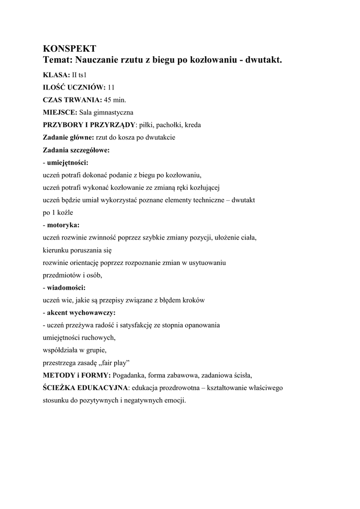 KONSPEKT Temat: Nauczanie rzutu z biegu po kozłowaniu - dwutakt. KLASA: II ts1 ILOŚĆ UCZNIÓW: 11 CZAS TRWANIA: 45 min. MIEJSCE: Sala gimnastyczna PRZYBORY I PRZYRZĄDY: piłki, pachołki, kreda Zadanie główne: rzut do kosza po dwutakcie Zadania szczegółowe: - umiejętności: uczeń potrafi dokonać podanie z biegu po kozłowaniu, uczeń potrafi wykonać kozłowanie ze zmianą ręki kozłującej uczeń będzie umiał wykorzystać poznane elementy techniczne – dwutakt po 1 koźle - motoryka: uczeń rozwinie zwinność poprzez szybkie zmiany pozycji, ułożenie ciała, kierunku poruszania się rozwinie orientację poprzez rozpoznanie zmian w usytuowaniu przedmiotów i osób, - wiadomości: uczeń wie, jakie są przepisy związane z błędem kroków - akcent wychowawczy: - uczeń przeżywa radość i satysfakcję ze stopnia opanowania umiejętności ruchowych, współdziała w grupie, przestrzega zasadę „fair play” METODY i FORMY: Pogadanka, forma zabawowa, zadaniowa ścisła, ŚCIEŻKA EDUKACYJNA: edukacja prozdrowotna – kształtowanie właściwego stosunku do pozytywnych i negatywnych emocji. Tok lekcyjny Nazwa i opis ćwiczenia Czas Uwagi organizacyjne I Część wstępna 1. Moment organizacyjnoporządkowy 2.Rozgrzewka psychomotoryczna II Część główna 1.Realizacja zadań lekcji Zbiórka, powitanie, podanie zadań lekcji Ćwiczenia w truchcie: - na jeden gwizdek- obrót o 360o i bieg dalej - skip A, C - krążenia ramion w tył i przód Ćwiczenia w marszu: - krążenia głowy w prawo i lewą stronę - co trzeci krok skłon T w przód - co trzeci krok, wymach nogi do wyprostowanych rąk - marsz w przysiadzie - luźne podskoki dookoła sali Ćwiczenia w miejscu: - w rozkroku skłony tułowia w przód i tył -skrętoskłony - krążenia tułowia - krążenia bioder, krążenia kolan - w przysiadzie podpartym, wyrzut nóg-10x w tył Ćwiczenia w leżeniu tyłem: - leżenie przewrotne-5x - leżenie na plecach, ramiona w bok, dotykamy prostą nogą do przeciwległej ręki - leżenie przodem, ramiona w bok, dotykamy lewą piętą do prawej dłoni i na odwrót Ćwiczący trzymając piłkę w rękach z ustawienia nóg w pozycji koszykarskiej, wykonują długi krok PN, krótki LN i wyskok w górę; ( ćwiczenia wykonywane najpierw z przeszkodami [skakanki]); - j.w. oddając rzut do kosza; - ćwiczący ustawieni w lekkim rozkroku (stopy równolegle) wykonują kozioł piłki PR z jednoczesnym krokiem LN i dalej j.w. ( ćwiczenia wykonywane najpierw z przeszkodami [skakanki], następnie bez); - ćwiczący ustawieni w odległości od prowadzącego. Wykonują podanie piłki z sprzed klatki piersiowej. Prowadzący xxxxxxxxxxxxxxxx o Rozgrzewkę prowadzi wyznaczony uczeń -Trucht dokoła sali -Marsz dokoła sali - Nauczyciel objaśnia i koryguje błędy. -Uczniowie stoją na obwodzie koła - Nauczyciel objaśnia i koryguje błędy. Nauczyciel pokazuje i objaśnia ćwiczenie; Ćwiczący ustawieni w rzędzie twarzą do kosza; Nauczyciel zwraca uwagę na bezpieczeństwo i dokładne wykonywanie ćwiczeń; Nauczyciel poprawia błędy; trzyma piłkę na wyciągniętej w przód ręce, ćwiczący po kilku krokach truchtu wykonują dwutakt zabierając piłkę z rąk nauczyciela; - ćwiczący wykonują dwutakt po kozłowaniu piłki w marszu; - j.w. w truchcie; - pokaz i objaśnienie; - instruowanie; -Zbiórka, omówienie lekcji, wyróżnienie osób dobrze ćwiczących w czasie zajęć, sprzątnięcie sprzętu, pożegnanie; Zbiórka w szeregu przed nauczycielem, pochwała dla najaktywniej ćwiczących: - pogadanka; - działanie przykładem osobistym; III Część końcowa 1.Moment organizacyjnoporządkowy Prowadzący: Krzysztof Topolański