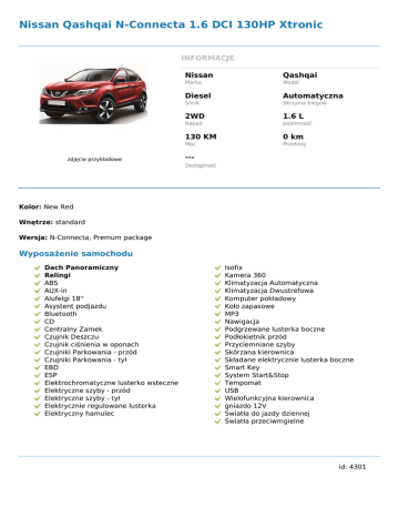 Nissan Qashqai N-Connecta 1.6 DCI 130HP Xtronic INFORMACJE zdjęcie przykładowe Nissan Qashqai Marka Model Diesel Automatyczna Silnik Skrzynia biegów 2WD 1.6 L Napęd pojemność 130 KM 0 km Moc Przebieg --Dostępność Kolor: New Red Wnętrze: standard Wersja: N-Connecta, Premum package Wyposażenie samochodu Dach Panoramiczny Relingi ABS AUX-in Alufelgi 18'' Asystent podjazdu Bluetooth CD Centralny Zamek Czujnik Deszczu Czujnik ciśnienia w oponach Czujniki Parkowania - przód Czujniki Parkowania - tył EBD ESP Elektrochromatyczne lusterko wsteczne Elektryczne szyby - przód Elektryczne szyby - tył Elektrycznie regulowane lusterka Elektryczny hamulec Isofix Kamera 360 Klimatyzacja Automatyczna Klimatyzacja Dwustrefowa Komputer pokładowy Koło zapasowe MP3 Nawigacja Podgrzewane lusterka boczne Podłokietnik przód Przyciemniane szyby Skórzana kierownica Składane elektrycznie lusterka boczne Smart Key System Start&Stop Tempomat USB Wielofunkcyjna kierownica gniazdo 12V Światła do jazdy dziennej Światła przeciwmgielne id: 4301 Powered by TCPDF (www.tcpdf.org)