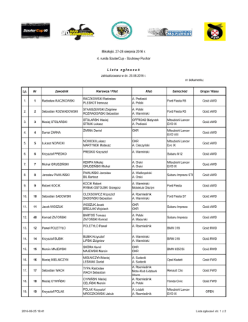 Mikołajki, 27-28 sierpnia 2016 r. 4. runda SzuterCup - Szutrowy Puchar Lista zgłoszeń zaktualizowana w dn. 25.08.2016 r. nr dokumentu: Lp. Nr Zawodnik 1. 1 Radosław RACZKOWSKI RACZKOWSKI Radosław PLESKOT Ireneusz A. Podlaski A. Polski Ford Fiesta R5 Gość AWD 2. 2 Sebastian ROZWADOWSKI STANISZEWSKI Zbigniew ROZWADOWSKI Sebastian A. Polski A. Warmiński Ford Fiesta R5 Gość AWD 3. 3 Maciej STOLARSKI STOLARSKI Maciej STRUK Łukasz OFFROAD Białystok A. Podlaski Mitsubishi Lancer EVO IX Gość AWD 4. 4 Daniel ŻARNA ŻARNA Daniel OKR Mitsubishi Lancer EVO VIII Gość AWD 5. 5 Łukasz NOWICKI NOWICKI Łukasz MARTYNEK Mateusz OKR A. Cieszyński Mitsubishi Lancer Evo IX Gość AWD 6. 6 Krzysztof PREDKO PREDKO Krzysztof A. Warmiński Subaru N12 Gość AWD 7. 7 Michał GRUDZIŃSKI KEMPA Mikołaj GRUDZIŃSKI Michał A. Orski A. Orski Mitsubishi Lancer EVO IX Gość AWD 8. 8 Jarosław PAWLIŃSKI PAWLIŃSKI Jarosław BIL Bartosz A. Wielkopolski A. Orski Subaru Impreza STI Gość AWD 9. 9 Robert KOCIK KOCIK Robert RYBAK-OSTOJSKI Grzegorz A. Warmiński Motoklub Olsztyn Ford Fiesta Gość AWD 10. 10 Sebastian SADOWSKI OLEKSOWICZ Krzysztof SADOWSKI Sebastian A. Rzemieślnik A. Warmiński Ford Fiesta ST Gość AWD 11. 11 Jacek WOSZUK WOSZUK Jacek BREJLAK Wojciech OKR OKR Subaru Impreza Gość AWD 12. 40 Konrad ZATOŃSKI BARTOŚ Tomasz ZATOŃSKI Konrad A. Polski A. Mazurski Subaru Impreza Gość AWD 13. 12 Paweł POLETYŁO POLETYŁO Paweł A. Rzemieślnik BMW 318 Gość RWD 14. 14 Krzysztof BUBIK BUBIK Krzysztof LIPSKI Zbigniew A. Warmiński A. Warmiński BWM 316 Gość RWD 15. 15 Marcin MAJEWSKI SKÓRA Kamil MAJEWSKI Marcin OKR OKR BMW 635CSi Gość RWD 16. 16 Maciej MIELNICZYN MIELNICZYN Maciej LEŚNIAK Daniel A. Sudecki A. Sudecki Opel Kadett Gość FWD 17. 17 Sebastian WACH TYPA Radosław WACH Sebastian Renault Clio Gość FWD 18. 18 Maciej CYWIŃSKI CYWIŃSKI Maciej CELIŃSKI Marcin A. Rzemieślnik Moto-Klub Lidzbark Warm. A. Rzemieślnik A. Polski Honda Civic Gość FWD 19. 19 Krzysztof POLAK POLAK Krzysztof MROCZKOWSKI Jakub A. Łódzki A. Rzemieślnik 2016-08-25 18:41 Kierowca / Pilot Klub Samochód Mitsubishi Lancer EVO IX Grupa / Klasa OPEN Lista zgłoszeń str. 1 z 2 Lp. Nr Zawodnik Kierowca / Pilot Klub Samochód Grupa / Klasa 20. 20 Krzysztof SKIBA SKIBA Krzysztof WYSZKOWSKI Bartek OKR A. Polski Subaru Impreza OPEN 21. 21 Sebastian TETER TETER Sebasian CZUB Fabian A. Kielecki A. Polski Subaru Impreza GT OPEN 22. 22 Marek ROEFLER ROEFLER Marek BAŁA Marek A. Mazurski A. Rzemieślnik Subaru Impreza OPEN 23. 23 Piotr MICHALIK MICHALIK Piotr LESZEK Janusz OKR TKM Polska Mitsubishi Lancer EVO V OPEN 24. 24 Magdalena MILEWSKA SKURACZ Marcin MILEWSKA Magdalena A. Warmiński A. Warmiński Honda Civic K2 25. 25 Sebastian CHRZANOWSKI CHRZANOWSKI Sebastian BINIĘDA Adam A. Warmiński A. Warmiński Honda Civic K2 26. 26 Konrad DUDZIŃSKI DUDZIŃSKI Konrad LIPIŃSKI Przemysław OKR OKR Honda Civic K2 27. 27 Emil KONOPIŃSKI KONOPIŃSKI Emil IWON Konrad A. Warmiński A. Polski Honda Civic K1 28. 28 Bartosz DZIENIS PAJKA DZIENIS Bartosz Stow. 4x4 Sokółka A. Podlaski VW Polo K2 29. 29 Bogdan JANKOWSKI JANKOWSKI Bogdan ROCHNA Grzegorz A. Rzemieślnik A. Rzemieślnik BMW 318 K1 30. 30 Maciej ABRAMOWICZ ABRAMOWICZ Maciej ZAKRZEWSKI Marek A. Podlaski A. Podlaski Opel Astra GSI K1 31. 31 Alicja GNATOWSKA NAZARUK Krzysztof GNATOWSKA Alicja A. Podlaski A. Polski Seat Ibiza K1 32. 32 Karol SZUMSKI SZUMSKI Karol GORĄCY Dominik A. Podlaski OKR Suzuki Swift Sport K2 33. 33 Ewa LITWIŃCZUK LITWIŃCZUK Ewa KACZMAREK Marek A. Podlaski A. Rzemieślnik Seat Ibiza K1 34. 34 Krzysztof BRZOZOWSKI BRZOZOWSKI Krzysztof Szadzio A. Morski A. Morski Opel Kadett K1 35. 35 Martyna MROZOWSKA DUDZIŃSKI Patryk MROZOWSKA Martyna OKR OKR Opel Astra K1 36. 36 Paweł LATOS LATOS Paweł A. Polski Honda Civic Type R K1 37. 37 Jacek PAJĄCZKOWSKI PAJĄCZKOWSKI Jacek KALINOWSKI Dominik A. Polski A. Polski Opel Astra K1 38. 38 Wiktor MATUSZEWSKI MATUSZEWSKI Wiktor SZYMKÓW Joanna A. Polski A. Polski Honda Civic VTI K2 Dyrektor Rajdu Krzysztof Szeszko 2016-08-25 18:41 Lista zgłoszeń str. 2 z 2