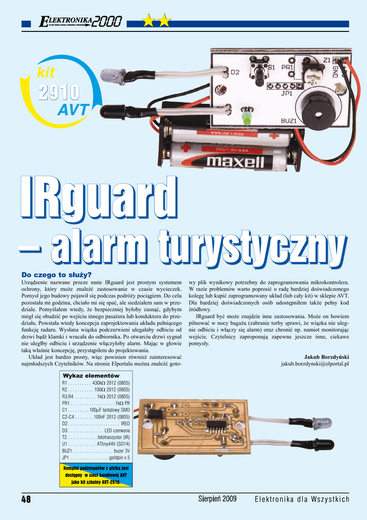 2910 IRguard – alarm turystyczny Do czego to służy? Urządzenie nazwane przeze mnie IRguard jest prostym systemem ochrony, który może znaleźć zastosowanie w czasie wycieczek. Pomysł jego budowy pojawił się podczas podróży pociągiem. Do celu pozostała mi godzina, chciało mi się spać, ale siedziałem sam w przedziale. Pomyślałem wtedy, że bezpieczniej byłoby zasnąć, gdybym mógł się obudzić po wejściu innego pasażera lub konduktora do przedziału. Powstała wtedy koncepcja zaprojektowania układu pełniącego funkcję radaru. Wysłana wiązka podczerwieni ulegałaby odbiciu od drzwi bądź klamki i wracała do odbiornika. Po otwarciu drzwi sygnał nie uległby odbiciu i urządzenie włączyłoby alarm. Mając w głowie taką właśnie koncepcję, przystąpiłem do projektowania. Układ jest bardzo prosty, więc powinien również zainteresować najmłodszych Czytelników. Na stronie Elportalu można znaleźć goto- wy plik wynikowy potrzebny do zaprogramowania mikrokontrolera. W razie problemów warto poprosić o radę bardziej doświadczonego kolegę lub kupić zaprogramowany układ (lub cały kit) w sklepie AVT. Dla bardziej doświadczonych osób udostępniłem także pełny kod źródłowy. IRguard być może znajdzie inne zastosowania. Może on bowiem pilnować w nocy bagażu (zabranie torby sprawi, że wiązka nie ulegnie odbiciu i włączy się alarm) oraz chronić np. namiot monitorując wejście. Czytelnicy zaproponują zapewne jeszcze inne, ciekawe pomysły. Jakub Borzdyński [email protected] Wykaz elementów R1 . . . . . . . . . . 430kΩ 2012 (0805) R2 . . . . . . . . . . . 100Ω 2012 (0805) R3,R4 . . . . . . . . . 1kΩ 2012 (0805) PR1 . . . . . . . . . . . . . . . . . . . 1kΩ PR C1 . . . . . . . . . 100µF tantalowy SMD C2-C4 . . . . . . . . 100nF 2012 (0805) D2 . . . . . . . . . . . . . . . . . . . . . . IRED D3 . . . . . . . . . . . . . . . LED czerwona T2 . . . . . . . . . . . . .fototranzystor (IR) U1 . . . . . . . . . . . . ATtiny44V (SO14) BUZ1 . . . . . . . . . . . . . . . . . buzer 3V JP1 . . . . . . . . . . . . . . . . .goldpin x 5 Komplet podzespołów z płytką jest dostępny w sieci handlowej AVT jako kit szkolny AVT-2910. 48 Sierpieñ 2009 E l e k t r o n i k a d l a Ws z y s t k i c h