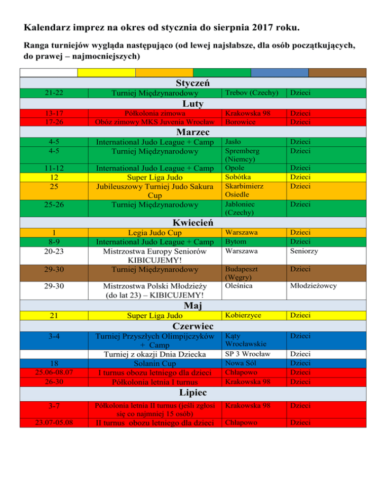 Kalendarz imprez na okres od stycznia do sierpnia 2017 roku. Ranga turniejów wygląda następująco (od lewej najsłabsze, dla osób początkujących, do prawej – najmocniejszych) Styczeń 21-22 Turniej Międzynarodowy Trebov (Czechy) Dzieci Krakowska 98 Borowice Dzieci Dzieci Jasło Spremberg (Niemcy) Opole Sobótka Skarbimierz Osiedle Jabloniec (Czechy) Dzieci Dzieci Warszawa Bytom Warszawa Dzieci Dzieci Seniorzy Budapeszt (Węgry) Oleśnica Dzieci Kobierzyce Dzieci Kąty Wrocławskie SP 3 Wrocław Nowa Sól Chłapowo Krakowska 98 Dzieci Luty 13-17 17-26 Półkolonia zimowa Obóz zimowy MKS Juvenia Wrocław Marzec 4-5 4-5 International Judo League + Camp Turniej Międzynarodowy 11-12 12 25 International Judo League + Camp Super Liga Judo Jubileuszowy Turniej Judo Sakura Cup Turniej Międzynarodowy 25-26 Dzieci Dzieci Dzieci Dzieci Kwiecień 1 8-9 20-23 29-30 29-30 Legia Judo Cup International Judo League + Camp Mistrzostwa Europy Seniorów KIBICUJEMY! Turniej Międzynarodowy Mistrzostwa Polski Młodzieży (do lat 23) – KIBICUJEMY! Młodzieżowcy Maj 21 Super Liga Judo Czerwiec 3-4 18 25.06-08.07 26-30 Turniej Przyszłych Olimpijczyków + Camp Turniej z okazji Dnia Dziecka Solanin Cup I turnus obozu letniego dla dzieci Półkolonia letnia I turnus Dzieci Dzieci Dzieci Dzieci Lipiec 3-7 Półkolonia letnia II turnus (jeśli zgłosi się co najmniej 15 osób) Krakowska 98 Dzieci 23.07-05.08 II turnus obozu letniego dla dzieci Chłapowo Dzieci