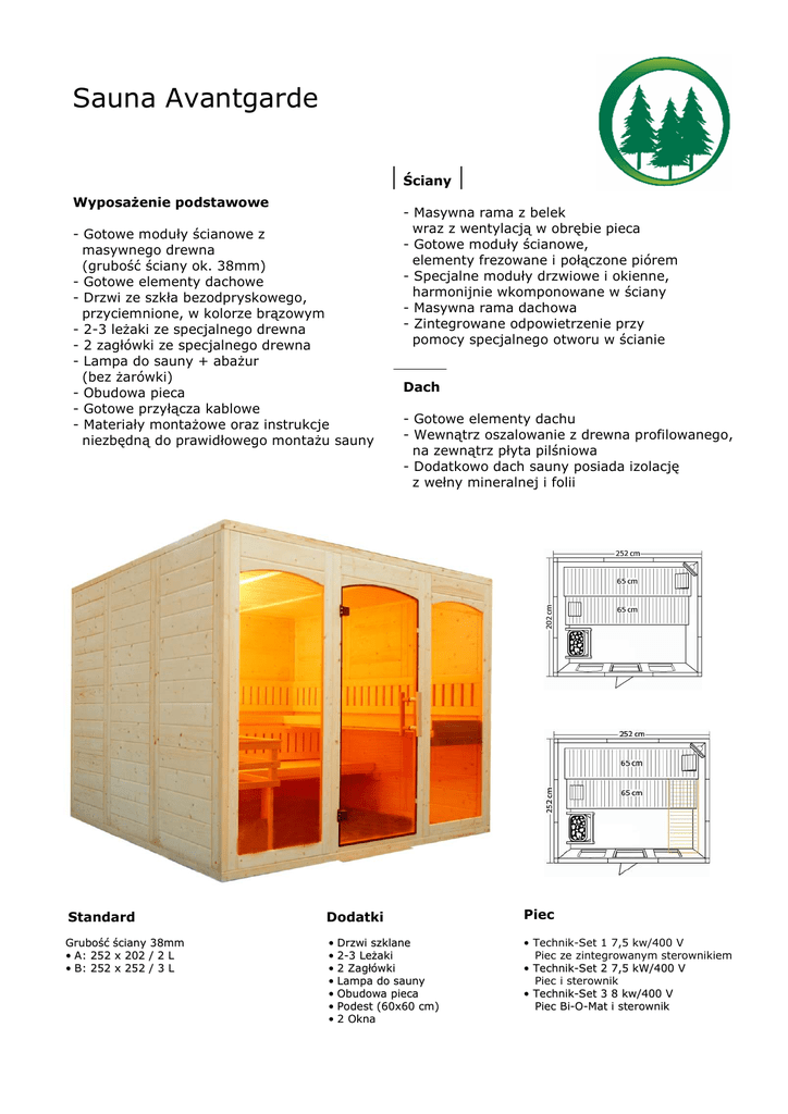 Sauna Avantgarde Ściany WyposaŜenie podstawowe - Gotowe moduły ścianowe z masywnego drewna (grubość ściany ok. 38mm) - Gotowe elementy dachowe - Drzwi ze szkła bezodpryskowego, przyciemnione, w kolorze brązowym - 2-3 leŜaki ze specjalnego drewna - 2 zagłówki ze specjalnego drewna - Lampa do sauny + abaŜur (bez Ŝarówki) - Obudowa pieca - Gotowe przyłącza kablowe - Materiały montaŜowe oraz instrukcje niezbędną do prawidłowego montaŜu sauny - Masywna rama z belek wraz z wentylacją w obrębie pieca - Gotowe moduły ścianowe, elementy frezowane i połączone piórem - Specjalne moduły drzwiowe i okienne, harmonijnie wkomponowane w ściany - Masywna rama dachowa - Zintegrowane odpowietrzenie przy pomocy specjalnego otworu w ścianie Dach - Gotowe elementy dachu - Wewnątrz oszalowanie z drewna profilowanego, na zewnątrz płyta pilśniowa - Dodatkowo dach sauny posiada izolację z wełny mineralnej i folii Standard Dodatki Piec Grubość Grubość ściany 38mm • A: 252 252 x 202 202 / 2 L • B: 252 252 x 252 252 / 3 L • Drzwi szklane • 2-3 LeŜ LeŜaki • 2 Zagł Zagłówki • Lampa do sauny • Obudowa pieca • Podest (60x60 cm) • 2 Okna • Technik-Set 1 7,5 kw/400 V Piec ze zintegrowanym sterownikiem • TechnikTechnik-Set 2 7,5 kW/400 V Piec i sterownik • TechnikTechnik-Set 3 8 kw/400 V Piec BiBi-O-Mat i sterownik