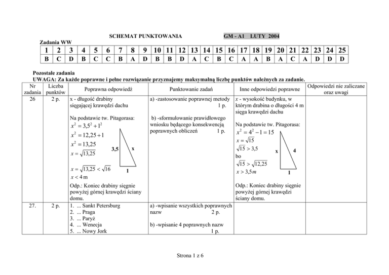 SCHEMAT PUNKTOWANIA GM - A1 LUTY 2004 Zadania WW 1 2 3 4 5 6 7 8 9 10 11 12 13 14 15 16 17 18 19 20 21 22 23 24 25 B C D B C C B A D B B D A C B C A A B A C A D D D Pozostałe zadania UWAGA: Za każde poprawne i pełne rozwiązanie przyznajemy maksymalną liczbę punktów należnych za zadanie. Nr Liczba Odpowiedzi nie zaliczane Poprawna odpowiedź Punktowanie zadań Inne odpowiedzi poprawne zadania punktów oraz uwagi 26 2 p. x - długość drabiny a) -zastosowanie poprawnej metody x - wysokość budynku, w sięgającej krawędzi dachu 1 p. którym drabina o długości 4 m sięga krawędzi dachu Na podstawie tw. Pitagorasa: b) -sformułowanie prawidłowego wniosku będącego konsekwencją Na podstawie tw. Pitagorasa: x 2 = 3,52 + 12 poprawnych obliczeń 1 p. x 2 = 42 − 1 = 15 2 x = 12,25 + 1 x 2 = 13,25 x = 13,25 x = 13,25 < 16 x < 4m 27. 2 p. x = 15 15 > 3,5 bo 15 > 12,25 x > 3,5 m x 3,5 1 Odp.: Koniec drabiny sięgnie powyżej górnej krawędzi ściany domu. 1. ... Sankt Petersburg 2. ... Praga 3. ... Paryż 4. ... Wenecja 5. ... Nowy Jork 4 x 1 Odp.: Koniec drabiny sięgnie powyżej górnej krawędzi ściany domu. a) -wpisanie wszystkich poprawnych nazw 2 p. b) -wpisanie 4 poprawnych nazw 1 p. Strona 1 z 6 28. 29. 3 p. 2 p. V0 = 20 m/s m = 1200 kg F =? F = m⋅a Vk = V0 − at Vk = 0 V a= 0 t V F = m⋅ 0 t 1200 ⋅ 20 F= 5 m ⎡ ⎤ ⎢ kg ⋅ s ⎥ kg ⋅ m = N⎥ = ⎢ 2 s ⎢ s ⎥ ⎢⎣ ⎥⎦ F = 4800 N F = 4,8 kN Odp.: Wartość siły oporu wynosi 4,8 kN. a) -poprawna metoda obliczania siły W obliczeniach jednostki oporu (zastosowanie II zasady stosowane są poprawnie lub dynamiki Newtona) 1 p. mogą być pominięte 280 + 14 ⋅ 2 ⋅ 35 = 280 + 980 = 1260 zł a) -poprawnie ułożone wyrażenie (wyrażenia) arytmetyczne 1p. Odp.: Rodzina zapłaci 1260 zł. b) - poprawny wynik z jednostką 1p. -zapisanie wzoru F = m⋅a 1 p. b) -poprawna metoda obliczania przyspieszenia 1 p. c) -poprawne obliczenia (w tym prawidłowe stosowanie jednostek) i poprawny wynik z jednostką 1 p. Strona 2 z 6 14 ⋅ 2 ⋅ 35 = 980 zł 280 + 980 = 1260 zł Jeżeli uczeń zapisze: 14 ⋅ 35 = 490 ⋅ 2 = = 980 + 280 = 1260 zł otrzymuje, a) - 0 p. b) - 1 p. Za podanie samej odpowiedzi 0 p. 30. 31. 2 p. 3 p. x - liczba dni, x ∈ N + y - koszt wynajmu y = 280 + 3 ⋅ 35 x Metoda I x - ilość dni, na które rodzina może wynająć apartament 280 + 5 ⋅ 35 ⋅ x ≤ 2200 , x ∈ N 175 ⋅ x < 1920 / : 175 x < 10,97... x = 10 a) -opisanie zmiennych b) -ułożenie wzoru funkcji 1 p. x - liczba dni y - koszt wynajmu 1 p. y = 105 x + 280 a) -poprawna metoda (nierówność lub równanie lub logiczny ciąg obliczeń) 1 p. b) -poprawne obliczenia 1 p. c) -poprawnie określona liczba dni 1 p. Odp.: Rodzina może wynająć apartament na 10 dni. Metoda II 35 ⋅ 5 = 175 koszt 1 dnia pobytu dla 5 osób (bez opłaty) 2200 − 280 = 1920 zł 1920 170 = 10 ≈ 10,97 175 175 Metoda III (poszukiwania rozwiązania) Za 5 dni pobytu: 280 + 5 ⋅ 5 ⋅ 35 = 1155 zł Za 8 dni pobytu: 280 + 8 ⋅ 5 ⋅ 35 = 1680 zł Za 10 dni pobytu: 280 + 10 ⋅ 5 ⋅ 35 = 2030 zł Za 11 dni pobytu: 280 + 11 ⋅ 5 ⋅ 35 = 2205 zł Odp.: Rodzina może wynająć apartament na 10 dni. Jeżeli uczeń wykona co najmniej 3 próby i udzieli prawidłowej odpowiedzi otrzymuje 3 p. Za odgadnięcie wyniku, sprawdzenie, czy jest właściwy i udzielenie prawidłowej odpowiedzi uczeń otrzymuje: a) - 0 p. b) - 1 p. c) - 1 p. Odp.: Rodzina może wynająć apartament na 10 dni. Strona 3 z 6 280 + 3 ⋅ 35 x 32. 33. 3 p. 2 p. wyjazd z Frankfurtu - godzina 7.00 a) -prawidłowo odczytane dane 1p. przyjazd do Stuttgartu - godzina 11.00 b) -poprawna metoda 1p. t - czas jazdy, t = 4 h v - średnia prędkość, v = 80 km/h c) -poprawny wynik z jednostką 1p. s - przebyta droga s v = ⇒ s = v ⋅t t ⎤ ⎡ km s = 80 ⋅ 4 ⎢ ⋅ h = km⎥ ⎦ ⎣ h s = 320 km Odp.: Autokar pokonał drogę 320 km. x - ilość zużytego paliwa na całej trasie 1p. W obliczeniach jednostki stosowane są poprawnie lub b) -poprawny wynik z jednostką 1p. mogą być pominięte Jeżeli uczeń zapisze: 30 ⋅ 1040 x= 100 x = 312 l koszt = 312 l ⋅ 3,2 zł (błąd w zapisie jednostek) koszt = 998,40 zł, otrzymuje: a) - 0 p. b) - 1 p. koszt = 312 ⋅ 3,2 = 998,40 zł Odp.: Koszt zużytego paliwa jest równy 998,40 zł. 2 p. a) - 0p. b) - 1p. c) - 1p. a) -poprawna metoda 30 l 100 km xl 1040 km 30 ⋅ 1040 x= 100 x = 312 l 34. Jeżeli uczeń odczytuje czas jazdy autokaru np. 4 godziny i 10 minut i następnie oblicza 1 1 s = 80 ⋅ 4 = 333 km, 6 3 otrzymuje: x -ilość wody morskiej a) -poprawna metoda 30% wody morskiej to sól 0,3 ⋅ x = 0,6 b) -poprawny wynik z jednostką Strona 4 z 6 1p. x - ilość wody morskiej (roztworu) 1p. 100% roztworu - 30% soli x kg roztworu - 0,6 kg soli 100 ⋅ 0,6 30 x = 2 kg x = 0,6 : 0,3 x = 2 kg 35. 4 p. Odp.: Potrzeba 2 kg wody morskiej Metoda I Vc - objętość cegły Vm - objętość muru (wraz z zaprawą) V - objętość cegieł w murze n - liczba cegieł potrzebnych do budowy muru Vc = 6 ⋅ 12 ⋅ 25 = 1800 cm3 Vm = 25 ⋅ 200 ⋅ 450 Vm = 2250000 cm3 V = 0,8 ⋅ 2250000 V = 1800000 cm3 1800000 n= = 1000 1800 Odp.: Trzeba kupić 1000 cegieł. Metoda II Pc - pole powierzchni ściany cegły o wymiarach 6 cm×12 cm Pm - pole powierzchni muru (wraz z zaprawą) P - pole powierzchni cegieł w murze n - liczba cegieł potrzebnych do budowy muru x= Punktacja rozwiązania metodą I: a) -poprawna metoda obliczania objętości jednej cegły (Vc) lub objętości muru (Vm) 1 p. b) -poprawna metoda obliczania objętości cegieł potrzebnych do budowy muru (V) 1 p. c) -poprawna metoda obliczania liczby cegieł potrzebnych do budowy muru (n) 1 p. d) -poprawne obliczenia (w tym prawidłowe stosowanie jednostek) i poprawny wynik 1 p. Punktacja rozwiązania metodą II: a) -poprawna metoda obliczania pola powierzchni jednej ściany cegły (Pc) 1 p. b) -poprawna metoda obliczania pola powierzchni cegieł potrzebnych do budowy muru (V) 1 p. Strona 5 z 6 W obliczenia