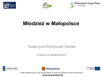 Młodzież w Małopolsce Katarzyna Antończak-Świder Kraków, 22 kwietnia 2015 Projekt współfinansowany przez Unię Europejską w ramach Europejskiego Funduszu Społecznego www.wup-krakow.pl Zagadnienia – młodzi na rynku pracy Demografia Sytuacja zawodowa młodych edukacja praca bezrobocie Wsparcie dla młodych w latach 2015-2020 Młode województwo … Udział osób w wieku 0-29 w ogóle ludności 33,6% 35,2% 37% Udział osób w wieku 15-29 w ogóle ludności 17,9% 20,2% 21,2% … ale się starzeje 0-18 19-24 25-29 2035 2034 2033 2032 2031 2030 2029 2028 2027 2026 2025 2024 2023 2022 2021 2020 2019 2018 2017 2016 2015 2014 2013 2012 2011 2010 2009 2008 2007 Prognoza demograficzna 1400000 1200000 1000000 800000 600000 400000 200000 0 uczą się pracują i uczą się pracują nie pracują i nie uczą się (NEET) Italy Bulgaria Croatia Greece 62% Spain 18% Romania 18% Ireland 12% Hungary 12% Slovakia 8% EU28 60% Portugal 80% Poland Belgium UK France Finland Lithuania Slovenia Czech Austria Sweden Germany Denmark Norway Netherlands Co robią młodzi w wieku 15-24 lata? 100% 14% 40% 55% 20% 0% Zaangażowanie w edukację bez zmian 70% 64% 62% 60% 50% 40% 30% 20% 10% 0% 2005 2006 2007 2008 2009 2010 2011 2012 2013 2014 Odsetek osób w wieku 15-24, które uczą się w ogóle osób w wieku 15-24 Zdobywają wykształcenie ponadgimnazjalne 16% 14% 15,7% 11,1% 12% 10% 8% UE 5,3% 5,4% 6% 4% 2% 3,3% 3,8% Polska Małopolska 0% 2005 2006 2007 2008 2009 2010 2011 2012 2013 2014 Odsetek osób w wieku 18-24 lata, które skończyły naukę na poziomie gimnazjum lub niższym i nie kontynuują edukacji Po gimnazjum do technikum 100% 19,3 18,8 18,5 19,1 18,3 18,6 18,1 33,7 32,2 33,0 33,9 36,2 37,7 39,0 2,5 2,0 1,5 1,0 44,5 47,0 80% 60% technikum liceum profilowane 40% 20% zasadnicza szkoła zawodowa 47,0 46,1 45,5 43,2 42,9 liceum ogólnokształcące 0% Po szkole zawodowej do pracy 100% 10% 20% 9% nie pracują i nie uczą się (NEETs) 25% uczą się 80% 60% 30% pracują i uczą się 40% 18% 57% 20% pracują 32% 0% po roku od ukończenia szkoły po 4 latach od ukończenia szkoły Sytuacja zawodowa absolwentów szkół zawodowych (technikum, zasadnicza, policealna) Po szkole do… urzędu pracy 60% 56% 50% 47% 40% szkoły policealne 33% 30% 20% wyższe licea ogólnokształcące 32% średnie zawodowe 19% 20% 13% 10% zasadnicze szkoły zawodowe 10% 7% 9% 0% 2006 2007 2008 2009 2010 2011 2012 Absolwenci zarejestrowani w PUP w ogóle absolwentów kończących szkołę w danym roku Raz zarejestrowani wracają do urzędu Jednokrotnie bezrobotni, wyrejestrowani, pod opieką PUP ponad 2 lata 3% 2% Jednokrotnie bezrobotni, wyrejestrowani, pod opieką PUP od roku do 2 lat 6% 7% Jednokrotnie bezrobotni, wyrejestrowani, pod opieką PUP od 6 m-cy do roku 9% Jednokrotnie bezrobotni, wyrejestrowani, pod opieką PUP od 3 do 6 m-cy 7% 11% Jednokrotnie bezrobotni, wyrejestrowani, pod opieką PUP do 3 m-cy 9% 15% 16% Powracający bezrobotni pod opieką PUP ponad 2 lata 52% 35% Powracający bezrobotni pod opieką PUP od roku do 2 lat Powracający bezrobotni pod opieką PUP do roku 9% 9% niewyższe 4% 6% 0% wyższe 10% 20% 30% 40% 50% 60% Poprawia się sytuacja młodych – spada stopa bezrobocia 2014 rok UE – 21,9% PL – 23,9% 2013 rok UE – 23,5% PL – 27,3% Stopa bezrobocia młodych w wieku 15-24 lata Zmniejsza się odsetek NEET (15-24) 20% 18% 15% 16% EU28 13% 12% 11% 10% Poland Malopolskie 5% 2014 2013 2012 2011 2010 2009 2008 2007 2006 2005 2004 2003 2002 0% Nie pracują i nie uczą się (ang. not in employment, education or training) Zróżnicowana grupa chcą pracować i szukają pracy chcą pracować, ale nie mogą (zdrowie, sytuacja rodzinna itp.) nie chcą pracować Gwarancje dla młodzieży Idea Zapewnienie młodym ludziom dobrej jakości oferty zatrudnienia, dalszego kształcenia, przyuczenia do zawodu lub stażu w ciągu czterech miesięcy od pozostawania bez pracy lub zakończenia kształcenia formalnego. Adresaci osoby młode w wieku 15-29 lat bez pracy, w tym w szczególności osoby, które nie uczestniczą w kształceniu i szkoleniu (NEET) Dobrej jakości praca Umowa o pracę – co najmniej 3 miesiące Umowa cywilnoprawna: Czas: minimum 3 miesiące Wynagrodzenie: co najmniej 3 x płaca minimalna Uwzględnia składki zdrowotne i ubezpieczeniowe Umowa o dzieło bez określonego czasu: Wynagrodzenie: co najmniej 3 x płaca minimalna Program Strategiczny Kapitał Intelektualny i Rynek Pracy Zdobywanie doświadczenia w środowisku pracy • Praktyki, staże, wolontariat, prace sezonowe Wybór zawodu zgodnie z możliwościami i • Poradnictwo edukacyjne zainteresowaniami Przygotowanie do wejścia • Poradnictwo zawodowe na rynek pracy Zindywidualizowana pomoc grupom szczególnym • Osoby młode, rodzice, osoby niepełnosprawne Wspólne problemy osób młodych Niewielkie doświadczenie zawodowe/w pracy lub jego brak, Niewystarczające umiejętności poszukiwania pracy, Kompetencje nie są w pełni dostosowane do potrzeb rynku pracy, Niskie zarobki i mała atrakcyjność ofert pracy, Niewielka liczba ofert pracy dla osób bez doświadczenia zawodowego, Stereotypy młodego, niedoświadczonego pracownika. Specyficzne problemy osób młodych Osoby niepełnosprawne Niedostosowanie miejsc pracy do potrzeb osób z niepełnosprawnością Różne problemy osób niepełnosprawnych w zależności od typu i stopnia niepełnosprawności Automarginalizacja, często wynikająca z niskiej samooceny Młodzi rodzice Wypadanie z rynku pracy ze względu na długotrwały brak kontaktu z pracą Potrzeba zapewnienia opieki nad dzieckiem Studenci Niewystarczająca wiedza o realiach rynku pracy i konsekwencjach wyborów edukacyjnych Niska świadomość realiów pracy w danym zawodzie Specyficzne problemy osób młodych Mieszkańcy peryferyjnych obszarów wiejskich Osoby opuszczające pieczę zastępczą i ośrodki wychowawcze Mała liczba pozarolniczych miejsc pracy na obszarach wiejskich, Utrudniony dojazd do miejscowości oferuj