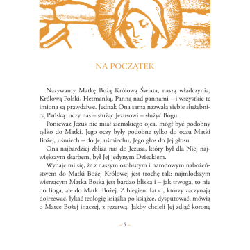 NA POCZĄTEK Nazywamy Matkę Bożą Królową Świata, naszą władczynią, Królową Polski, Hetmanką, Panną nad pannami – i wszystkie te imiona są prawdziwe. Jednak Ona sama nazwała siebie służebnicą Pańską: uczy nas – służąc Jezusowi – służyć Bogu. Ponieważ Jezus nie miał ziemskiego ojca, mógł być podobny tylko do Matki. Jego oczy były podobne tylko do oczu Matki Bożej, uśmiech – do Jej uśmiechu, Jego głos do Jej głosu. Ona najbardziej zbliża nas do Jezusa, który był dla Niej największym skarbem, był Jej jedynym Dzieckiem. Wydaje mi się, że z naszym osobistym i narodowym nabożeństwem do Matki Bożej Królowej jest trochę tak: najmłodszym wierzącym Matka Boska jest bardzo bliska i – jak trwoga, to nie do Boga, ale do Matki Bożej. Z biegiem lat ci, którzy zaczynają dojrzewać, łykać teologię książka po książce, dysputować, mówią o Matce Bożej inaczej, z rezerwą. Jakby chcieli Jej zdjąć koronę –5– i założyć czapkę niewidkę. Potem, po latach, ci, którzy już dojrzeli, najedli się teologii, powracają do bezpośredniej modlitwy do Matki Bożej. Chociaż już wszystko zobaczyli i stawiają Jezusa na pierwszym miejscu, w Matce Najświętszej widzą karetkę pogotowia ratunkowego. –6– POWRACAMY Z Matką Boską jest tak najpierw bliska najbliższa jak choinka opłatek gwiazdka mama, mamusia, matka potem teologia tłumaczy sercu że Pan Jezus na pierwszym miejscu lata biegną samotność wieczność powracamy do Niej jak dziecko –7– Niech nas nie dziwi, że w życiu ludzi skażonych grzechem pierworodnym, nawet wprowadzonych na drogę Chrystusa, jest ciągłe zmaganie się z grzechem w tęsknocie za świętością. Gdyby ktoś posądził Matkę Bożą o jakikolwiek grzech – bylibyśmy oburzeni, widzielibyśmy w nim bluźniercę, tego, który brudnym paluchem pragnie skazić najczystszy śnieg, który chce przysłonić chmurą słońce. W tej intuicyjnej postawie, nigdzie niewyuczonej, kryje się nasza wiara w Niepokalane Poczęcie Matki Bożej. Jesteśmy inni niż Ona. My walczymy z grzechem – Ona nie miała grzechu. Grzech wstydził się być grzechem przy Tej, która cała wzrastała w świętości jako arcydzieło łaski Bożej i kawałek raju na ziemi. –9– ŁASKI PEŁNA Teologia naukowo uzasadnia tajemnicę Niepokalanego Poczęcia Matki Bożej. Powstało na ten temat wiele bardzo mądrych książek, toczyło się wiele dyskusji. Myślę jednak, że lud Boży, który tak cierpliwie powtarza na Różańcu świętym „łaski pełna” – na zdrowy rozum, bez patrzenia w teologię, pojmuje, że Bóg, który uczynił Maryję matką Chrystusa, dał Jej wszystkie możliwe łaski, w tym tę największą: przyszła na świat nieskażona grzechem pierworodnym. W życiu świętych grzechy nas smucą, ale nie dziwią. Wiemy, że Święty Paweł, jeszcze jako Szaweł, grzeszył gniewem – gniewał się na chrześcijan. Święty Augustyn w Wyznaniach pisze o sobie, że prowadził nieuporządkowane życie, Święta Teresa Wielka przyznała, że czasami była awanturnicą, ale potem jej to przechodziło. –8–