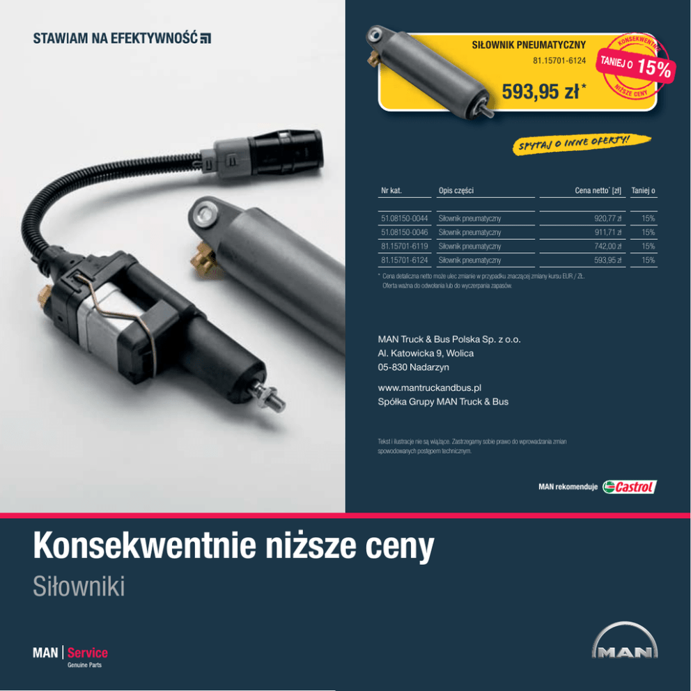 SIŁOWNIK PNEUMATYCZNY 81.15701-6124 15% 593,95 zł * Nr kat. Opis części Cena netto* [zł] Taniej o 51.08150-0044 51.08150-0046 Siłownik pneumatyczny 920,77 zł 15% Siłownik pneumatyczny 911,71 zł 15% 81.15701-6119 Siłownik pneumatyczny 742,00 zł 15% 81.15701-6124 Siłownik pneumatyczny 593,95 zł 15% * Cena detaliczna netto może ulec zmianie w przypadku znaczącej zmiany kursu EUR / ZŁ. Oferta ważna do odwołania lub do wyczerpania zapasów. MAN Truck & Bus Polska Sp. z o.o. Al. Katowicka 9, Wolica 05-830 Nadarzyn www.mantruckandbus.pl Spółka Grupy MAN Truck & Bus Tekst i ilustracje nie są wiążące. Zastrzegamy sobie prawo do wprowadzania zmian spowodowanych postępem technicznym. MAN rekomenduje Konsekwentnie niższe ceny Siłowniki