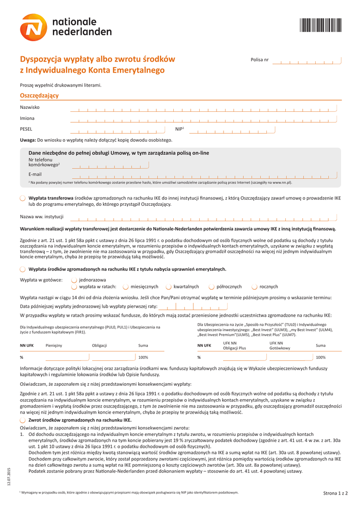*C036* Dyspozycja wypłaty albo zwrotu środków z Indywidualnego Konta Emerytalnego Polisa nr Proszę wypełnić drukowanymi literami. Oszczędzający Nazwisko Imiona PESEL NIP1 Uwaga: Do wniosku o wypłatę należy dołączyć kopię dowodu osobistego. Dane niezbędne do pełnej obsługi Umowy, w tym zarządzania polisą on-line Nr telefonu komórkowego2 E-mail 2 Na podany powyżej numer telefonu komórkowego zostanie przesłane hasło, które umożliwi samodzielne zarządzanie polisą przez Internet (szczegóły na www.nn.pl). n Wypłata transferowa środków zgromadzonych na rachunku IKE do innej instytucji finansowej, z którą Oszczędzający zawarł umowę o prowadzenie IKE lub do programu emerytalnego, do którego przystąpił Oszczędzający. Nazwa ww. instytucji Warunkiem realizacji wypłaty transferowej jest dostarczenie do Nationale‑Nederlanden potwierdzenia zawarcia umowy IKE z inną instytucją finansową. Zgodnie z art. 21 ust. 1 pkt 58a ppkt c ustawy z dnia 26 lipca 1991 r. o podatku dochodowym od osób fizycznych wolne od podatku są dochody z tytułu oszczędzania na indywidualnym koncie emerytalnym, w rozumieniu przepisów o indywidualnych kontach emerytalnych, uzyskane w związku z wypłatą transferową – z tym, że zwolnienie nie ma zastosowania w przypadku, gdy Oszczędzający gromadził oszczędności na więcej niż jednym indywidualnym koncie emerytalnym, chyba że przepisy te przewidują taką możliwość. n Wypłata środków zgromadzonych na rachunku IKE z tytułu nabycia uprawnień emerytalnych. Wypłata w gotówce: n jednorazowa n wypłata w ratach: n miesięcznych n kwartalnych n półrocznych n rocznych Wypłata nastąpi w ciągu 14 dni od dnia złożenia wniosku. Jeśli chce Pan/Pani otrzymać wypłatę w terminie późniejszym prosimy o wskazanie terminu: Data późniejszej wypłaty jednorazowej lub wypłaty pierwszej raty: W przypadku wypłaty w ratach prosimy wskazać fundusze, do których mają zostać przeniesione jednostki uczestnictwa zgromadzone na rachunku IKE: Dla Indywidualnego ubezpieczenia emerytalnego (PUL0, PUL1) i Ubezpieczenia na życie z funduszem kapitałowym (FIR1). Dla Ubezpieczenia na życie „Sposób na Przyszłość” (TUL0) i Indywidualnego ubezpieczenia inwestycyjnego: „Best Invest” (ULM3), „my Best Invest” (ULM4), „Best Invest Premium”(ULM5), „Best Invest Plus” (ULM7). NN UFK Suma NN UFK 100% % Pieniężny Obligacji % UFK NN Obligacji Plus UFK NN Gotówkowy Suma 100% Informacje dotyczące polityki lokacyjnej oraz zarządzania środkami ww. funduszy kapitałowych znajdują się w Wykazie ubezpieczeniowych funduszy kapitałowych i regulaminie lokowania środków lub Opisie funduszy. Oświadczam, że zapoznałem się z niżej przedstawionymi konsekwencjami wypłaty: Zgodnie z art. 21 ust. 1 pkt 58a ppkt a ustawy z dnia 26 lipca 1991 r. o podatku dochodowym od osób fizycznych wolne od podatku są dochody z tytułu oszczędzania na indywidualnym koncie emerytalnym, w rozumieniu przepisów o indywidualnych kontach emerytalnych, uzyskane w związku z gromadzeniem i wypłatą środków przez oszczędzającego, z tym że zwolnienie nie ma zastosowania w przypadku, gdy oszczędzający gromadził oszczędności na więcej niż jednym indywidualnym koncie emerytalnym, chyba że przepisy te przewidują taką możliwość. 12.07.2015 n Zwrot środków zgromadzonych na rachunku IKE. Oświadczam, że zapoznałem się z niżej przedstawionymi konsekwencjami zwrotu: 1. Od dochodu oszczędzającego na indywidualnym koncie emerytalnym z tytułu zwrotu, w rozumieniu przepisów o indywidualnych kontach emerytalnych, środków zgromadzonych na tym koncie pobierany jest 19 % zryczałtowany podatek dochodowy (zgodnie z art. 41 ust. 4 w zw. z art. 30a ust. 1 pkt 10 ustawy z dnia 26 lipca 1991 r. o podatku dochodowym od osób fizycznych). Dochodem tym jest różnica między kwotą stanowiącą wartość środków zgromadzonych na IKE a sumą wpłat na IKE (art. 30a ust. 8 powołanej ustawy). Dochodem przy całkowitym zwrocie, który został poprzedzony zwrotami częściowymi, jest różnica pomiędzy wartością środków zgromadzonych na IKE na dzień całkowitego zwrotu a sumą wpłat na IKE pomniejszoną o koszty częściowych zwrotów (art. 30a ust. 8a powołanej ustawy). Podatek zostanie pobrany przez Nationale‑Nederlanden przed dokonaniem wypłaty – stosownie do art. 41 ust. 4 powołanej ustawy. 1 Wymagany w przypadku osób, które zgodnie z obowiązującymi przepisami mają obowiązek posługiwania się NIP jako identyfikatorem podatkowym. Strona 1 z 2 2. W przypadku gdy na rachunek IKE przyjęto wpłatę transferową z programu emerytalnego, Nationale‑Nederlanden przed dokonaniem zwrotu, w ciągu 7 dni, licząc od dnia złożenia przez Oszczędzającego wypowiedzenia, przekaże na rachunek bankowy wskazany przez Zakład Ubezpieczeń Społecznych kwotę w wysokości 30% sumy składek podstawowych, wpłaconych do programu emerytalnego. Sposób wypłaty (nie dotyczy wypłaty transferowej) 1. Przeksięgowanie na polisę/wniosek nr n na poczet przyszłych składek n Składka dodatkowa Dla umów ULS0, REN1, REN2 (alokacja zgodnie z OWU) n Składka lokacyjna Dla umów TUL0, ULM0, ULM3, ULM4, ULM5, ULM7 (alokacja zgodnie z OWU) n Nieregularna składka IKE Dla umów TUL0, ULM3, ULM4, ULM5, ULM7 (alokacja zgodnie z OWU) n Nieregularna składka IKZE Dla umów TUL0, ULM3, ULM4, ULM5, ULM7 (alokacja zgodnie z OWU) (Dla umów typu FIR, PUL0, PUL2, ULR, TCP0 należy wypełnić oddzielny wniosek odnośnie sposobu alokacji) 2. n przelew na rachunek bankowy Uwaga: Jeśli nazwa właściciela nie zostanie uzupełniona, Nationale‑Nederlanden uzna, że właścicielem rachunku jest osoba występująca z wnioskiem. Nazwa właściciela Nr rachunku Adres właściciela (uzupełnić tylko jeśli właścicielem rachunku jest inna osoba niż występująca z wnioskiem) Dane dodatkowe do wypłat w obcej walucie: Nazwa Banku Adres Banku Kod BIC (S