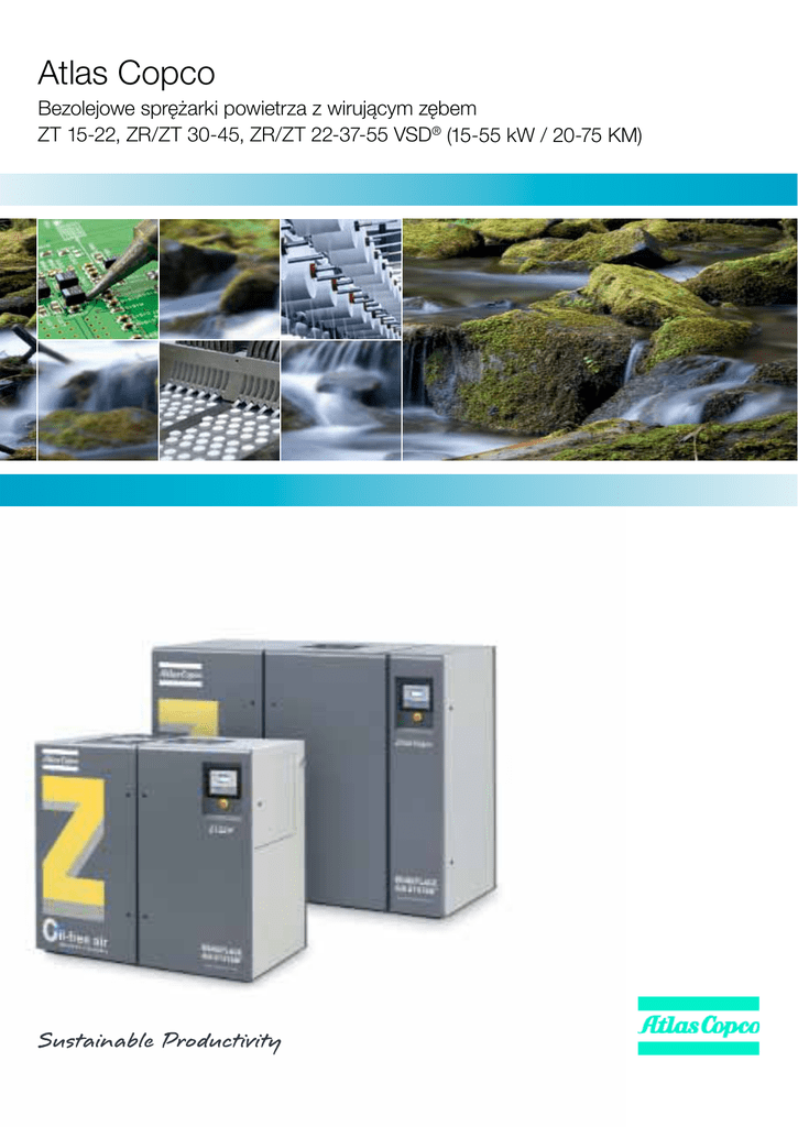 Atlas Copco Bezolejowe sprężarki powietrza z wirującym zębem ZT 15-22, ZR/ZT 30-45, ZR/ZT 22-37-55 VSD® (15-55 kW / 20-75 KM) Najwyższa sprawność, pełna odpowiedzialność Sprawna sieć sprężonego powietrza jest dla zakładu przemysłowego niczym układ krwionośny; stacja sprężania i uzdatniania powietrza to jego serce. Oferta Atlas Copco obejmuje wszystkie elementy niezbędne do ich zbudowania i dostosowania systemu do indywidualnych potrzeb przedsiębiorstwa. Wszystkie produkty Atlas Copco zaprojektowano w taki sposób, Powietrze bezolejowe – wysoka jakość, ekonomiczne rozwiązania Czyste sprężone powietrze bez domieszek oleju jest warunkiem koniecznym do utrzymania stałości i wysokiej jakości wielu procesów produkcyjnych. Od wielu lat Atlas Copco jest pionierem w rozwoju technologii wytwarzania powietrza bezolejowego osiągając liczne sukcesy w projektowaniu i produkcji sprężarek przeznaczonych do wytwarzania powietrza całkowicie wolnego od domieszek oleju. Sprężarki ZR/ZT, przeznaczone do zastosowań wymagających najwyższej jakości sprężonego powietrza, całkowicie eliminują niebezpieczeństwo zanieczyszczenia olejem i ponoszenia wynikających z tego dodatkowych kosztów. Wytwarzanie powietrza w 100% bezolejowego pozwala na obniżenie kosztów operacyjnych i kosztów obsługi technicznej przy zachowaniu parametrów pracy wymaganych od sprężarek posiadających certyfikat KLASY 0. aby można było je łatwo konfigurować zapewniając najwyższą niezawodność i sprawność energetyczną. Dzięki temu Atlas Copco jest w stanie przejąć od swoich Klientów pełną odpowiedzialność za całą ich infrastrukturę związaną z wytwarzaniem tego medium, dając gwarancję obsługi najwyższej jakości. Obecność w ponad 150 krajach pozwala nam oferować najlepszy serwis i proponować rozwiązania ukierunkowane na stałą poprawę, kluczowych z punktu widzenia ciągłości procesu produkcyjnego, parametrów. 100-letnia tradycja lidera w dziedzinie wytwarzania sprężonego powietrza zobowiązuje nas do oferowania rozwiązań o najwyższej jakości i sprawności. W ten sposób realizujemy nasz cel zawarty w haśle „Pierwsza Myśl – Najlepszy Wybór”. Tak pragniemy być postrzegani przez naszych Klientów i na tym koncentrujemy wszystkie nasze działania. Ściśle współpracując z odbiorcami naszych produktów i usług angażujemy się w proponowanie rozwiązań ściśle dopasowanych do ich oczekiwań i do uwarunkowań, w których prowadzą oni swoją działalność. Jesteśmy zaangażowani w podnoszenie wydajności Waszych działań poprzez współdziałanie i innowacje. Pierwsza Myśl – Najlepszy Wybór powietrze w 100% bezolejowe Gwarancja spokojnej pracy Przemysł farmaceutyczny, przemysł spożywczy, elektronika to jedne z wielu dziedzin, w których wymagane jest sprężone powietrze najwyższej jakości, gwarantujące ściśle określoną jakość produktu końcowego i ściśle określony przebieg procesu produkcyjnego. Wyeliminowanie oleju z procesu sprężania to warunek konieczny do wytworzenia sprężonego powietrza w 100% bezolejowego. Sprężarki z wirującym zębem Atlas Copco, zaprojektowane specjalnie do takich zastosowań, wykluczają niebezpieczeństwo zanieczyszczenia powietrza olejem, co mogłoby prowadzić do uszkodzenia produktu końcowego, narażenia na szwank reputacji marki i kosztownych przestojów. Sprężarki ZR/ZT, które otrzymały certyfikat ISO 8573-1 KLASY 0 nadany przez cieszący się uznaniem Instytut TÜV, zapewniają stabilność i niezawodność procesu produkcyjnego, pozwalając jednocześnie na obniżenie kosztów operacyjnych i kosztów obsługi technicznej. Dzięki swojemu doświadczeniu i stałym innowacjom technicznym Atlas Copco od ponad sześćdziesięciu lat jest liderem na rynku w zakresie technologii bezolejowego sprężania powietrza. Nasi Klienci mogą czuć się bezpieczni: każdy produkt poddawany jest drobiazgowej procedurze certyfikacyjnej i testowej, których celem jest zagwarantowanie najwyższej jakości maszyn i urządzeń opuszczających zakład produkcyjny. Szeroka wiedza zdobyta przy projektowaniu i wykonywaniu wielu niezawodnych instalacji sprężonego powietrza sprawia, że Atlas Copco jako jedyny producent oferuje tak szeroki wachlarz technologii, że pozwala on każdorazowo na opracowanie rozwiązania idealnie dopasowanego do indywidualnych oczekiwań i wymagań Klienta. niższy koszt enerGii Koszt energii może stanowić ponad 70% całkowitego kosztu eksploatacji sprężarki (LCC). Najbardziej ekonomiczne rozwiązanie instalacji sprężonego powietrza dopasowuje wartość ciśnienia, wydajność i konieczność zastosowania urządzeń uzdatniających sprężone powietrze do wymagań konkretnego procesu produkcyjnego. Sprężarki ZR/ZT Atlas Copco łączą te wszystkie parametry w jednym urządzeniu umożliwiając oszczędności nawet do 35% całkowitego kosztu energii elektrycznej. Aby pomóc Państwu w uzyskaniu oszczędności energii niezależnie od tego czy korzystają Państwo z dużej czy małej sprężarki nasza seria VSD została rozszerzona o modele ZT 22 VSD i ZR/ZT 55 VSD. Jakość i niezawodność Sprawdzona technologia, maksymalna wydajność Celem działalności Atlas Coco jest wyposażanie naszych Klientów w sprężarki, które spełniają, a nawet przewyższają ich wymagania i oczekiwania. Seria sprężarek ZR/ZT, skonstruowana na bazie wieloletnich doświadczeń w pracy z technologią bezolejową przy wykorzystaniu naszej szerokiej wiedzy i praktyki, stała się liderem w swojej klasie na rynku sprężarek. W czasie projektowania i produkcji sprężarek serii ZR/ZT Atlas Copco wykorzystano wiele zaawansowanych technologii zapewniających najwyższą jakość pracy i pozwalających na wytwarzanie sprężonego powietrza w 100% bezolejowego. Unikalny element sprężający z wirującym zębem podwyższa skuteczność pracy dzięki dwustopniowemu systemowi sprężania