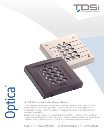 Optica ® Czytnik zbliżeniowy z klawiaturą optyczną Czytnik zdobył tytuł najlepszego produktu kontroli dostępu na targach IfSEC 2004. Optica® to połączenie czytnika zbliżeniowego 125 kHz i klawiatury. Unikatowa klawiatura optyczna nie posiada żadnych części ruchomych narażonych na sabotaż. Klawiatura podświetlana delikatnie niebieskimi diodami LED. Optica® jest również dostępna w twardych obudowach ABS lub w wykonaniu antywandalowym ze stali nierdzewnej (wersja VR). Wszystkie wersje czytnika posiadają standard wyjścia clock & data i Wiegand czyniąc go powszechnym i możliwym do podłączenia do różnych kontrolerów. ALSET | t: +48 (22)6469306 | e: [email protected] | w: www.alset.pl Optica ® AL0011_v 4 ts Unikatowa i innowacyjna klawiatura z optyczną technologią detekcji użycia przycisków. Żadnych ruchomych przycisków. 5002-0390/5002-0391 101 x 101 x 20 mm 210 g (Optica®), 270 g (Optica® VR) -20°C do +55°C, 0 do 95 % wilgotność 10 do 14 VDC, 150 mA max 125 kHz EM4100, EM4102, EM4200 i kompatybilne Zintegrowany z zewn.kontrolą 2 - czerwona i zielona obydwie z niezależną zewn.kontrolą <150 mm z kartą ISO <80 mm z pastylką (Optica®) <80 mm z kartą ISO <30 mm z pastylką (Optica® VR) Mag stripe, 26-bit Wiegand, Serial TTL Poliwęglanowe obudowy w kolorze beżowym i grafitowym. Pozwalają na dostosowanie czytnika do otoczenia. Występuje również w wersji antywandalowej, wykonanej ze stali nierdzewnej, (VR) wersja. Odporny na ataki wandalizmu. Szczelna konstrukcja Zapewnia zwiększoną ochronę przed wnikaniem wody dzięki czemu nadaje się do montażu zarówno wewnątrz jak i na zewnątrz. Zintegrowane LEDy i brzęczyk Dają użytkownikowi akustyczne i wizualne potwierdzenie zczytania karty i statusu dostępu. Powszechny standard wyjść Pozwala na podłączenie do różnych kontrolerów kontroli dostępu . ZAMÓWIENIA, INFORMACJA Produkt numer: 5002-0390 Nazwa: Optica® Można używać w trybie tylko Karta, tylko PIN lub Karta plus PIN. Zwiększa poziom bezpieczeństwa przez dodatkowy PIN. Produkt numer: 5002-0391 Nazwa: Optica® VR (antywandalowa) Programowalne funkcje czytnika Pozwala użytkownikowi dopasować czytnik do osobistych wymagań w zakresie podświetlenia. Niebieskie podświetlenie Przyciski klawiatury podświetlane delikatnie niebieskimi diodami LED. TDSi UK Unit 10 Concept Park, Innovation Close, Poole, Dorset BH12 4QT United Kingdom t: +44 (0)1202 723535 f: +44 (0)1202 724975 e: [email protected] ALSET ul. Wołoska 49 02-583 Warszawa Polska t: +48(22)6469306 e: [email protected] w: www.alset.pl