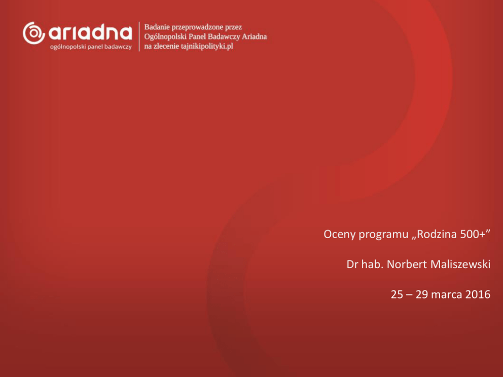 Wizerunki polityków. Zmiana Oceny postrzegania programu „Rodzina 500+” premier KopaczDrpo expose hab. Norbert Maliszewski 25 – 29 marca 2016 1-5 października 2014 roku Jak ogólnie oceniasz program „500 plus”? 63% 30% 39% 24% 20% 10% 7% zdecydowanie negatywnie raczej negatywnie raczej pozytywnie zdecydowanie pozytywnie nie wiem Badanie przeprowadzone na panelu Ariadna. Próba reprezentatywna Polaków w wieku 18 lat i więcej licząca N=1031 osób. Termin realizacji: 12 - 15 marca 2016. Metoda: CAWI. Jak Ci się wydaje – czy program „500 plus” będzie miał pozytywny wpływ na budżet domowy Polaków? 73% 21% 42% 31% 16% 6% 5% zdecydowanie nie raczej nie raczej tak zdecydowanie tak nie wiem Badanie przeprowadzone na panelu Ariadna. Próba reprezentatywna Polaków w wieku 18 lat i więcej licząca N=1031 osób. Termin realizacji: 12 - 15 marca 2016. Metoda: CAWI. Jak Ci się wydaje – czy program „500 plus” będzie miał pozytywny wpływ na budżet domowy Polaków? TAK NIE 94% 73% 67% 21% 4% 66% 16% 50% 46% 24% Pomiar został przeprowadzony w dniach 10-15 lipca 2015 roku metodą CAWI na ogólnopolskiej próbie Polaków liczącej N=1053 osób dobranych z panelu Ariadna. Próba losowo-kwotowa. Kwoty dobrane wg reprezentacji w populacji Polaków w wieku 18 lat i więcej dla płci, wieku, wykształcenia i wielkości miejscowości zamieszkania. Czy Twoim zdaniem program „500 plus” okaże się skuteczny i faktycznie wzrośnie dzietność w polskich rodzinach? 50% 37% 31% 29% 19% 8% zdecydowanie nie raczej nie raczej tak zdecydowanie tak 13% nie wiem Badanie przeprowadzone na panelu Ariadna. Próba reprezentatywna Polaków w wieku 18 lat i więcej licząca N=1031 osób. Termin realizacji: 12 - 15 marca 2016. Metoda: CAWI. Jak Ci się wydaje, na co rodziny przeznaczą pieniądze otrzymane z programu „500 plus”? na żywność i ubrania dla dzieci 49% na potrzeby rodziców 18% na edukację dzieci 15% na alkohol lub inne używki 10% na wakacyjny wypoczynek 3% na rozrywkę 2% na oszczędności 2% inne 1% [odpowiadający: zamierzający głosować] Pomiar został przeprowadzony w dniach 10 – 15 lipca 2015 roku metodą CAWI na ogólnopolskiej próbie Polaków liczącej N=1053 osób dobranych z panelu Ariadna. Próba losowo-kwotowa. Kwoty dobrane wg reprezentacji w populacji Polaków w wieku 18 lat i więcej dla płci, wieku, wykształcenia i wielkości miejscowości zamieszkania. Jak Ci się wydaje – czy program „500 plus” zostanie wdrożony bez zakłóceń, a wypłaty świadczeń będą regularne? 49% 36% 40% 23% 13% 9% zdecydowanie nie raczej nie raczej tak zdecydowanie tak 15% nie wiem Badanie przeprowadzone na panelu Ariadna. Próba reprezentatywna Polaków w wieku 18 lat i więcej licząca N=1031 osób. Termin realizacji: 12 - 15 marca 2016. Metoda: CAWI. Jak Ci się wydaje – czy program „500 plus” zostanie wdrożony bez zakłóceń, a wypłaty świadczeń będą regularne? TAK NIE 70% 49% 36% 20% 35% 51% 41% 57% 31% 31% Pomiar został przeprowadzony w dniach 10-15 lipca 2015 roku metodą CAWI na ogólnopolskiej próbie Polaków liczącej N=1053 osób dobranych z panelu Ariadna. Próba losowo-kwotowa. Kwoty dobrane wg reprezentacji w populacji Polaków w wieku 18 lat i więcej dla płci, wieku, wykształcenia i wielkości miejscowości zamieszkania. Jak ogólnie oceniasz wprowadzony przez rząd Zjednoczonej Prawicy program wsparcia rodzin „500 plus”? 70% Wybory 2015 Wprowadzenie programu +13% 63% 62% 60% 53% 50% 40% 40% 47% 49% 41% 41% -13% 30% 30% 28% 20% 10% 0% zmiany od: 19-21.II.2016 18-21.IX.2015 25-29.III.2016 POZYTYWNIE, raczej i zdecydowanie NEGATYWNIE, raczej i zdecydowanie [odpowiadający: zamierzający głosować] Pomiar został przeprowadzony w dniach 10 – 15 lipca 2015 roku metodą CAWI na ogólnopolskiej próbie Polaków liczącej N=1053 osób dobranych z panelu Ariadna. Próba losowo-kwotowa. Kwoty dobrane wg reprezentacji w populacji Polaków w wieku 18 lat i więcej dla płci, wieku, wykształcenia i wielkości miejscowości zamieszkania. Jak ogólnie oceniasz wprowadzony przez rząd Zjednoczonej Prawicy program wsparcia rodzin „500 plus”? 62% 28% 34% 28% 18% 10% 10% zdecydowanie negatywnie raczej negatywnie raczej pozytywnie zdecydowanie pozytywnie nie wiem Badanie przeprowadzone na panelu Ariadna. Próba reprezentatywna Polaków w wieku 18 lat i więcej licząca N=1031 osób. Termin realizacji: 12 - 15 marca 2016. Metoda: CAWI. Jak ogólnie oceniasz wprowadzony przez rząd Zjednoczonej Prawicy program wsparcia rodzin „500 plus”? Pozytywnie Negatywnie 89% 62% 55% 28% 6% 26% 36% 45% 43% 50% Pomiar został przeprowadzony w dniach 10-15 lipca 2015 roku metodą CAWI na ogólnopolskiej próbie Polaków liczącej N=1053 osób dobranych z panelu Ariadna. Próba losowo-kwotowa. Kwoty dobrane wg reprezentacji w populacji Polaków w wieku 18 lat i więcej dla płci, wieku, wykształcenia i wielkości miejscowości zamieszkania. Czy jest Pan/Pani uprawniony/a do skorzystania z programu „500 plus"? 25% Na ile prawdopodobne jest w Twojej ocenie, że będziesz otrzymywać takie świadczenie? 75% 70% TAK NIE 20% Tak Nie 10% Nie wiem Pomiar został przeprowadzony w dniach 26 – 29 lutego 2016 roku metodą CAWI na ogólnopolskiej próbie Polaków liczącej N=1108 osób dobranych z panelu Ariadna. Próba losowo-kwotowa. Kwoty dobrane wg reprezentacji w populacji Polaków w wieku 18 lat i więcej dla płci, wieku, wykształcenia i wielkości miejscowości zamieszkania. Czy Twoim zdaniem program wsparcia „rodzina 500 plus" zachęci polskie rodziny do posiadania dzieci? 44% 42% 27% 26% 18% 15% zdecydowanie nie raczej nie raczej tak zdecydowanie tak 14% nie wiem Badanie przeprowadzone na panelu Ariadna. Próba reprezentatywna Polaków w wieku 18 lat i więcej licząca N=1031 osób. Termin realizacji: 12 - 15 marca 2016. Metoda: CAWI. Czy Twoim zdaniem program wsparcia „rodzina 500 plus" zachęci polskie rodziny do posiadania dzieci? TAK N