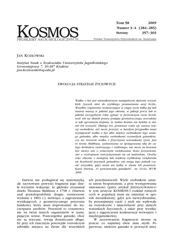 Tom 58 2009 Numer 3–4 (284–285) Strony 357–365 Jan Kozłowski Instytut Nauk o Środowisku Uniwersytetu Jagiellońskiego Gronostajowa 7, 30-387 Kraków [email protected] EWOLUCJA STRATEGII ŻYCIOWYCH Walka o byt jest nieuniknionym następstwem dążenia wszystkich żywych istot do szybkiego pomnażania swej liczby. Wszelkie organizmy wytwarzające w ciągu życia kilka jaj lub nasion muszą w jakimś jego okresie, w jakiejś porze lub w jakimś szczególnym roku zginąć, w przeciwnym razie liczebność ich na skutek prawa postępu geometrycznego wzrosłaby w tak ogromnym stopniu, że żadna kraina nie byłaby w stanie ich wyżywić. Dlatego też, ponieważ rodzi się zawsze więcej osobników, niż może przeżyć, w każdym przypadku musi występować walka o byt albo między osobnikami tego samego gatunku, albo między osobnikami rozmaitych gatunków, czy też wreszcie walka z fizycznymi warunkami życia. Jest to teoria Malthusa, zastosowana ze spotęgowaną siłą do całego królestwa zwierzęcego i roślinnego; nie może tu bowiem być mowy ani o sztucznym zwiększaniu ilości pożywienia, ani o roztropnym wstrzymywaniu się od małżeństw. Choćby więc obecnie z mniejszą lub większą szybkością zwiększała się liczebność pewnych gatunków, nie mogą tego jednak czynić wszystkie, gdyż świat nie byłby w stanie ich pomieścić. Karol Darwin, „O powstawaniu gatunków”, str. 61-62, WUW 2009. Darwin nie posługiwał się matematyką, ale zacytowany powyżej fragment jego dzieła wyraźnie wskazuje, że głęboko zrozumiał dzieło Thomasa Malthusa z 1798 r. (Darwin znał prawdopodobnie drugie, rozszerzone wydanie z 1803 r.), mówiące o zagrożeniach wynikających z geometrycznego przyrostu ludzkości, który musi doprowadzić do wyczerpania zasobów. Przeniósł to rozumowanie na świat innych organizmów w następującym sensie. Poszczególne gatunki, choć nie są wieczne, trwają dostatecznie długo, by przy ich znacznym potencjale rozrodczym zabrakło miejsca na Ziemi dla wszystkich ich przedstawicieli. Wiele osobników umiera zatem bezpotomnie, a przy występowaniu zmienności (patrz artykuł Jerzmanowskiego w tym zeszycie KOSMOSU) rozkład różnych cech w populacji musi się zmieniać w sposób nieunikniony, gdyż jest niewyobrażalne, by przynajmniej część z nich nie wpływała na rozrodczość i śmiertelność przy danych warunkach fizycznych, a także przy wynikającej z zagęszczenia konkurencji wewnątrz- i międzygatunkowej. W zacytowanym fragmencie istotne są jeszcze co najmniej dwie inne myśli. Po pierwsze, niektóre gatunki w pewnych miej- 358 Jan Kozłowski scach mogą wzrastać w liczbę, tyle że nie może to trwać zbyt długo. Po drugie, ginięcie nadmiaru wyprodukowanego potomstwa nie musi odbywać się zawsze i wszędzie z jednakową intensywnością. Wystarczy, by ten nadmiar ginął w jakimś okresie roku, albo tylko co kilka lat. Dziś wiemy dostatecznie wiele o mechanizmach regulacji liczebności, by migrację, zwłaszcza osobników młodych w sytuacji przegęszczenia, uznać za najpotężniejszy i najczęstszy z nich. Młode osobniki, które nie znalazły swego miejsca tam gdzie się urodziły, migrują i ich śmierci nie odnotowujemy. Właśnie ten mechanizm, którego ewolucję wyjaśnił Łomnicki (1988) w swej książce, powoduje, że gdybyśmy zbadali śmiertelność i rozrodczość wielu gatunków w wielu miejscach, wyliczenia wskazywałyby na nieuchronność wzrostu populacji, zgodnie z przewidywaniami Malthusa, natomiast przeciętne zagęszczenie organizmów w rzeczywistości nie zmieniałoby się. Ten rozziew pomiędzy oczekiwanym geometrycznym wzrostem zagęszczenia i obserwowanym brakiem wzrostu jest właśnie siłą napędową ewolucji każdej cechy, a zwłaszcza cech związanych z tzw. historiami życiowymi, zwanymi też strategiami życiowymi. Cechy takie to między innymi charakter rozmnażania – raz w ciągu życia, co rok, wiele razy w ciągu roku, w sposób ciągły po osiągnięciu dojrzałości, a także tempo starzenia, wiek i rozmiar przy dojrzewaniu, intensywność rośnięcia (lub jego brak) po dojrzewaniu, produkowanie małej liczby dużych jaj lub dużej liczby małych jaj, itp. MIARA DOSTOSOWANIA Jeśli jakaś wartość dowolnej cechy, na przykład ciemna barwa ćmy na terenach zanieczyszczonych pozbawionych porostów, ma wyższe dostosowanie niż wartość alternatywna, na przykład barwa jasna, to w kolejnych pokoleniach będzie ona coraz częściej występowała. Można to wykazać metodami klasycznej genetyki populacji (patrz artykuł Łomnickiego „Dobór naturalny” w tym zeszycie KOSMOSU). Czy można użyć tych samych metod szukając odpowiedzi na pytanie, czy wyższe dostosowanie mają osobniki dojrzewające w trzecim, a nie czwartym lub drugim roku życia? Odpowiedź jest w zasadzie negatywna. Jak pisze Łomnicki, klasyczna genetyka populacji sprawdza się tam, gdzie nosiciele porównywanych cech nie różnią się czasem trwania pokolenia. Badając ewolucję cech historii życia natrafiamy zatem na pierwszą trudność: z dużym prawdopodobieństwem prawidłowo zdefiniowany czas trwania pokolenia będzie krótszy u organizmów dojrzewających wcześniej. Druga trudność wynika stąd, że stan populacji — to czy zagęszczenie rośnie, maleje lub nie zmienia się — jest sam w sobie czynnikiem selekcyjnym, na który wrażliwe są przynajmniej niektóre cechy historii życia. Wyobraźmy sobie, że populacja liczy 1 000 osobników rozmnażających się partenogenetycznie tylko raz w życiu, a po 6 latach liczy 4 000 osobników. Wszystkie osobniki rozmnażają się w trzecim roku i każdy daje średnio 10 potomków. Gdyby wszystkie osobniki potomne przeżywały, to populacja wzrosłaby nie czterokrotnie, lecz stukrotnie po 6 latach (10 potomków przypadających na jednego osobnika w pierwszym pokoleniu, 10 × 10 =100 w drugim). Zatem średnio w każdym pokoleniu przeżywa tylko 20% osobnik
