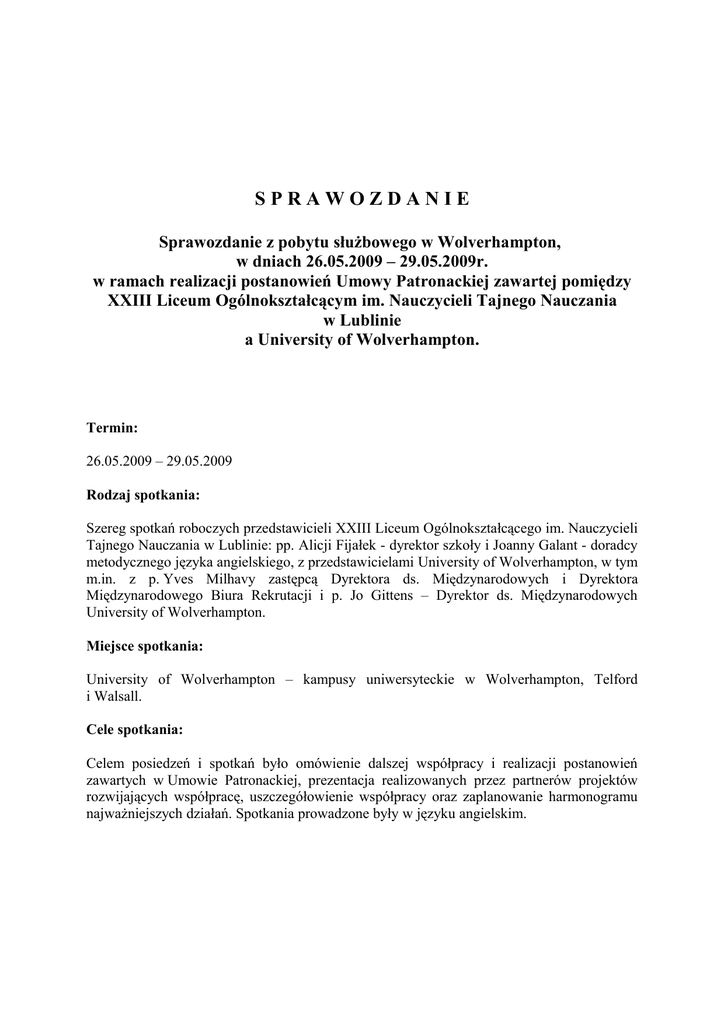SPRAWOZDANIE Sprawozdanie z pobytu służbowego w Wolverhampton, w dniach 26.05.2009 – 29.05.2009r. w ramach realizacji postanowień Umowy Patronackiej zawartej pomiędzy XXIII Liceum Ogólnokształcącym im. Nauczycieli Tajnego Nauczania w Lublinie a University of Wolverhampton. Termin: 26.05.2009 – 29.05.2009 Rodzaj spotkania: Szereg spotkań roboczych przedstawicieli XXIII Liceum Ogólnokształcącego im. Nauczycieli Tajnego Nauczania w Lublinie: pp. Alicji Fijałek - dyrektor szkoły i Joanny Galant - doradcy metodycznego języka angielskiego, z przedstawicielami University of Wolverhampton, w tym m.in. z p. Yves Milhavy zastępcą Dyrektora ds. Międzynarodowych i Dyrektora Międzynarodowego Biura Rekrutacji i p. Jo Gittens – Dyrektor ds. Międzynarodowych University of Wolverhampton. Miejsce spotkania: University of Wolverhampton – kampusy uniwersyteckie w Wolverhampton, Telford i Walsall. Cele spotkania: Celem posiedzeń i spotkań było omówienie dalszej współpracy i realizacji postanowień zawartych w Umowie Patronackiej, prezentacja realizowanych przez partnerów projektów rozwijających współpracę, uszczegółowienie współpracy oraz zaplanowanie harmonogramu najważniejszych działań. Spotkania prowadzone były w języku angielskim. Pierwszy dzień wizyty 26.05.2009. Spotkanie przedstawicieli XXIII Liceum Ogólnokształcącego im. Nauczycieli Tajnego Nauczania w Lublinie - pp. dyrektor Alicji Fijałek i Joanny Galant z p. Yves Milhavy zastępcą Dyrektora ds. Międzynarodowych i Dyrektorem Międzynarodowego Biura Rekrutacji, mające na celu ogólne poznanie zadań statutowych uczelni. Zwiedzanie siedziby władz uczelni, a następnie spotkanie z p. dr Izabelą Radecką wykładowcą na Wydziale Nauk Stosowanych. Zwiedzanie laboratoriów i sal wykładowych na Wydziale Nauk Stosowanych Uniwersytetu Wolverhampton, w głównym kampusie uniwersyteckim w mieście Wolverhampton. Spotkanie z p. Krystyną Nosek wykładowcą na Wydziale Informatyki. Zwiedzanie sal wykładowych i laboratoriów komputerowych, spotkanie z pracownikami wydziału. Wieczorne spotkanie z członkami Klubu Polskiego działającego w Wolverhampton, rozmowa z przedstawicielami Polonii. Drugi dzień wizyty 27.05.2009. Spotkanie z p. Yves Milhavy oraz wizyta w Bibliotece Uniwersytetu Wolverhampton, zapoznanie się z zasobami biblioteki w wersji elektronicznej i w postaci tradycyjnych woluminów, informacja na temat zasad korzystania ze zbiorów oraz systemu elektronicznego wypożyczania i rejestracji pozycji bibliotecznych. Wyjazd do Telford; spotkanie z p. Rose Russel, Support Assisstant, zwiedzanie Wydziału Ekonomii i Zarządzania, sal wykładowych i laboratoriów komputerowych. Spotkanie z p. Jimem Stampsem wykładowcą na Wydziale Inżynierii i Budownictwa, zwiedzanie laboratoriów i sal warsztatowych oraz wykładowych, prezentacja sprzętu wykorzystywanego w trakcie zajęć praktycznych przez studentów. Spotkanie z Małgorzatą M. polską studentką na kierunku mechatronika na Uniwersytecie Wolverhampton. Trzeci dzień wizyty 28.05.2009 Wyjazd do Walsall; wizyta na Wydziale Sportu, Sztuk Użytecznych i Muzyki, spotkanie z asystentką Dziekana tego wydziału p. Jenny Hensman, zwiedzanie laboratoriów do prowadzenia badań sportowych, sal wykładowych, sali gimnastycznej, boisk i kortów do różnorodnych gier i zajęć sportowych oraz studiów muzycznych. Powrót do Wolverhampton; zwiedzanie Wydziału Nauk Humanistycznych, Języków i Nauk Społecznych w głównym kampusie uniwersyteckim w Wolverhampton z p. Tonym ShannonLittle wykładowcą na studiach językowych i lingwistycznych. Spotkanie w głównym kampusie uniwersyteckim w Wolverhampton z p. Jo Gittens, Dyrektor ds. Międzynarodowych oraz p. Yves Milhavy zastępcą Dyrektora ds. Międzynarodowych i Dyrektorem Międzynarodowego Biura Rekrutacji. Dyskusja i wspólne ustalenie zasad dalszej współpracy pomiędzy XXIII Liceum Ogólnokształcącym im. Nauczycieli Tajnego Nauczania w Lublinie a University of Wolverhampton. Spotkanie ze studentami z Polski studiującymi na różnych kierunkach i wydziałach na Uniwersytecie Wolverhampton - dyskusja na różne tematy m.in. dotyczące warunków uzyskania stypendium i pożyczek na studia, zakresu materiału na poszczególnych kierunkach, powodach wyboru tej uczelni zagranicznej, warunkach mieszkania w akademikach uniwersyteckich. Czwarty dzień wizyty 29.05.2009. Pożegnanie z przedstawicielami University of Wolverhampton; wyjazd na lotnisko LondonLuton, wymiana refleksji wyniesionych z wizyty na Uniwersytecie Wolverhampton. Podsumowanie: Spotkanie w ramach Umowy Patronackiej zawartej pomiędzy XXIII Liceum Ogólnokształcącym im. Nauczycieli Tajnego Nauczania w Lublinie a University of Wolverhampton przebiegło zgodnie z programem. Podczas części oficjalnej omówiono wszystkie zagadnienia istotne na obecnym etapie realizacji postanowień Umowy patronackiej. Umożliwi to partnerom dalsze planowanie i organizację działań spełniających wymogi zawarte w Umowie. Spotkanie umożliwiło stronie polskiej, czyli przedstawicielom XXIII Liceum Ogólnokształcącego im. Nauczycieli Tajnego Nauczania w Lublinie nawiązanie bezpośrednich kontaktów z wykładowcami University of Wolverhampton jak również ze studentami z Polski, w tym z absolwentami naszego liceum, kontynuującymi naukę na tym uniwersytecie. Wizyta przedstawicieli liceum umożliwiła dokonanie oceny warunków i możliwości dotyczących studiowania na partnerskiej uczelni dla absolwentów XXIII Liceum Ogólnokształcącego im. Nauczycieli Tajnego Nauczania w Lublinie. Nawiązane rozmowy i dyskusje z pewnością zaowocują w najbliższych miesiącach wymianę informacji i poprawią efektywność współpracy on-line pomiędzy partnerami. Refleksje: Organizacja pracy, warunki lokalowe, wyposażenie laboratoriów, stanowisk nauki dla studentów, dostępność do źródeł wiedzy na University of Wolverhampton są na miarę XXI wieku. S