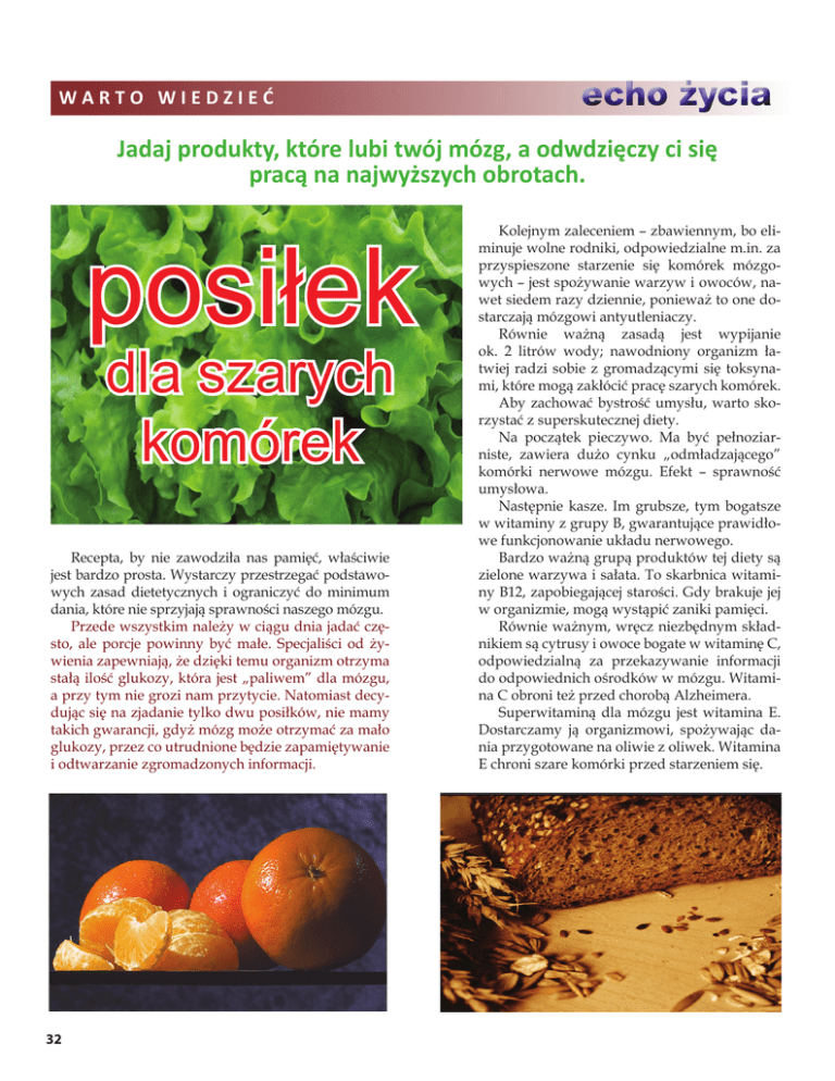 WARTO WIEDZIEĆ echo życia Jadaj produkty, które lubi twój mózg, a odwdzięczy ci się pracą na najwyższych obrotach. posiłek dla szarych komórek Recepta, by nie zawodziła nas pamięć, właściwie jest bardzo prosta. Wystarczy przestrzegać podstawowych zasad dietetycznych i ograniczyć do minimum dania, które nie sprzyjają sprawności naszego mózgu. Przede wszystkim należy w ciągu dnia jadać często, ale porcje powinny być małe. Specjaliści od żywienia zapewniają, że dzięki temu organizm otrzyma stałą ilość glukozy, która jest „paliwem” dla mózgu, a przy tym nie grozi nam przytycie. Natomiast decydując się na zjadanie tylko dwu posiłków, nie mamy takich gwarancji, gdyż mózg może otrzymać za mało glukozy, przez co utrudnione będzie zapamiętywanie i odtwarzanie zgromadzonych informacji. 32 Kolejnym zaleceniem – zbawiennym, bo eliminuje wolne rodniki, odpowiedzialne m.in. za przyspieszone starzenie się komórek mózgowych – jest spożywanie warzyw i owoców, nawet siedem razy dziennie, ponieważ to one dostarczają mózgowi antyutleniaczy. Równie ważną zasadą jest wypijanie ok. 2 litrów wody; nawodniony organizm łatwiej radzi sobie z gromadzącymi się toksynami, które mogą zakłócić pracę szarych komórek. Aby zachować bystrość umysłu, warto skorzystać z superskutecznej diety. Na początek pieczywo. Ma być pełnoziarniste, zawiera dużo cynku „odmładzającego” komórki nerwowe mózgu. Efekt – sprawność umysłowa. Następnie kasze. Im grubsze, tym bogatsze w witaminy z grupy B, gwarantujące prawidłowe funkcjonowanie układu nerwowego. Bardzo ważną grupą produktów tej diety są zielone warzywa i sałata. To skarbnica witaminy B12, zapobiegającej starości. Gdy brakuje jej w organizmie, mogą wystąpić zaniki pamięci. Równie ważnym, wręcz niezbędnym składnikiem są cytrusy i owoce bogate w witaminę C, odpowiedzialną za przekazywanie informacji do odpowiednich ośrodków w mózgu. Witamina C obroni też przed chorobą Alzheimera. Superwitaminą dla mózgu jest witamina E. Dostarczamy ją organizmowi, spożywając dania przygotowane na oliwie z oliwek. Witamina E chroni szare komórki przed starzeniem się. echo życia Natomiast w olejach roślinnych jest lecytyna, która bierze udział w tworzeniu neuroprzekaźników. Ponadto lecytyna zapobiega odkładaniu się cholesterolu w żyłach, co może zakłócać pracę mózgu. Nie może w tej superdiecie zabraknąć łososia. Dostarcza nam niacynę i witaminę D, mające wpływ na poprawę pracy komórek nerwowych, dzięki czemu mózg szybciej przetwarza informacje. I jeszcze orzechy. Codzienna mała porcja sprzyja regulacji poziomu cholesterolu we krwi. A to chroni nas przed miażdżycą i… sklerozą. Co nie sprzyja pracy mózgu? Samych „pyszności” jest sporo, m.in. ciasta z kremem. Na krótko poprawiają samopoczucie. Podnosząc poziom hormonu szczęścia „oszukują” mózg, a organizm domaga się kolejnej dawki słodyczy. Frytki i hamburgery – smakują wszystkim, choć zawierają mnóstwo tłuszczu i kalorii. Tłuszcz odkłada się w naczyniach krwionośnych, także tych prowadzących do mózgu! Tłuste mięso wieprzowe „przebogate” w nasycone kwasy tłuszczowe – to źródło niezdrowego cholesterolu. Objadając się tłustą szyneczką czy boczkiem, do tego wędzonym, nie pamiętamy, że fundujemy sobie masę problemów, również trawiennych. A skoro tłusto to i słono! Tymczasem nadmiar soli, według wielu dietetyków, sprzyja powstawaniu nadciśnienia, co również ma wpływ na pracę szarych komórek. Jeśli sami jeszcze nie wpadamy w „czarną dziurę niepamięci”, to znamy z otoczenia sytuacje, gdy np. dziadek, lub leciwa ciocia miotają się po domu WARTO WIEDZIEĆ w poszukiwaniu okularów, kluczy, portmonetki… - Położone przed chwilą, a zniknęły – głowi się starsza osoba. - A może to było wczoraj… chociaż nie pamiętam, czy wczoraj to nie było w ubiegłym tygodniu… Autor: Lus Foto: deviant ART 33