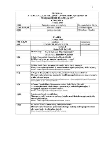 1 PROGRAM XVII SYMPOZJUM SEKCJI ORTOPEDII DZIECIĘCEJ PTOi Tr MIĘDZYZDROJE 24-26 MAJA 2007 CZWARTEK 24 maja 2007 Zakwaterowanie uczestników Recepcja hotelu Slavia 15,00 17,00 do 19,00 Zebranie zarządu Sala telewizyjna Ognisko na plaży Obok bazy rybackiej 20,00 7,00 do 8,30 9,00 9,20 PIĄTEK 25 maja 2007 śniadanie OTWARCIE SYMPOZJUM SESJA I Godz. 9,20 do 11,00 Prowadzący: Prof.dr hab.med. Marek Synder Dr hab.med. Jarosław Czubak restauracja sala obrad 1)Błażej Pruszczyński, Marek Synder, Marcin Sibiński DDH wciąż bywa nie leczona – postęp czy regres? Klinika Ortopedii i Ortopedii Dziecięcej Uniwersytetu Medycznego w Łodzi 9,30 2) Milud Shadi, Paweł Koczewski, Aleksander Koch, Marek Napiontek Plastyka stropu wg Staheli w leczeniu defektu pokrycia głowy kości udowej Katedra i Klinika Ortopedii i Traumatologii Dziecięcej AM w Poznaniu 9,40 3)Wojciech Zasacki, Marcin Tyrakowski, Jarosław Czubak, Szymon Pietrzak Ocena wyników leczenia następstw ciężkiego zapalenia stawu biodrowego w wieku niemowlęcym. Klinika Ortopedii Centrum Medycznego Kształcenia Podyplomowego w Warszawie Oddział Ortopedii i Traumatologii Dziecięcej SPSK im. prof. A. Grucy w Otwocku 9,50 4)Tomasz Piontek, Kinga Ciemniewska, Andrzej Szulc, Maciej Głowacki Artroskopia stawu biodrowego – prezentacja techniki operacyjnej i wstępnych wyników leczenia u dzieci Katedra i Klinika Ortopedii i Traumatologii Dziecięcej w Poznaniu 10,00 5)Aleksander Szwed, Maciej Kołban Wczesne wyniki leczenia wrodzonych deformacji końsko-szpotawych stóp metodą Ponsetiego. Katedra i Klinika Ortopedii i Traumatologii Dziecięcej PAM, Szczecin 10,10 6)Chilarski Marek, Kołban Maciej, Chmielnicki Michał Ocena wyników leczenia palucha koślawego metodą podwójnej osteotomii pierwszej kości śródstopia u dzieci. Klinika Ortopedii i Traumatologii Dziecięcej PAM w Szczecinie 2 10,20 7)Grzegorz Kandzierski, Jarosław Kałakucki, Anna Wójcik, Michał Kalita Chrząstki wzrostowe końców stawowych kości u dzieci; następstwa artorodez kości stępu. Katedra i Klinika Ortopedii i Rehabilitacji Dziecięcej AM w Lublinie 10,30 8)Andrzej Sionek, Szymon Pietrzak, Jarosław Czubak, Waldemar Przybysz, Bartłomiej Grabowski, Paweł Polaczek, Witold Sikorski Ocena porównawcza gojenia się ran pooperacyjnych po leczeniu operacyjnym neurogennych deformacji stóp u dzieci z przepukliną oponowo-rdzeniową, oraz u dzieci z wrodzoną stopą końsko-szpotawą. Oddział Ortopedii i Traumatologii Dziecięcej Kliniki Ortopedii CMKP w Warszawie SPSK im. prof. A. Grucy w Otwocku 10,40 11,00 Prowadzący: 11,20 DYSKUSJA PRZERWA KAWOWA SESJA II Godz. 11,20 do 12,50 Dr hab.med. Sławomir Snela Dr hab.med. Maciej Kołban kawiarnia , hol sala obrad 9)Janusz Popko, Sławomir Olszewski Obrażenia kręgosłupa u dzieci i młodzieży. Klinika Ortopedii i Traumatologii Dziecięcej AM w Białymstoku. 11,30 10)Waldemar Przybysz, Jarosław Czubak, Andrzej Sionek, Szymon Pietrzak, Wojciech Zasacki Infekcyjne nieswoiste i swoiste zaplenia kręgosłupa i krążka międzykręgowego u dzieci i dorastających. Klinika Ortopedii i Traumatologii Centrum Medycznego Kształcenia Podyplomowego SPSK im A.Grucy w Otwocku 11,40 11)Maciej Kołban , Ina Bałachowska-Kościołek , Sławomir Zacha, Michał Chmielnicki Zastosowanie rekombinowanego czynnika krzepnięcia VIIa u pacjentów z operacyjną korekcja skoliozy metoda C-D z resekcją garbu żebrowego i usztywnieniem tylnym. Klinika Ortopedii i Traumatologii Dziecięcej PAM w Szczecinie 11,50 12)Kinga Ciemniewska-Gorzela, Maciej Głowacki, Andrzej Szulc, Tomasz Piontek Autotransfuzja w korekcji skoliozy idiopatycznej z dostępu tylnego ze stabilizacją systemem CD i resekcją garbu żebrowego Katedra i Klinika Ortopedii i Traumatologii Dziecięcej w Poznaniu 12,00 13)Sławomir Snela, Ryszard Bielak, Bogusław Rydzak Selektywna tylna instrumentacja w leczeniu skolioz idiopatycznych Oddział Ortopedii i Traumatologii Dziecięcej Szpitala Wojewódzkiego Nr 2 w Rzeszowie 12,10 14)Michał Latalski, Marek Fatyga, Wojciech Konera, Tomasz Raganowicz, Andrzej Gregosiewicz, Adnan Bacher, Zbigniew Kiełbasa Nowe możliwości leczenia skolioz wczesnodziecięcych z użyciem pionowego rozsuwalnego żebra tytanowego. Klinika Ortopedii Dziecięcej AM w Lublinie 12,20 15)Tomasz Kotwicki, Andrzej Szulc Prospektywne badania nad wynikami leczenia skolioz z użyciem internetowej bazy danych Katedra i Klinika Ortopedii i Traumatologii Dziecięcej Uniwersytetu Medycznego w Poznaniu 12,30 DYSKUSJA 3 12,50 do 13,10 Prowadzący: 13,10 PRZERWA KAWOWA SESJA III Godz. 13,10 do 14,20 Prof.dr hab.med. Janusz Popko Dr hab.med. Jan Królewski kawiarnia , hol sala obrad 16)Marcin Sibiński 1, Marek Synder 1, David A. Sherlock 2, Timothy E. Hems 3 Wyniki rekonstrukcji stawu barkowego u dzieci z okołoporodowym porażeniem splotu barkowego. 1 Klinka Ortopedii i Ortopedii Dzięciej Uniwersytetu Medycznego w Łodzi, Polska 2 Royal Hospital for Sick Children, Department of Orthopaedics, Glasgow, Scotland 3 Victoria Infirmary, Department of Orthopaedic Surgery, Glasgow, Scotland 13,20 17)P. Miśkiewicz, J. Klempous, J. Godziński 28 lat leczenia chirurgicznego okołoporodowego porażenia splotu ramiennego we Wrocławiu. Oddział Chirurgii Dziecięcej DSSim.T.Marciniaka we Wrocławiu 13,30 18)Hanna Kocoń, Michał Kabacyj, Marcin Zgoda Technika małoinwazyjna w leczeniu klatki piersiowej lejkowatej. Katedra i Klinika Ortopedii i Traumatologii Narządu Ruchu I Wydziału Lekarskiego AM w Warszawie 13,40 19)Maciej Kołban, Sławomir Zacha Ocena radiologiczna wyników leczenia klatek piersiowych lejkowatych zmodyfikowaną metodą Nussa. Klinika Ortopedii i Traumatologii Dziecięcej PAM w Szczecinie 13,50 20)W. Nowacki, J. Kruczyński, J. Futyma, P. Stencel Wyniki leczenia operacyjnego klatki piersiowej kurzej Katedra i Klinika Ortopedii i Traumatologii CM UMK w Toruniu 14,00 14,20 do 15,20 16,00 do 17,30 DYSKUSJA OBIAD REJS STATKIEM PIRACKIM ZBIÓRKA PR