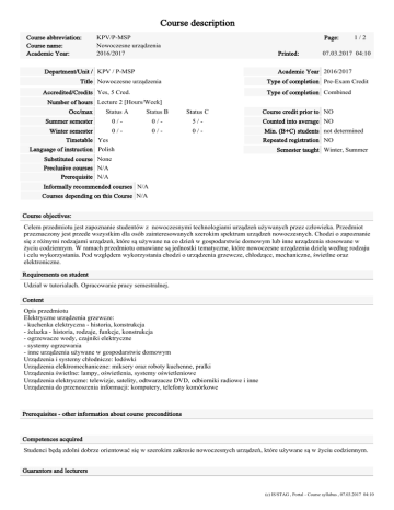 Course description Course abbreviation: Course name: Academic Year: KPV/P-MSP Nowoczesne urządzenia 2016/2017 Page: Printed: Department/Unit / KPV / P-MSP 1/2 07.03.2017 04:10 Academic Year 2016/2017 Title Nowoczesne urządzenia Type of completion Pre-Exam Credit Accredited/Credits Yes, 5 Cred. Type of completion Combined Number of hours Lecture 2 [Hours/Week] Occ/max Status A Status B Status C Course credit prior to NO 0/- 0/- 5/- Counted into average NO Winter semester 0/Timetable Yes Language of instruction Polish 0/- 0/- Min. (B+C) students not determined Repeated registration NO Summer semester Semester taught Winter, Summer Substituted course None Preclusive courses N/A Prerequisite N/A Informally recommended courses N/A Courses depending on this Course N/A Course objectives: Celem przedmiotu jest zapoznanie studentów z nowoczesnymi technologiami urządzeń używanych przez człowieka. Przedmiot przeznaczony jest przede wszystkim dla osób zainteresowanych szerokim spektrum urządzeń nowoczesnych. Chodzi o zapoznanie się z różnymi rodzajami urządzeń, które są używane na co dzień w gospodarstwie domowym lub inne urządzenia stosowane w życiu codziennym. W ramach przedmiotu omawiane są jednostki tematyczne, które nowoczesne urządzenia dzielą według rodzaju i celu wykorzystania. Pod względem wykorzystania chodzi o urządzenia grzewcze, chłodzące, mechaniczne, świetlne oraz elektroniczne. Requirements on student Udział w tutorialach. Opracowanie pracy semestralnej. Content Opis przedmiotu Elektryczne urządzenia grzewcze: - kuchenka elektryczna - historia, konstrukcja - żelazka - historia, rodzaje, funkcje, konstrukcja - ogrzewacze wody, czajniki elektryczne - systemy ogrzewania - inne urządzenia używane w gospodarstwie domowym Urządzenia i systemy chłodnicze: lodówki Urządzenia elektromechaniczne: miksery oraz roboty kuchenne, pralki Urządzenia świetlne: lampy, oświetlenia, systemy oświetleniowe Urządzenia elektryczne: telewizje, satelity, odtwarzacze DVD, odbiorniki radiowe i inne Urządzenia do przenoszenia informacji: komputery, telefony komórkowe Prerequisites - other information about course preconditions Competences acquired Studenci będą zdolni dobrze orientować się w szerokim zakresie nowoczesnych urządzeń, które używane są w życiu codziennym. Guarantors and lecturers (c) IS/STAG , Portal - Course syllabus , 07.03.2017 04:10 Page: • Guarantors: • Lecturer: 2/2 doc. Ing. Ladislav Rudolf, Ph.D. doc. Ing. Ladislav Rudolf, Ph.D. Literature • Basic: • Basic: • Basic: • Basic: • Basic: Bolkowski, Stanisław. Elektrotechnika. Warszawa: Wydawnictwa Szkolne i Pedagogiczne, 2012. ISBN arszawa: Wydawnic. Hempowicz, Pawel. Elektrotechnika i elektronika dla nieelektryków. Warszawa: Wydawnictwa Naukowo-Techniczne, 2013. ISBN 978-83-63623-64-. ORLOWSKI, Bolesław. Historia techniki polskiej. Radom: Wydawnictwo Naukowe Instytutu Technologii Eksploatacji, 2008. ISBN 978-83-7204-704-5. Zespół autorski. Laboratorium Innowacji-Przewodnik Dobrych Praktyk. Radom: Wydawnictwo Naukowe Instytutu Technologii Eksploatacji, 2008. ISBN 978-83-7204-735-9. SALATA, Elzbieta. Nauczanie problemowe w Edukacji Technicznej. Radom: Zakład Poligraficzny Politechniki Radomskiej, 2010. ISBN 978-83-7351-392-1. Time requirements Activities Homework for lessons Consultation of work with the teacher/tutor (incl. electronic) Continuous tasks completion (incl. correspondence tasks) Presentation (of works, projects, etc.) Preparation for test Unaided e-learning tasks completion Self-tutoring Semestral work Source stuying Secondary literature studying Hand-out completion for the lesson Being present in classes Total: Time requirements for activity [h] 35 15 15 5 25 30 35 10 20 20 10 26 246 Teaching methods Dialogic (discussion, dialogue, brainstorming) Working with text (coursebook, book) Presentation (static projection) Group and co-operative tutoring Assessment methods Written examination Analysis of student´s activity outcomes (technical fields) Course is included in study programmes: (c) IS/STAG , Portal - Course syllabus , 07.03.2017 04:10