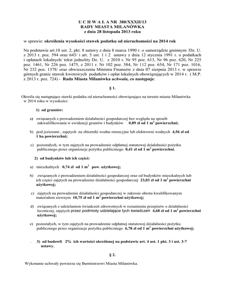 U C H W A Ł A NR 380/XXXII/13 RADY MIASTA MILANÓWKA z dnia 28 listopada 2013 roku w sprawie: określenia wysokości stawek podatku od nieruchomości na 2014 rok Na podstawie art.18 ust. 2, pkt. 8 ustawy z dnia 8 marca 1990 r. o samorządzie gminnym /Dz. U. z 2013 r. poz. 594 oraz 645/ i art. 5 ust. 1 i 2 ustawy z dnia 12 stycznia 1991 r. o podatkach i opłatach lokalnych/ tekst jednolity Dz. U. z 2010 r. Nr 95 poz. 613, Nr 96 poz. 620, Nr 225 poz. 1461, Nr 226 poz. 1475, z 2011 r. Nr 102 poz. 584, Nr 112 poz. 654, Nr 171 poz. 1016, Nr 232 poz. 1378/ oraz obwieszczenia Ministra Finansów z dnia 07 sierpnia 2013 r. w sprawie górnych granic stawek kwotowych podatków i opłat lokalnych obowiązujących w 2014 r. ( M.P. z 2013 r. poz. 724) - Rada Miasta Milanówka uchwala, co następuje: § 1. Określa się następujące stawki podatku od nieruchomości obowiązujące na terenie miasta Milanówka w 2014 roku w wysokości: 1) od gruntów: a) związanych z prowadzeniem działalności gospodarczej bez względu na sposób zakwalifikowania w ewidencji gruntów i budynków 0,89 zł od 1 m2 powierzchni; b) pod jeziorami , zajętych na zbiorniki wodne retencyjne lub elektrowni wodnych 4,56 zł od 1 ha powierzchni; c) pozostałych, w tym zajętych na prowadzenie odpłatnej statutowej działalności pożytku publicznego przez organizacje pożytku publicznego 0,41 zł od 1 m2 powierzchni. 2) od budynków lub ich części: a) mieszkalnych 0,74 zł od 1 m2 pow. użytkowej; b) związanych z prowadzeniem działalności gospodarczej oraz od budynków mieszkalnych lub ich części zajętych na prowadzenie działalności gospodarczej 23,03 zł od 1 m2 powierzchni użytkowej; c) zajętych na prowadzenie działalności gospodarczej w zakresie obrotu kwalifikowanym materiałem siewnym 10,75 zł od 1 m2 powierzchni użytkowej; d) związanych z udzielaniem świadczeń zdrowotnych w rozumieniu przepisów o działalności leczniczej, zajętych przez podmioty udzielające tych świadczeń 4,68 zł od 1 m2 powierzchni użytkowej; e) pozostałych, w tym zajętych na prowadzenie odpłatnej statutowej działalności pożytku publicznego przez organizacje pożytku publicznego 6,78 zł od 1 m2 powierzchni użytkowej; . 3) od budowli 2% ich wartości określonej na podstawie art. 4 ust. 1 pkt. 3 i ust. 3-7 ustawy. § 2. Wykonanie uchwały powierza się Burmistrzowi Miasta Milanówka. § 3. Uchwała wchodzi w życie po upływie 14 dni od dnia ogłoszenia w Dzienniku Urzędowym Województwa Mazowieckiego. . Przewodnicząca Rady Miasta Milanówka mgr Maria Sobczak UZASADNIENIE do uchwały dotyczącej określenia wysokości stawek podatku od nieruchomości na rok 2014 Na podstawie art. 5 ustawy z dnia 12 stycznia 1991 r. o podatkach i opłatach lokalnych Rada Miasta Milanówka w drodze uchwały określa wysokość stawek podatku od nieruchomości obowiązujących w danym roku kalendarzowym. Podstawę do określenia przez Radę stawek podatku od nieruchomości stanowią stawki maksymalne ogłoszone przez Ministra Finansów. Stawki te corocznie ulegają zmianie na następny rok podatkowy w stopniu odpowiadającym wskaźnikowi cen towarów i usług konsumpcyjnych. Wskaźnik cen jest ustalony na podstawie komunikatu Prezesa Głównego Urzędu Statystycznego ogłoszonego w Monitorze Polskim. Zgodnie z komunikatem Prezesa GUS z dnia 15 lipca 2013 r. (M.P. z dnia 25 lipca 2013 r., poz. 595), wskaźnik cen towarów i usług konsumpcyjnych w pierwszym półroczu 2013 r. w stosunku do pierwszego półrocza 2012 r. wyniósł 100,9 (wzrost cen o 0,9 %). Rada Miasta Milanówka nie może uchwalić stawek wyższych od stawek maksymalnych ogłoszonych w obwieszczeniu Ministra Finansów z dnia 07 sierpnia 2013 r. (M.P. z 2013 r. poz. 724). Burmistrz Miasta Milanówka w przedłożonym projekcie uchwały wnioskuje o przyjęcie stawek podatku od nieruchomości w wysokości według następującego zestawienia: Stawka w 2013 r. zł/m2 Stawka w 2014 r. proponowana zł/m2 Stawka maksymalna na 2014 r. zł/m2 Wzrost % 1. od budynków lub ich części: a) mieszkalnych 0,73 0,74 0,74 100,9 b) związanych z prowadzeniem działalności gospodarczej oraz od budynków mieszkalnych lub ich części zajętych na prowadzenie działalności gospodarczej 22,82 23,03 23,03 100,9 c) zajętych na prowadzenie działalności gospodarczej w zakresie obrotu kwalifikowanym materiałem siewnym 10,65 10,75 10,75 100,9 d) zajętych na prowadzenie działalności gospodarczej w zakresie udzielania świadczeń zdrowotnych 4,63 4,68 4,68 100,9 e) pozostałych, w tym zajętych na prowadzenie odpłatnej statutowej działalności pożytku publicznego przez organizacje pożytku publicznego 6,72 6,78 7,73 f) od budowli 2% ich wartości określonej na podstawie art. 4 ust. 1 pkt. 3 i ust. 3-7 ustawy 100,9 Stawka w 2013 r. zł/m2 2. Stawka w 2014 r. proponowana zł/m2 Stawka maksymalna Wzrost na 2014 r. zł/m2 % od gruntów: a) związanych z prowadzeniem działalności gospodarczej bez względu na sposób zakwalifikowania ewidencji gruntów i budynków 0,88 0,89 0,89 100,9 b) pod jeziorami , zajętych na zbiorniki wodne retencyjne lub elektrowni wodnych 4,51 4,56 4,56 100,9 c) pozostałych, w tym zajętych na prowadzenie odpłatnej statutowej działalności pożytku publicznego przez organizacje pożytku publicznego 0,40 0,41 0,46 100,9 Wzrost proponowanych stawek podatku od nieruchomości na rok 2014 w stosunku do roku poprzedniego kształtuje się średnio na poziomie 0,9 %. Odstąpiono od maksymalnych stawek w przypadku budynków pozostałych oraz gruntów pozostałych. Przyjęcie stawek maksymalnych byłoby zbyt dużym obciążeniem finansowym dla mieszkańców Milanówka.