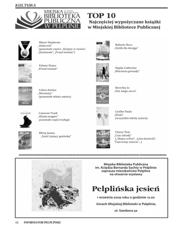 KULTURA TOP 10 Najczęściej wypożyczane książki w Miejskiej Bibliotece Publicznej Meyer Stephenie „Zmierzch” (pozostałe części: „Księżyc w nowiu”, „Zaćmienie”, „Przed świtem”) Palmar Diana „Przed świtem” Coben Harlan „Niewinny” (pozostałe teksty autora) Canavan Trudi „Gliada magów” pozostałe części trylogii Ellroy James „Sześć tysięcy gotówką” Roberts Nora „Stolik dla dwojga” Hapka Catherine „Marzenia gwiazdy” Beverley Jo „Pan mego serca” Coelho Paulo „Brida” (wszystkie teksty autora) Clancy Tom „Czas zdrady” („Wojna orłów”, „Linia kontroli”, ”Czerwony sztorm”…) Miejska Biblioteka Publiczna im. Księdza Bernarda Sychty w Pelplinie zaprasza mieszkańców Pelplina na otwarcie wystawy Pelplińska jesień 1 września 2009 roku o godzinie 12.00 Gmach Miejskiej Biblioteki w Pelplinie, ul. Sambora 5a 12 INFORMATOR PELPLIŃSKI