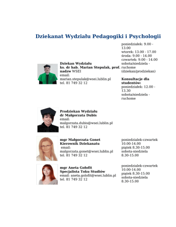 Dziekanat Wydziału Pedagogiki i Psychologii poniedziałek: 9.00 13.00 wtorek: 13.00 - 17.00 środa: 9.00 - 14.00 czwartek: 9.00 - 14.00 Dziekan Wydziału sobota/niedziela ks. dr hab. Marian Stepulak, prof. ruchome nadzw WSEI (dziekan/prodziekan) email: [email protected] Konsultacje dla tel. 81 749 32 12 studentów: poniedziałek: 12.00 13.30 sobota/niedziela ruchome Prodziekan Wydziału dr Małgorzata Dubis email: [email protected] tel. 81 749 32 12 mgr Małgorzata Gonet Kierownik Dziekanatu email: [email protected] tel. 81 749 32 12 poniedzialek-czwartek 10.00-14.00 piątek 8.30-15.00 sobota-niedziela 8.30-15.00 mgr Aneta Gołofit Specjalista Toku Studiów email: [email protected] tel. 81 749 32 12 poniedzialek-czwartek 10.00-14.00 piątek 8.30-15.00 sobota-niedziela 8.30-15.00