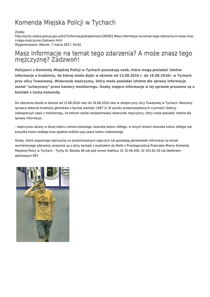 Komenda Miejska Policji w Tychach Źródło: http://tychy.slaska.policja.gov.pl/k27/informacje/wiadomosci/185051,Masz-informacje-na-temat-tego-zdarzenia-A-moze-znas z-tego-mezczyzne-Zadzwon.html Wygenerowano: Wtorek, 7 marca 2017, 04:02 Masz informacje na temat tego zdarzenia? A może znasz tego mężczyznę? Zadzwoń! Policjanci z Komendy Miejskiej Policji w Tychach poszukują osób, które mogą posiadać istotne informacje o kradzieży, do której miało dojść w okresie od 13.08.2016 r. do 16.08.2016r. w Tychach przy ulicy Towarowej. Wizerunek mężczyzny, który może posiadać istotne dla sprawy informacje został "uchwycony" przez kamery monitoringu. Osoby mające informacje w tej sprawie proszone są o kontakt z tyską komendą. Do zdarzenia doszło w okresie od 13.08.2016 roku do 16.08.2016 roku w sklepie przy ulicy Towarowej w Tychach. Nieznany sprawca dokonał kradzieży głośników o łącznej wartości 1697 zł. W wyniku przeprowadzonych czynności śledczy zabezpieczyli zapis z monitoringu, na którym został zarejestrowany wizerunek mężczyzny, który może posiadać istotne dla sprawy informacje. - mężczyzna ubrany w bluzę koloru ciemno-zielonego, koszulkę koloru żółtego, w innych dniach koszulka koloru żółtego lub koszulka koloru białego oraz spodnie krótkie typu jeans koloru niebieskiego. Osoby, które rozpoznają mężczyznę na prezentowanych zdjęciach lub posiadają jakiekolwiek informacje na temat wymienionego zdarzenia, proszone są o pilny kontakt z wydziałem do Walki z Przestępczością Przeciwko Mieniu Komendy Miejskiej Policji w Tychach – Tychy Al. Bielska 46 lub pod numer telefonu 32 32-56-200, 32 325-62-30 lub telefonem alarmowym 997. Ocena: 5/5 (2) Tweetnij