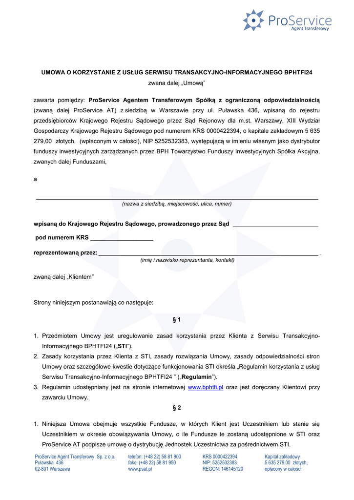 UMOWA O KORZYSTANIE Z USŁUG SERWISU TRANSAKCYJNO-INFORMACYJNEGO BPHTFI24 zwana dalej „Umową” zawarta pomiędzy: ProService Agentem Transferowym Spółką z ograniczoną odpowiedzialnością (zwaną dalej ProService AT) z siedzibą w Warszawie przy ul. Puławska 436, wpisaną do rejestru przedsiębiorców Krajowego Rejestru Sądowego przez Sąd Rejonowy dla m.st. Warszawy, XIII Wydział Gospodarczy Krajowego Rejestru Sądowego pod numerem KRS 0000422394, o kapitale zakładowym 5 635 279,00 złotych, (wpłaconym w całości), NIP 5252532383, występującą w imieniu własnym jako dystrybutor funduszy inwestycyjnych zarządzanych przez BPH Towarzystwo Funduszy Inwestycyjnych Spółka Akcyjna, zwanych dalej Funduszami, a ______________________________________________________________________________________ (nazwa z siedzibą, miejscowość, ulica, numer) wpisaną do Krajowego Rejestru Sądowego, prowadzonego przez Sąd __________________________ pod numerem KRS ___________________ reprezentowaną przez: ___________________________________________________________________ , (imię i nazwisko reprezentanta, kontakt) zwaną dalej „Klientem” Strony niniejszym postanawiają co następuje: §1 1. Przedmiotem Umowy jest uregulowanie zasad korzystania przez Klienta z Serwisu TransakcyjnoInformacyjnego BPHTFI24 („STI”). 2. Zasady korzystania przez Klienta z STI, zasady rozwiązania Umowy, zasady odpowiedzialności stron Umowy oraz szczegółowe kwestie dotyczące funkcjonowania STI określa „Regulamin korzystania z usług Serwisu Transakcyjno-Informacyjnego BPHTFI24 ” („Regulamin”). 3. Regulamin udostępniany jest na stronie internetowej www.bphtfi.pl oraz jest doręczany Klientowi przy zawarciu Umowy. §2 1. Niniejsza Umowa obejmuje wszystkie Fundusze, w których Klient jest Uczestnikiem lub stanie się Uczestnikiem w okresie obowiązywania Umowy, o ile Fundusze te zostaną udostępnione w STI oraz ProService AT podpisze umowę o dystrybucję Jednostek Uczestnictwa za pośrednictwem STI. ProService Agent Transferowy Sp. z o.o. Puławska 436 02-801 Warszawa telefon: (+48 22) 58 81 900 faks: (+48 22) 58 81 950 www.psat.pl KRS 0000422394 NIP: 5252532383 REGON: 146145120 Kapitał zakładowy 5 635 279,00 złotych, opłacony w całości 2. Klient oświadcza, że zapoznał się z postanowieniami statutów Funduszy, prospektów informacyjnych Funduszy, Kluczowych Informacji dla Inwestorów, oraz Tabelami Opłat. 3. Klient stosownie do postanowień Regulaminu zleca ProService AT przyjmowanie i przekazywanie Funduszom za pośrednictwem STI zleceń i dyspozycji wynikających z czynności Klienta dokonywanych w trybie realizacji postanowień Regulaminu, na warunkach przewidzianych postanowieniami Umowy i Regulaminu. 4. W celu umożliwienia Klientowi dostępu do STI, niezbędne jest podanie przez Klienta danych identyfikacyjnych wymaganych na formularzu ,,Dane Klienta”, stanowiącego załącznik do Umowy. 5. Klient oświadcza, iż wyraża zgodę na przekazanie mu informacji na temat ProService Agent Transferowy Sp. z o.o. jako podmiotu świadczącego usługi dystrybucyjne za pośrednictwem strony internetowej www.psat.com.pl/dystrybutor. 6. Klient oświadcza, że wyraża zgodę na przekazywanie mu informacji drogą elektroniczną na adres mailowy wskazany w Załączniku do Umowy. 7. Klient oświadcza, że został poinformowany o prawie odstąpienia od Umowy poprzez złożenie stosownego oświadczenia na piśmie w terminie 14 dni od dnia jej zawarcia oraz otrzymał wzór oświadczenia o odstąpieniu od Umowy. §3 1. Umowa została zawarta na czas nieokreślony. 2. Umowa zostaje zawarta z dniem otrzymania przez ProService AT prawidłowej i podpisanej przez Klienta Umowy, przy czym aktywacja usługi dokonywana jest przez Klienta samodzielnie w Internecie poprzez link aktywacyjny kierujący na spersonalizowaną stronę, na której Klient wprowadza prawidłowy zestaw danych (identyfikator i hasło oraz kod jednorazowy). 3. Przez prawidłową Umowę rozumie się Umowę, która zawiera wszelkie wymagane dla danego Klienta dane i dokumenty określone w Regulaminie oraz Załączniku do Umowy „Dane Klienta”, a także inne, jeśli ich dostarczenia, w uzasadnionych przypadkach, zażąda ProService AT . 4. Wszelkie pojęcia niezdefiniowane w Umowie mają znaczenie nadane im w postanowieniach Regulaminu oraz statutów Funduszy. 5. W sprawach nieuregulowanych w niniejszej Umowie zastosowanie znajdują odpowiednie postanowienia Regulaminu, oraz przepisy obowiązującego prawa. 6. W sprawach dotyczących uczestnictwa w Funduszu mają zastosowanie postanowienia statutu oraz prospektu informacyjnego Funduszu lub odpowiednich przepisów polskiego prawa. §4 1. Wszelkie zmiany niniejszej Umowy, za wyjątkiem zmian Regulaminu, wymagają formy pisemnej pod rygorem nieważności. 2. Strony mogą rozwiązać Umowę na zasadach określonych w Regulaminie. ProService Agent Transferowy Sp. z o.o. Puławska 436 02-801 Warszawa telefon: (+48 22) 58 81 900 faks: (+48 22) 58 81 950 www.psat.pl KRS 0000422394 NIP: 5252532383 REGON: 146145120 Kapitał zakładowy 5 635 279,00 złotych, opłacony w całości §5 1. Załącznikami do Umowy są: a) Formularz Dane Klienta, b) Wzór oświadczenia o odstąpieniu od Umowy, c) Regulamin korzystania z usług Serwisu Transakcyjno-Informacyjnego. 2. Załączniki stanowią integralną część Umowy. 3. Umowa została sporządzona w dwóch jednobrzmiących egzemplarzach, jeden dla ProService AT oraz drugi dla Klienta. .................................................................. Za Uczestnika (data i podpis)* ProService Agent Transferowy Sp. z o.o. Puławska 436 02-801 Warszawa telefon: (+48 22) 58 81 900 faks: (+48 22) 58 81 950 www.psat.pl ............................................................................ Za ProService AT (data, podpis i pieczęć)* KRS 0000422394 NIP: 5252532383 REGON: 146145120 Kapitał zakładowy 5 635 279,00 złotych, opłacony w całości Zał