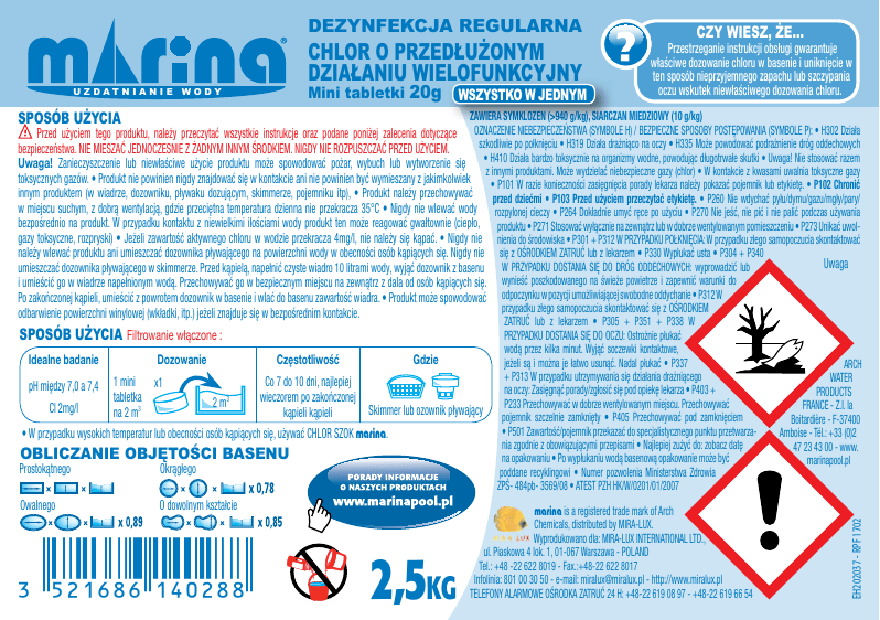 DEZYNFEKCJA REGULARNA CHLOR O PRZEDŁUŻONYM DZIAŁANIU WIELOFUNKCYJNY Mini tabletki 20g UZDATNIANIE WODY SPOSÓB UŻYCIA WSZYSTKO W JEDNYM CZY WIESZ, ŻE... Przestrzeganie instrukcji obsługi gwarantuje właściwe dozowanie chloru w basenie i uniknięcie w ten sposób nieprzyjemnego zapachu lub szczypania oczu wskutek niewłaściwego dozowania chloru. ZAWIERA SYMKLOZEN (>940 g/kg), SIARCZAN MIEDZIOWY (10 g/kg) Przed użyciem tego produktu, należy przeczytać wszystkie instrukcje oraz podane poniżej zalecenia dotyczące OZNACZENIE NIEBEZPIECZEŃSTWA (SYMBOLE H) / BEZPIECZNE SPOSOBY POSTĘPOWANIA (SYMBOLE P): • H302 Działa szkodliwie po połknięciu • H319 Działa drażniąco na oczy • H335 Może powodować podrażnienie dróg oddechowych bezpieczeństwa. NIE MIESZAĆ JEDNOCZESNIE Z ŻADNYM INNYM ŚRODKIEM. NIGDY NIE ROZPUSZCZAĆ PRZED UŻYCIEM. Uwaga! Zanieczyszczenie lub niewłaściwe użycie produktu może spowodować pożar, wybuch lub wytworzenie się • H410 Działa bardzo toksycznie na organizmy wodne, powodując długotrwałe skutki • Uwaga! Nie stosować razem z innymi produktami. Może wydzielać niebezpieczne gazy (chlor) • W kontakcie z kwasami uwalnia toksyczne gazy toksycznych gazów. • Produkt nie powinien nigdy znajdować się w kontakcie ani nie powinien być wymieszany z jakimkolwiek • P101 W razie konieczności zasięgnięcia porady lekarza należy pokazać pojemnik lub etykietę. • P102 Chronić innym produktem (w wiadrze, dozowniku, pływaku dozującym, skimmerze, pojemniku itp), • Produkt należy przechowywać przed dziećmi • P103 Przed użyciem przeczytać etykietę. • P260 Nie wdychać pyłu/dymu/gazu/mgły/pary/ w miejscu suchym, z dobrą wentylacją, gdzie przeciętna temperatura dzienna nie przekracza 35°C • Nigdy nie wlewać wody rozpylonej cieczy • P264 Dokładnie umyć ręce po użyciu • P270 Nie jeść, nie pić i nie palić podczas używania bezpośrednio na produkt. W przypadku kontaktu z niewielkimi ilościami wody produkt ten może reagować gwałtownie (ciepło, produktu • P271 Stosować wyłącznie na zewnątrz lub w dobrze wentylowanym pomieszczeniu • P273 Unikać uwolgazy toksyczne, rozpryski) • Jeżeli zawartość aktywnego chloru w wodzie przekracza 4mg/l, nie należy się kąpać. • Nigdy nie nienia do środowiska • P301 + P312 W PRZYPADKU POŁKNIĘCIA: W przypadku złego samopoczucia skontaktować należy wlewać produktu ani umieszczać dozownika pływającego na powierzchni wody w obecności osób kąpiących się. Nigdy nie się z OŚRODKIEM ZATRUĆ lub z lekarzem • P330 Wypłukać usta • P304 + P340 Uwaga umieszczać dozownika pływającego w skimmerze. Przed kąpielą, napełnić czyste wiadro 10 litrami wody, wyjąć dozownik z basenu W PRZYPADKU DOSTANIA SIĘ DO DRÓG ODDECHOWYCH: wyprowadzić lub i umieścić go w wiadrze napełnionym wodą. Przechowywać go w bezpiecznym miejscu na zewnątrz z dala od osób kąpiących się. wynieść poszkodowanego na świeże powietrze i zapewnić warunki do Po zakończonej kąpieli, umieścić z powrotem dozownik w basenie i wlać do basenu zawartość wiadra. • Produkt może spowodować odpoczynku w pozycji umożliwiającej swobodne oddychanie • P312 W przypadku złego samopoczucia skontaktować się z OŚRODKIEM odbarwienie powierzchni winylowej (wkładki, itp.) jeżeli znajduje się w bezpośrednim kontakcie. Idealne badanie pH między 7,0 a 7,4 Cl 2mg/l Dozowanie 1 mini x1 tabletka na 2 m3 Częstotliwość 2m 3 Gdzie Co 7 do 10 dni, najlepiej wieczorem po zakończonej Skimmer lub ozownik pływający kąpieli kąpieli • W przypadku wysokich temperatur lub obecności osób kąpiących się, używać CHLOR SZOK marina. OBLICZANIE OBJĘTOŚCI BASENU Prostokątnego Okrągłego Owalnego O dowolnym kształcie &:FCLQSG=VYUW]]: 2,5KG ZATRUĆ lub z lekarzem • P305 + P351 + P338 W PRZYPADKU DOSTANIA SIĘ DO OCZU: Ostrożnie płukać wodą przez kilka minut. Wyjąć soczewki kontaktowe, jeżeli są i można je łatwo usunąć. Nadal płukać • P337 + P313 W przypadku utrzymywania się działania drażniącego na oczy: Zasięgnąć porady/zgłosić się pod opiekę lekarza • P403 + P233 Przechowywać w dobrze wentylowanym miejscu. Przechowywać pojemnik szczelnie zamknięty • P405 Przechowywać pod zamknięciem • P501 Zawartość/pojemnik przekazać do specjalistycznego punktu przetwarzania zgodnie z obowiązującymi przepisami • Najlepiej zużyć do: zobacz datę na opakowaniu • Po wypłukaniu wodą basenową opakowanie może być poddane recyklingowi • Numer pozwolenia Ministerstwa Zdrowia ZPŚ- 484pb- 3569/08 • ATEST PZH HK/W/0201/01/2007 marina is a registered trade mark of Arch Chemicals, distributed by MIRA-LUX. Wyprodukowano dla: MIRA-LUX INTERNATIONAL LTD., ul. Piaskowa 4 lok. 1, 01-067 Warszawa - POLAND Tel.: +48 -22 622 8019 - Fax.:+48-22 622 8017 Infolinia: 801 00 30 50 - e-mail: [email protected] - http://www.miralux.pl TELEFONY ALARMOWE OŚRODKA ZATRUĆ 24 H: +48-22 619 08 97 - +48-22 619 66 54 ARCH WATER PRODUCTS FRANCE - Z.I. la Boitardière - F-37400 Amboise - Tél.: +33 (0)2 47 23 43 00 - www. marinapool.pl EH202037 - RPF 1702 SPOSÓB UŻYCIA Filtrowanie włączone :
