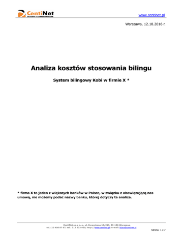 www.centinet.pl Warszawa, 12.10.2016 r. Analiza kosztów stosowania bilingu System bilingowy Kobi w firmie X * * firma X to jeden z większych banków w Polsce, w związku z obowiązującą nas umową, nie możemy podać nazwy banku, której dotyczy ta analiza. CentiNet sp. z o. o., ul. Ceramiczna 18/213, 03-126 Warszawa tel.: 22 408 87 67; tel.: 515 233 930; http://www.centinet.pl; e-mail: [email protected] Strona: 1 z 7 www.centinet.pl Spis treści Wprowadzenie ............................................................................................................. 3 Wymagania funkcjonalne .............................................................................................. 3 Architektura systemu .................................................................................................... 3 Model systemu.................................................................................................................... 4 Realizacja projektu ....................................................................................................... 4 Korzyści z inwestycji ..................................................................................................... 5 Korzyści niewymierne .......................................................................................................... 5 Korzyści finansowe .............................................................................................................. 5 Analiza kosztów............................................................................................................ 6 Koszty inwestycji ................................................................................................................. 6 Oszczędności ...................................................................................................................... 6 Bilans kosztów .................................................................................................................... 6 Porównanie kosztów ............................................................................................................ 7 Ryzyko inwestycji ......................................................................................................... 7 Podsumowanie ............................................................................................................. 7 CentiNet sp. z o. o., ul. Ceramiczna 18/213, 03-126 Warszawa tel.: 22 408 87 67; tel.: 515 233 930; http://www.centinet.pl; e-mail: [email protected] Strona: 2 z 7 www.centinet.pl Wprowadzenie Dokument przedstawia wdrożenie systemu bilingowego u jednego z naszych Klientów oraz korzyści zastosowania bilingu i analizę kosztów inwestycji w tym konkretnym przypadku. Dynamiczny rozwój naszego Klienta wymógł zwiększenie funkcjonalności infrastruktury teleinformatycznej. Wybrane przez bank rozwiązanie oparte o Cisco CallManager’a i centrale AVAYA zapewniają wysoki stopień skalowalności wraz z otwieraniem kolejnych oddziałów. Na początku rozwoju sieci zostało wdrożone oprogramowanie taryfikacyjne Telbaza SQL, jednak poważne ograniczenia tego oprogramowania nie pozwoliły zrealizować wymagań stawianych przed nowoczesnym systemem bilingowym. W związku z powyższym, konieczne stało się zaprojektowanie i wdrożenie rozwiązania bardziej perspektywicznego oraz lepiej spełniającego wymagania funkcjonalne. Wymagania funkcjonalne Rejestrowanie połączeń przychodzących i wychodzących z Cisco CallManager v. 7.1 oraz Avaya CM. Taryfikacja połączeń zgodnie z aktualnymi cennikami operatorów, z uwzględnieniem rabatów. Wykrywanie ruchu na liniach, które powinny być wyłączone, zgodnie z ustawieniami Active Directory. Porównywanie bilingów operatorów z połączeniami zarejestrowanymi przez system abonencki. Raportowanie przez przeglądarkę internetową. Integracja z Active Directory, polegająca na aktualizacji struktury linii wewnętrznych na podstawie struktury bazy LDAP. Automatyczne połączenie z bazą danych Cisco CallManager v. 7.1 oraz pobieranie opisów linii z bazy. Automatyczne generowanie i wysyłanie raportów przez e-mail. Pełna integracja z platformą VMWare. Architektura systemu System został zbudowany w oparciu o własne autorskie oprogramowanie, w skład którego wchodzi: MultiStreamer – aplikacja służąca do pobierania danych CDR z central oraz importu opisów linii z bazy CCM. Kobi – oprogramowanie bilingowe, odpowiedzialne za przetwarzanie zebranych rekordów CDR, taryfikację połączeń, integrację z Active Directory oraz raportowanie. CentiNet sp. z o. o., ul. Ceramiczna 18/213, 03-126 Warszawa tel.: 22 408 87 67; tel.: 515 233 930; http://www.centinet.pl; e-mail: [email protected] Strona: 3 z 7 www.centinet.pl WebReporter – aplikacja umożliwiająca generowanie raportów z wykorzystaniem przeglądarki internetowej. Model systemu Realizacja projektu Realizacja projektu rozpoczęła się w połowie maja 2009. W pierwszym etapie zostało zainstalowane środowisko uruchomieniowe, serwer baz danych oraz serwer www. Kolejne kroki obejmowały instalację i konfigurację poszczególnych części systemu. Wszystkie prace instalacyjno-konfiguracyjne zostały zakończone z końcem lipca 2009, rozesłane zostały wówczas raporty do odbiorców w celu zebrania uwag i opinii. Miesiąc sierpień poświęcony został na testy całego systemu, modyfikacje ustawień oraz porównanie bilingów operatora. W ramach podpisanej umowy zobowiązaliśmy się do opieki serwisowej nad wdrożonym systemem. Serwis realizowany jest wg zasady 24/7/365 – przez całą dobę we wszystkie dni tygodnia i roku. CentiNet sp. z o. o., ul. Ceramiczna 18/213, 03-126 Warszawa tel.: 22 408 87 67; tel.: 515 233 930; http://www.centinet.pl; e-mail: [email protected] Strona: 4 z 7 www.centinet.pl Korzyści z inwestycji Korzyści niewymierne Rozdzielanie kosztów usług telekomunikacyjnych na poszczególne centra kosztowe i pracownik